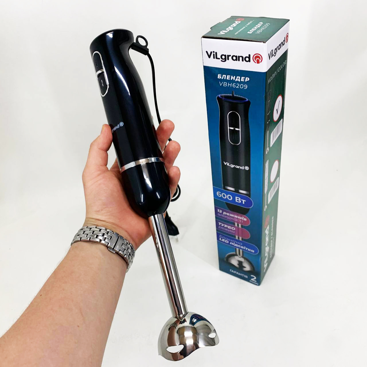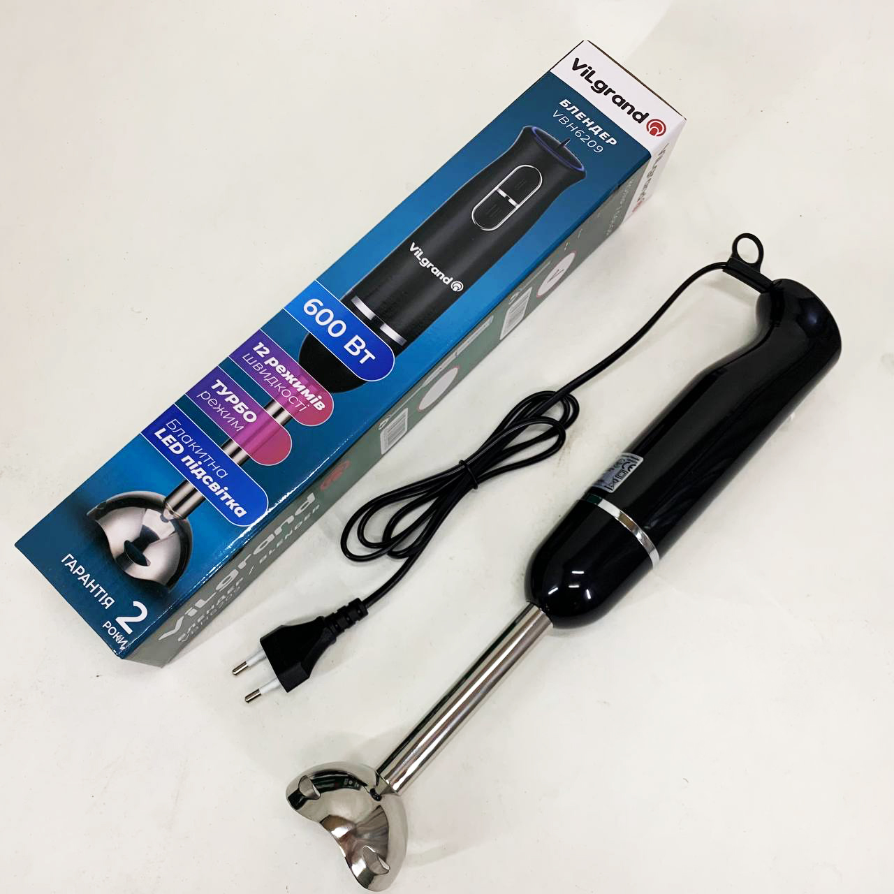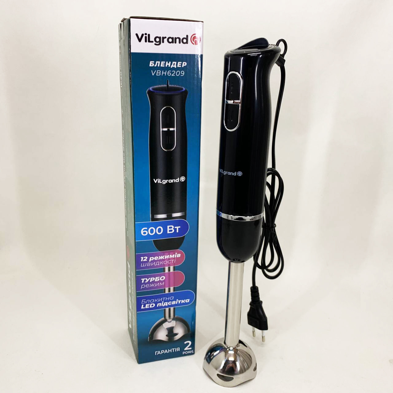 Блендер занурювальний VILGRAND VBH6209 — легко впорається з ручною кухонною роботою і допоможе приготувати різноманітні страви. та стильний дизайн. Очищується після використання і миється. Ножі виконані з високоякісної нержавіючої сталі. 50/60