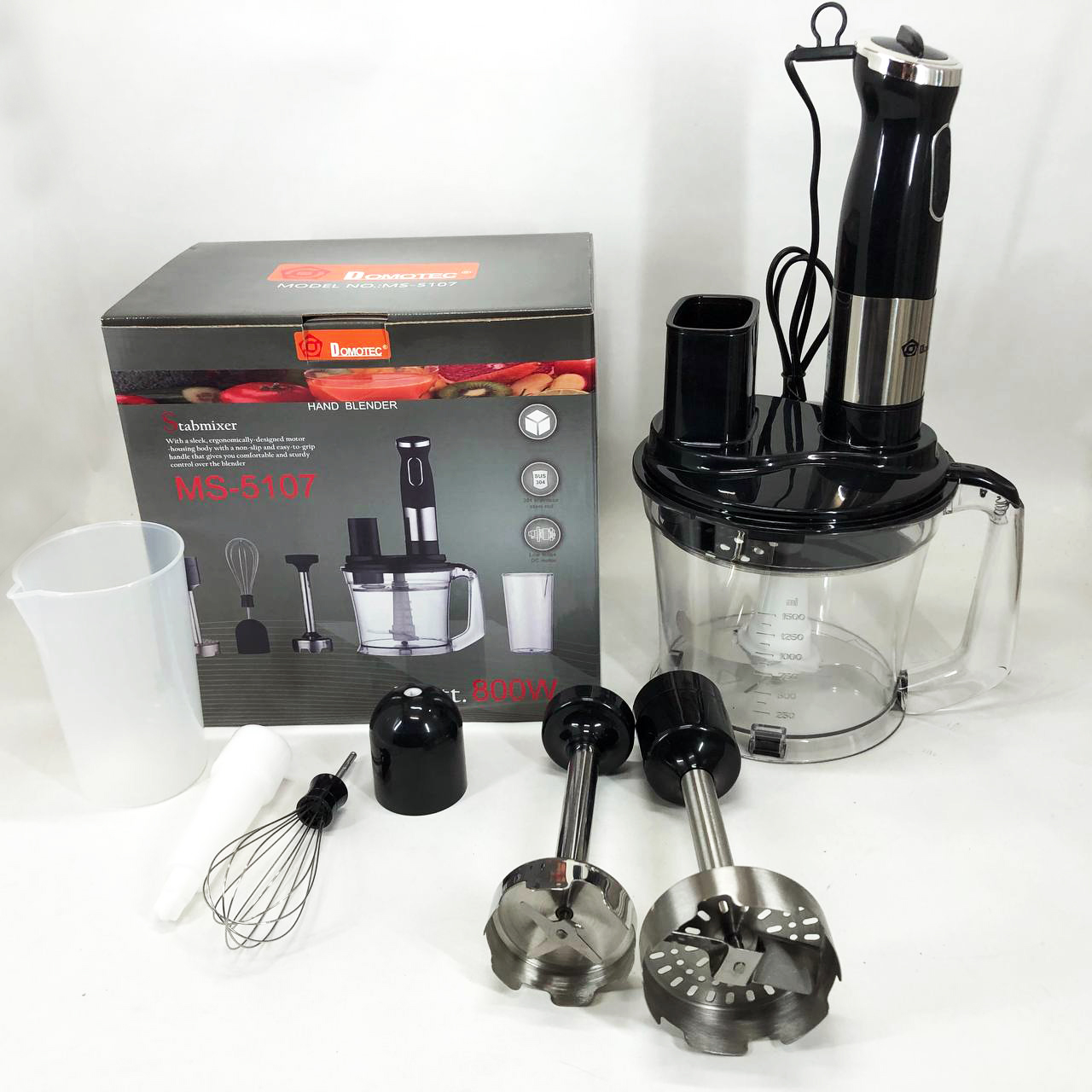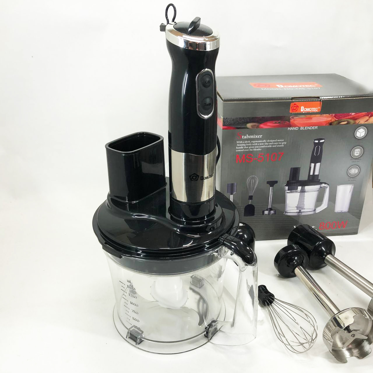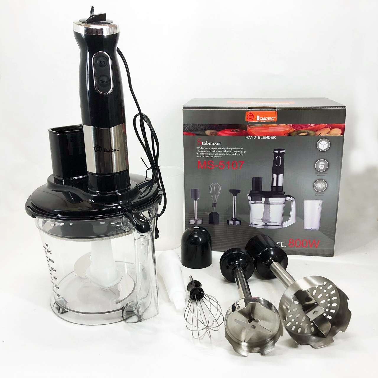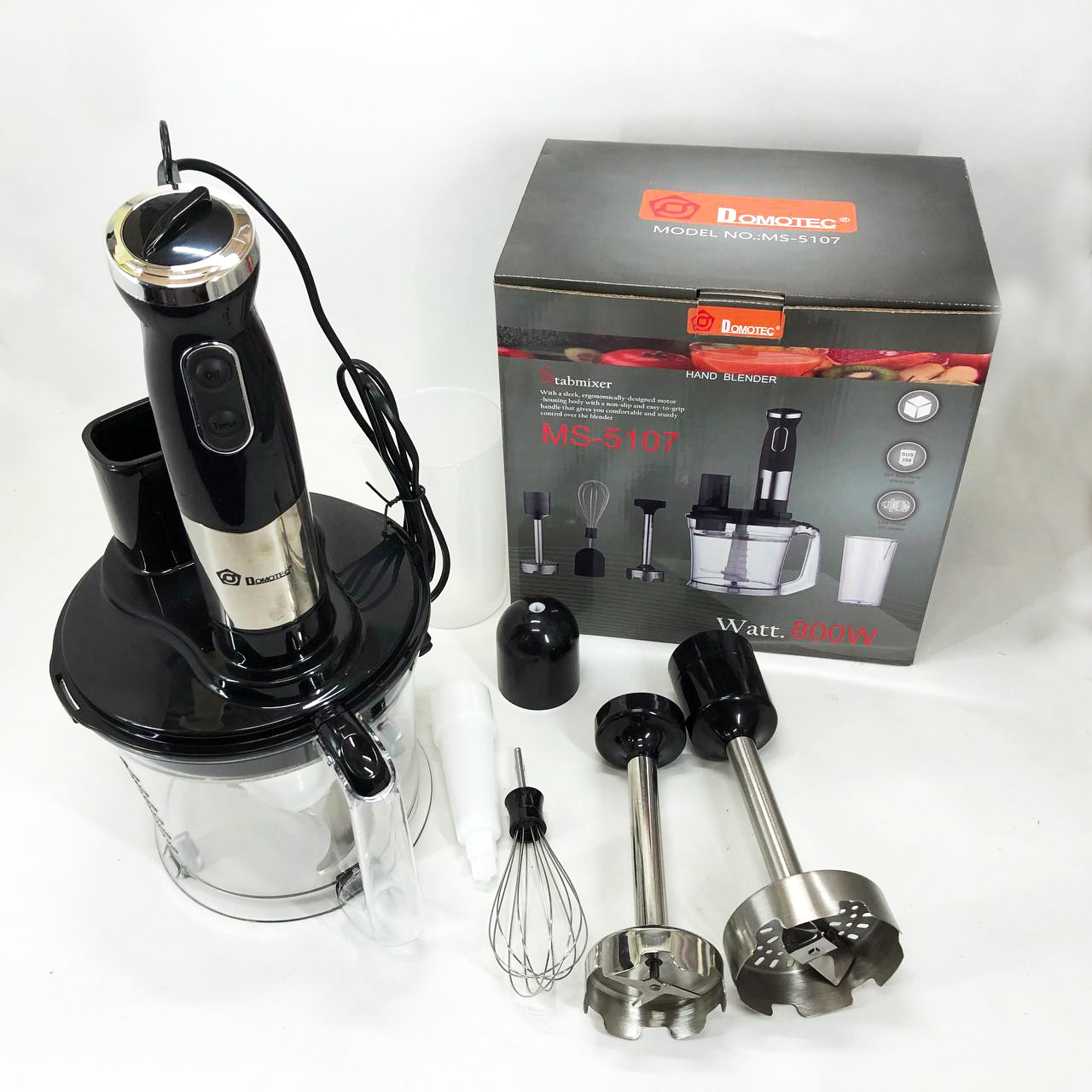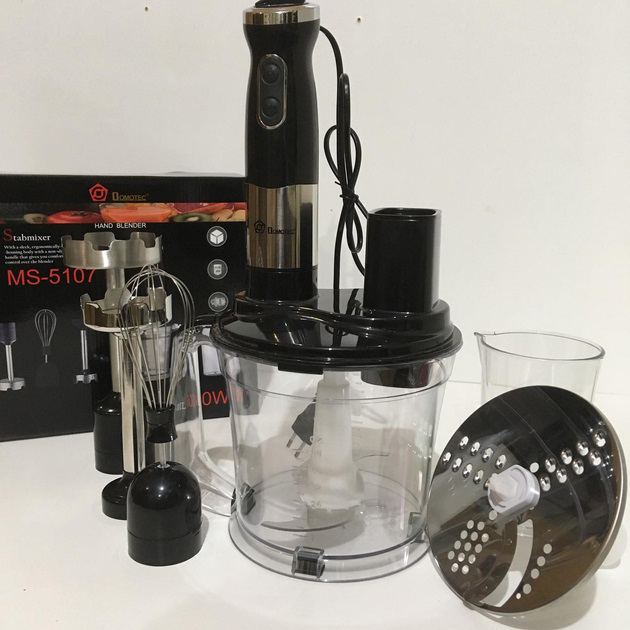 Занурювальний блендер Domotec MS-5107 – це компактний побутовий прилад потужністю 800 Вт, який буде простий у використанні, надійний та безпечний. Модель можна використовувати для подрібнення, змішування та збивання продуктів.