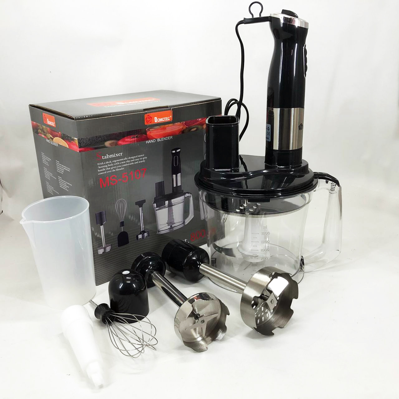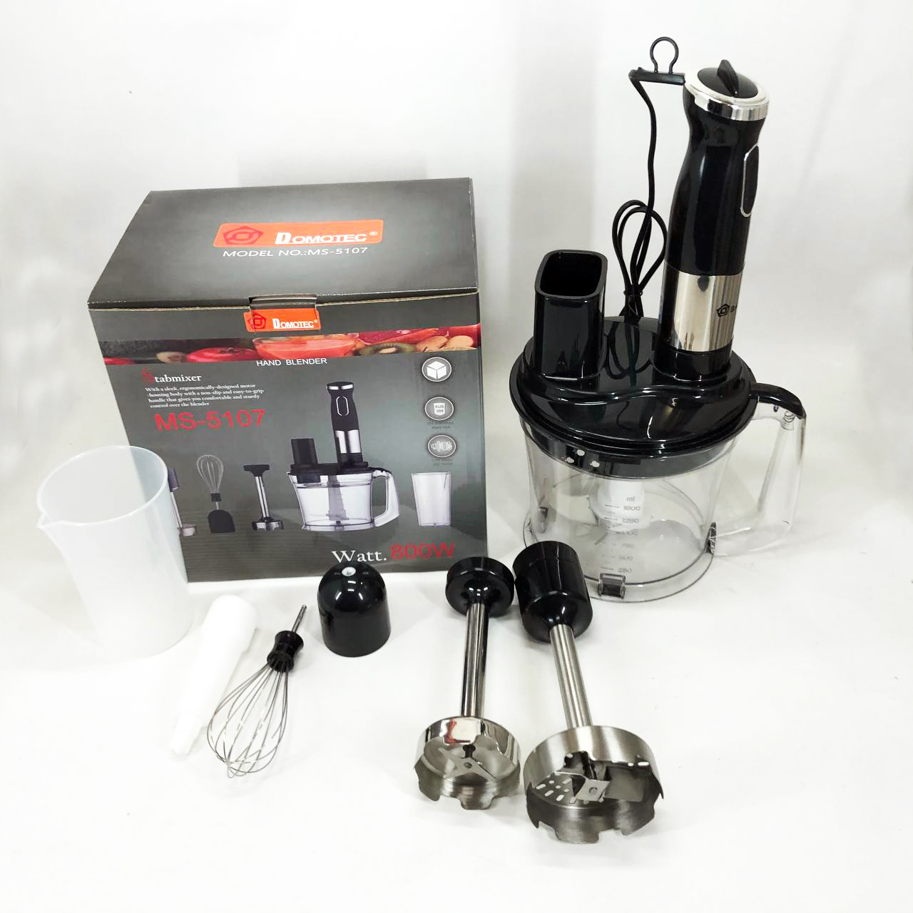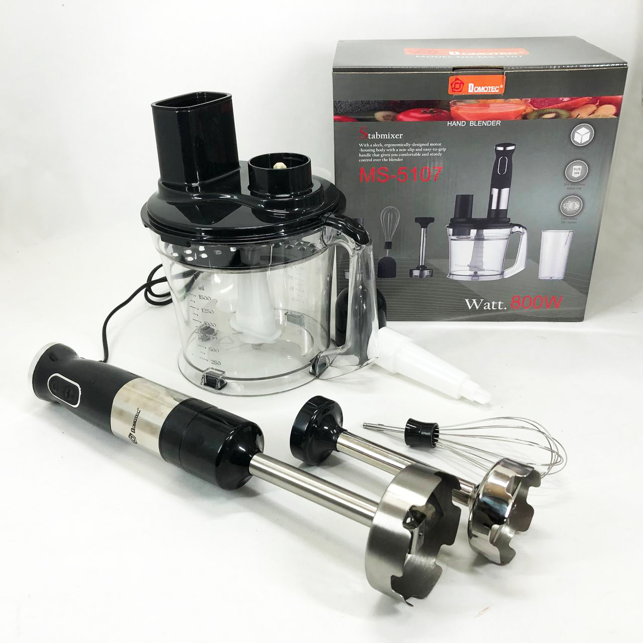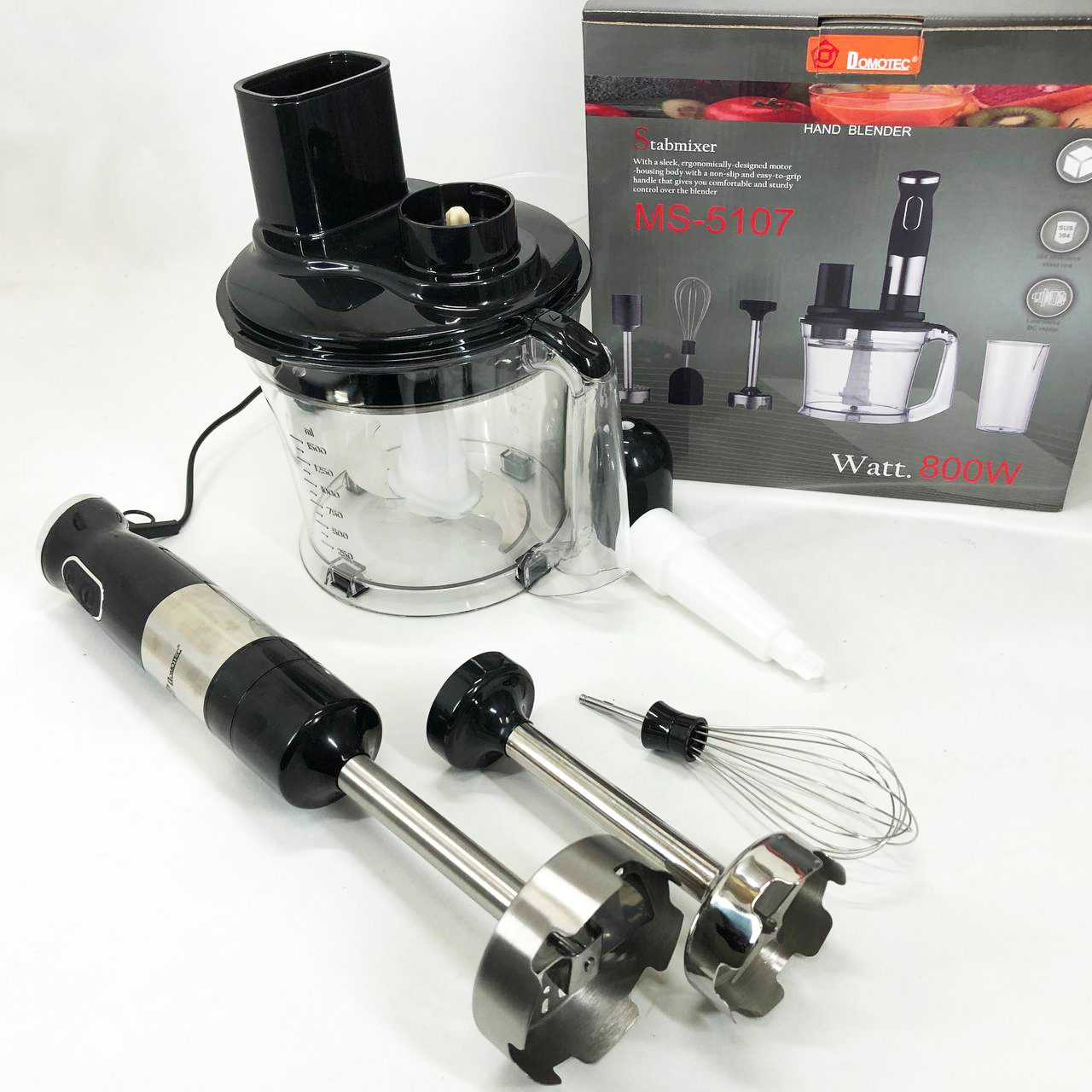 Занурювальний блендер Domotec MS-5107 – це компактний побутовий прилад потужністю 800 Вт, який буде простий у використанні, надійний та безпечний. Модель можна використовувати для подрібнення, змішування та збивання продуктів.
