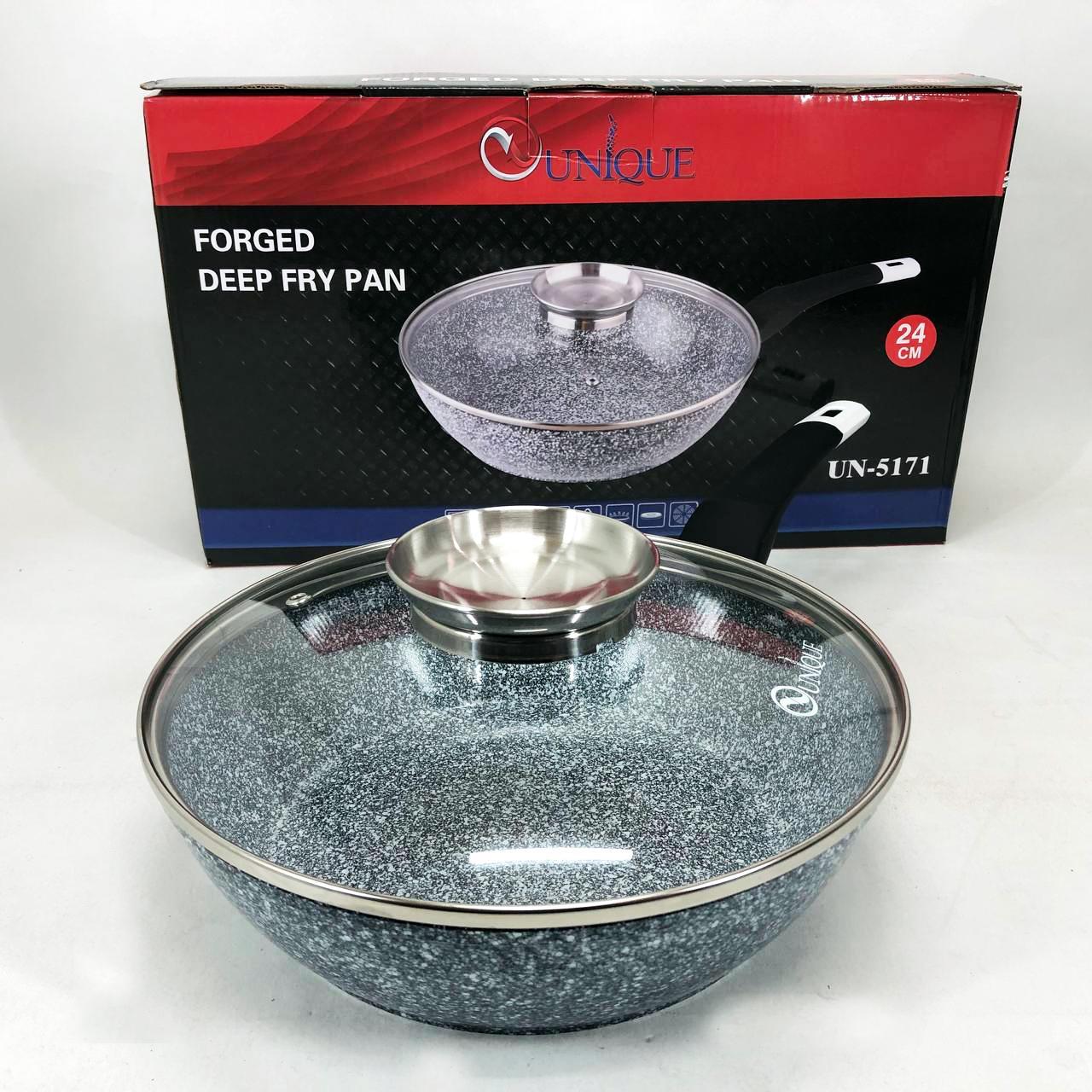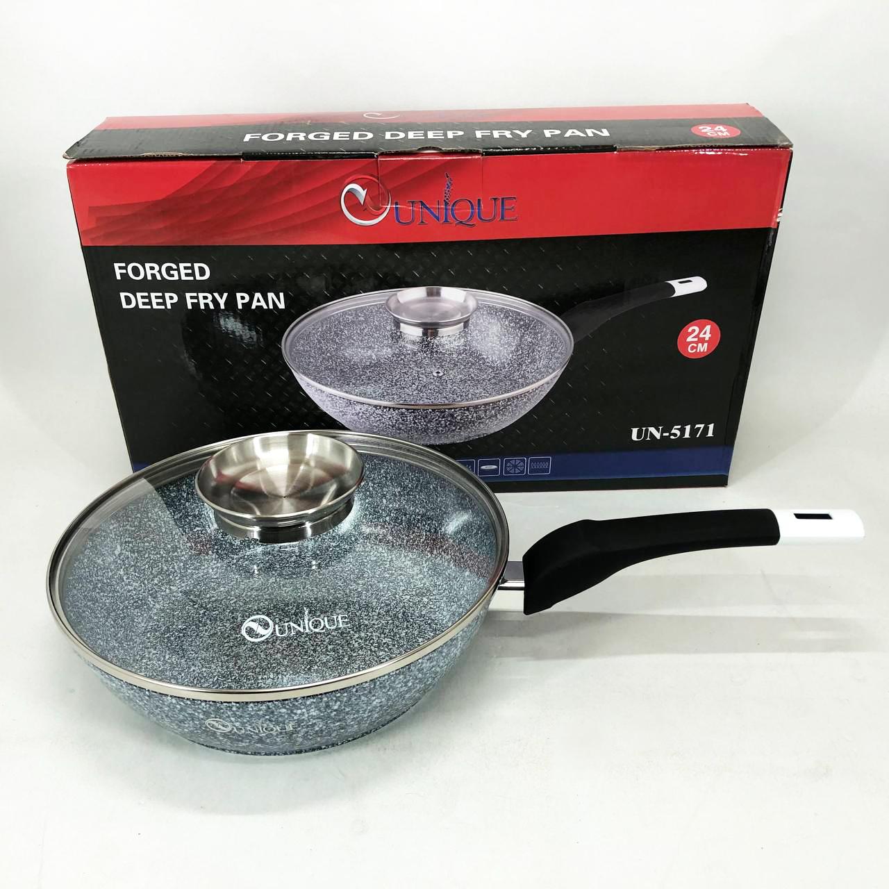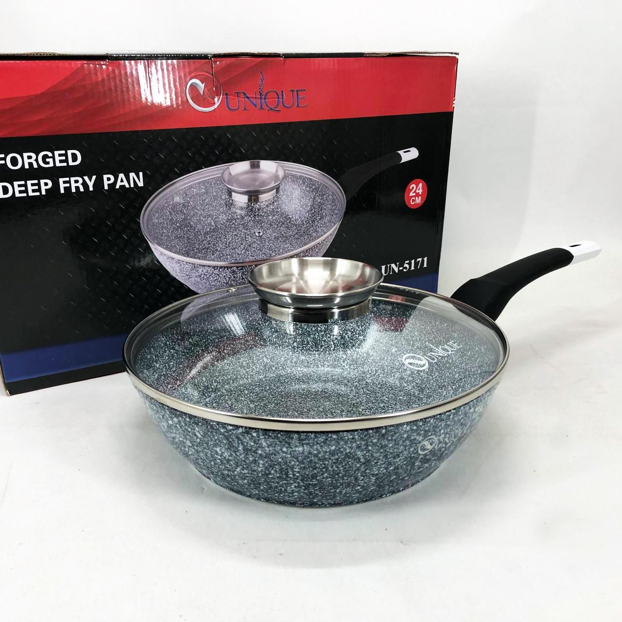 Глибока сковорода-вок UNIQUE UN-5171 діаметром 24 см — це універсальний інструмент для вашої кухні, що поєднує в собі функції класичної сковороди та сотейника. Завдяки високим бортам (11 см) та значному об’єму близько 3 літрів, вона ідеально підходить для створення складних страв, тушкування овочів, приготування м’яса або азійської локшини. Корпус із литого алюмінію оснащений інноваційним гранітним покриттям Granite coating, яке складається з декількох шарів кам’яної крихти. Це дозволяє просмажувати продукти до золотистої хрусткої скоринки з мінімальним використанням олії, зберігаючи максимальну поживну цінність і природний смак інгредієнтів.