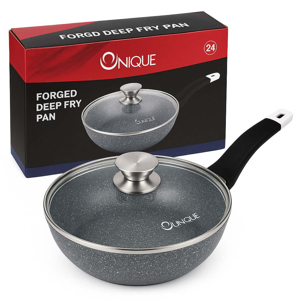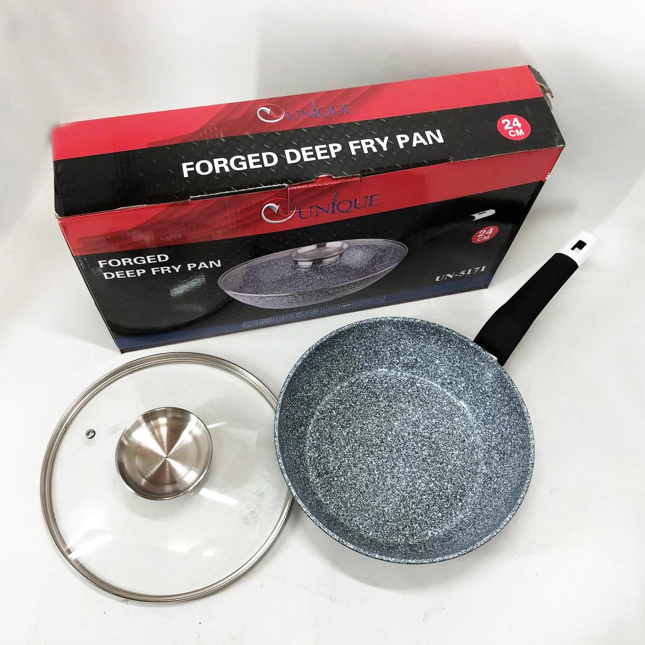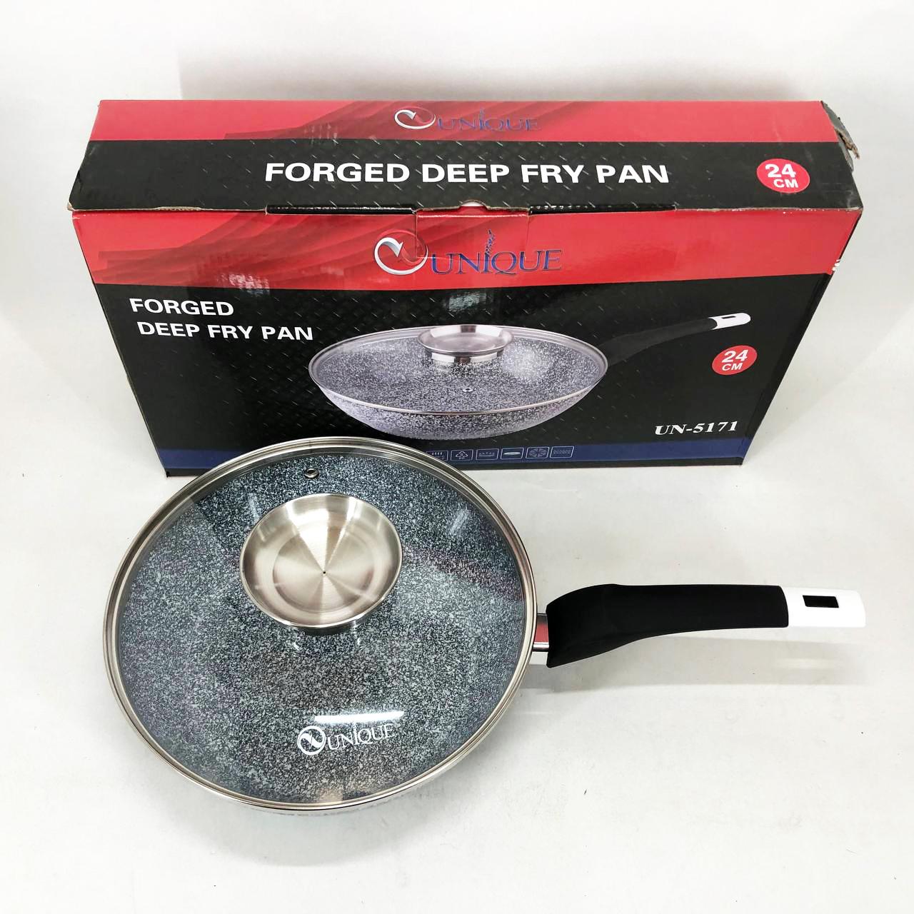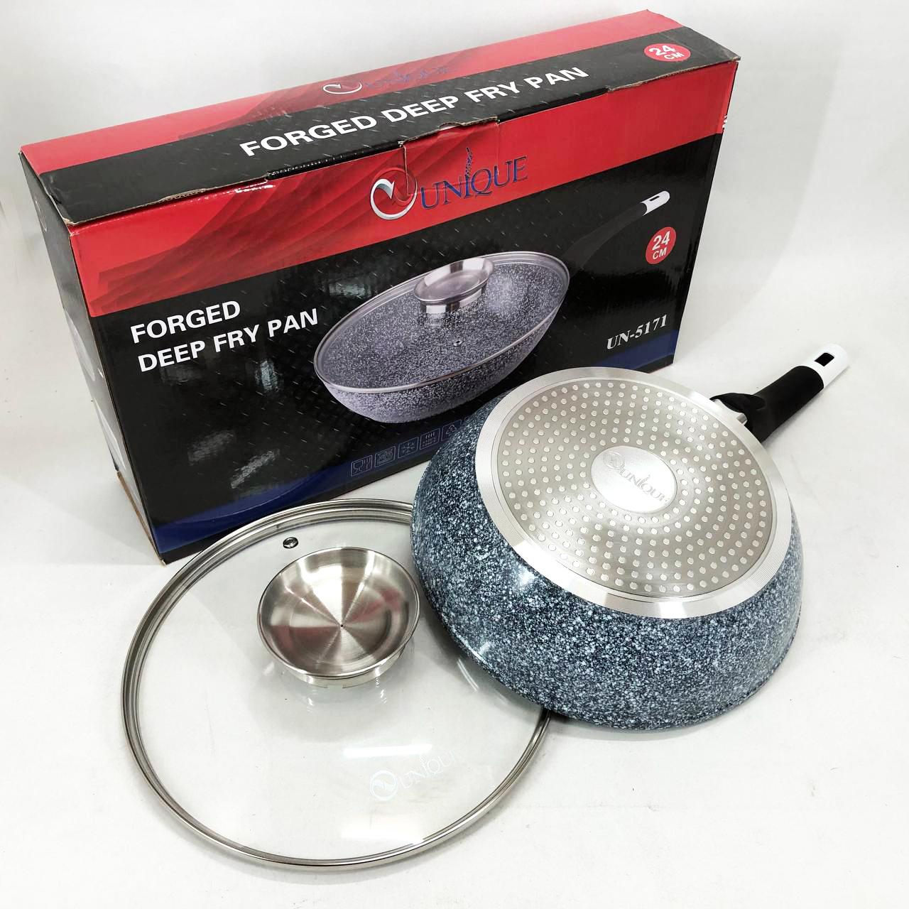 Глибока сковорода-вок UNIQUE UN-5171 діаметром 24 см — це універсальний інструмент для вашої кухні, що поєднує в собі функції класичної сковороди та сотейника. Завдяки високим бортам (11 см) та значному об’єму близько 3 літрів, вона ідеально підходить для створення складних страв, тушкування овочів, приготування м’яса або азійської локшини. Корпус із литого алюмінію оснащений інноваційним гранітним покриттям Granite coating, яке складається з декількох шарів кам’яної крихти. Це дозволяє просмажувати продукти до золотистої хрусткої скоринки з мінімальним використанням олії, зберігаючи максимальну поживну цінність і природний смак інгредієнтів.