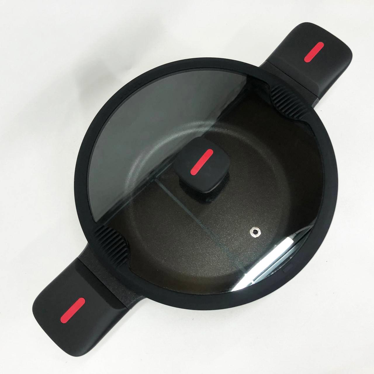 - Кришка: Так, в комплекті, із загартованого скла, зі спеціальними отворами для виходу пари та зливу рідини; із силіконовим кільцем, що захищає від сколів та спеціальними силіконовими вставками, що захищають пальці від опіків