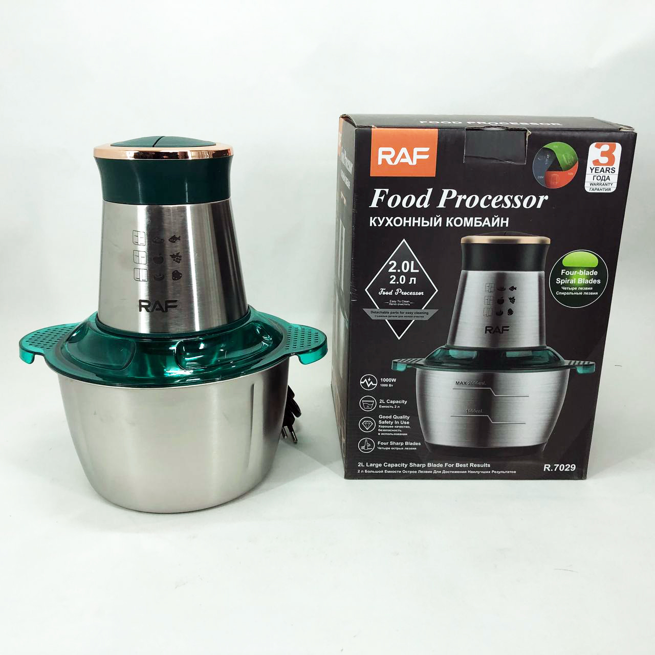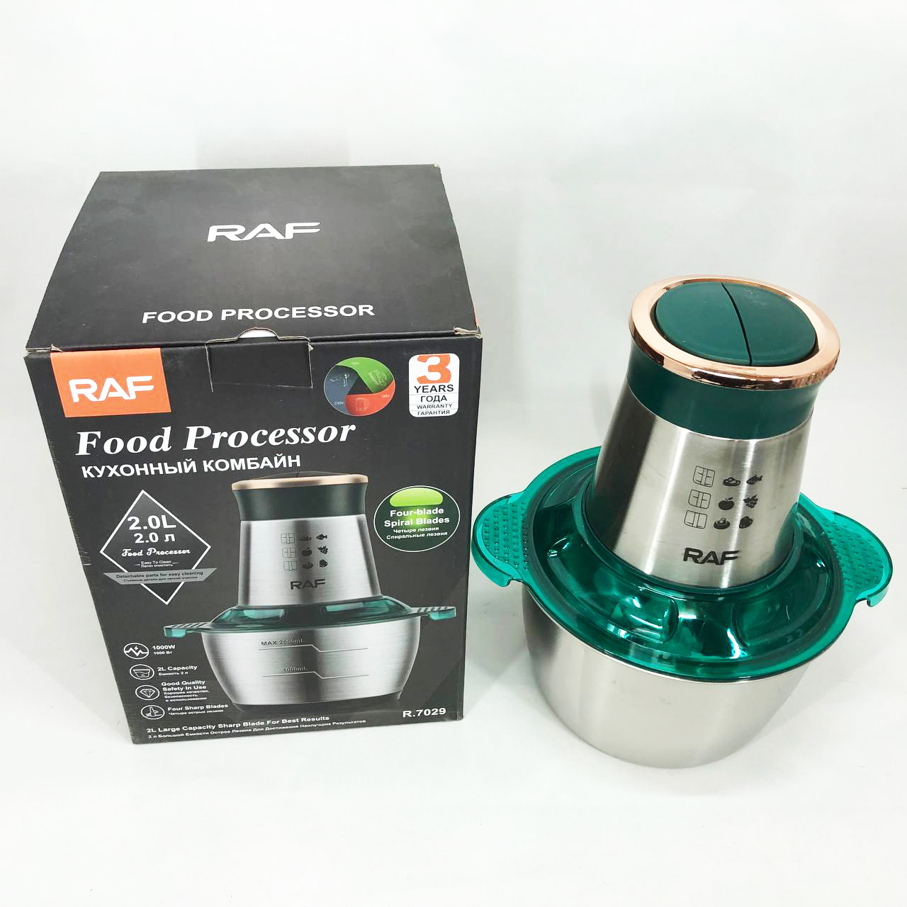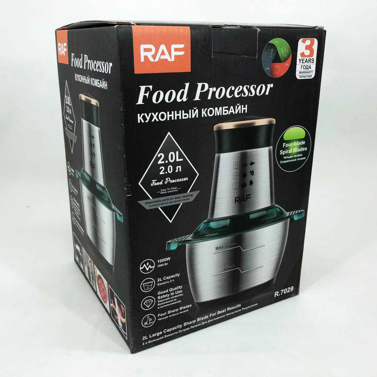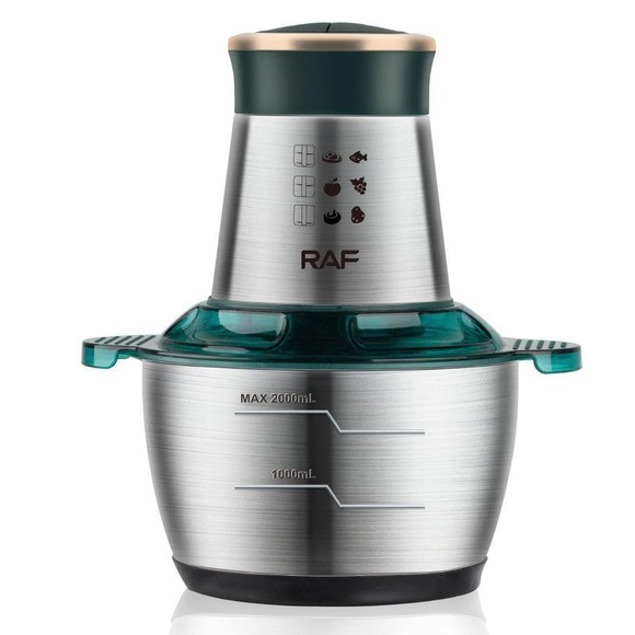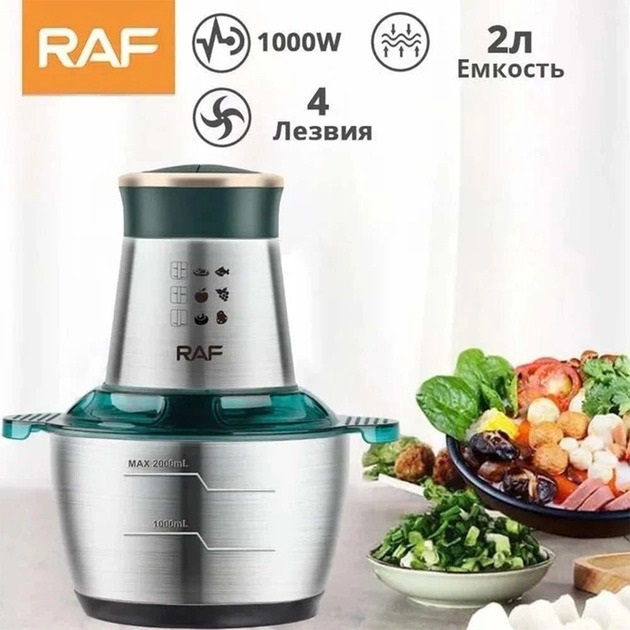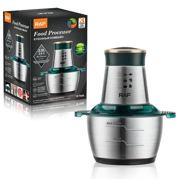Кухонний комбайн RAF R 7029 — це потужний багатофункціональний подрібнювач, блендер, м’ясорубка, млин для швидкого подрібнення як м’яких продуктів, таких як фрукти, перець, змішування різних соусів, яєць, так і твердих продуктів. м’ясо, овочі, зерна кукурудзи, бобові, коріння рослин, кава, боби, рис, з можливістю застосування не тільки в домашніх умовах, а й для ресторанів та барів.