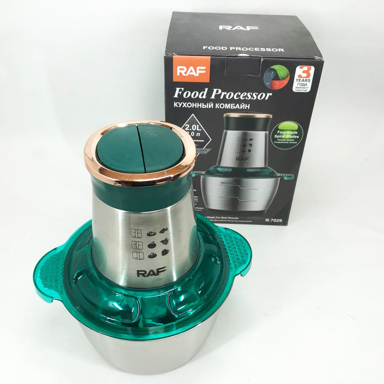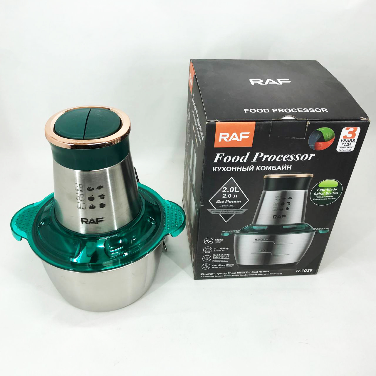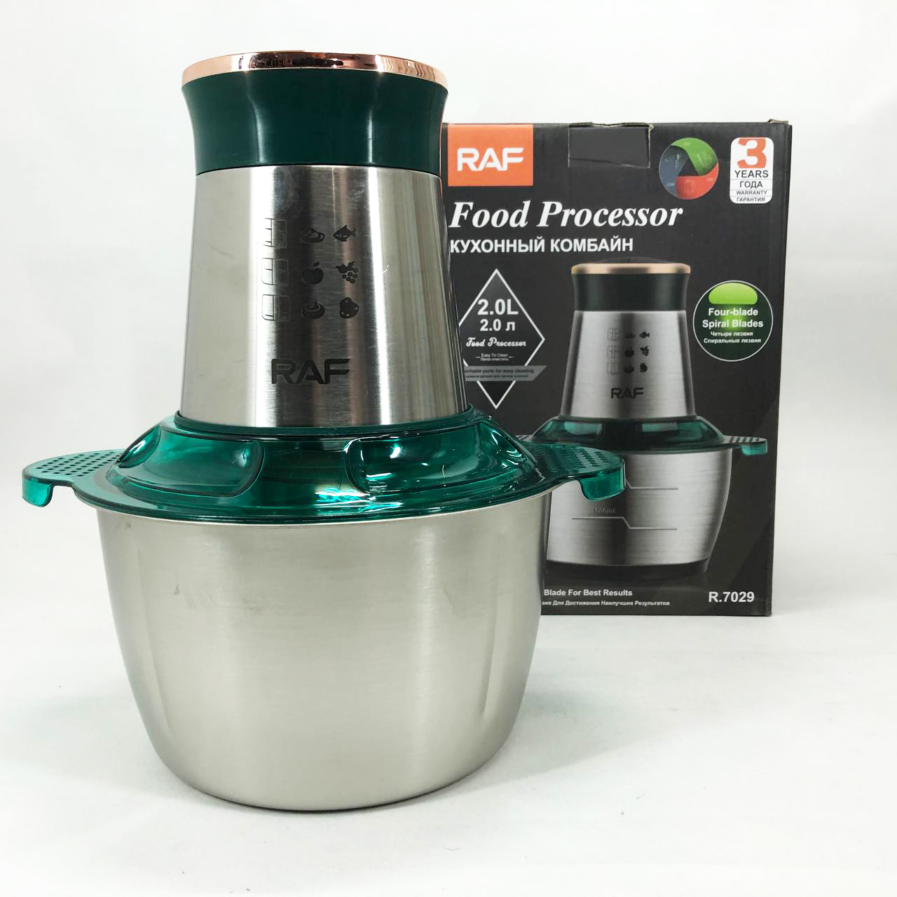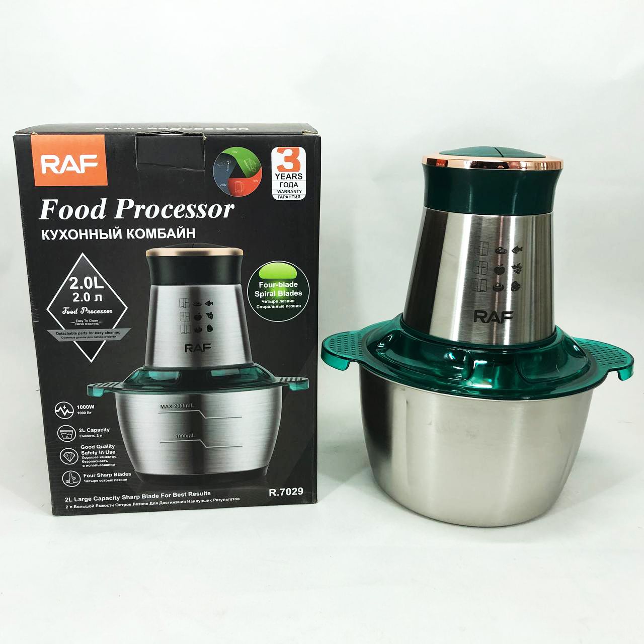 Кухонний комбайн RAF R 7029 — це потужний багатофункціональний подрібнювач, блендер, м’ясорубка, млин для швидкого подрібнення як м’яких продуктів, таких як фрукти, перець, змішування різних соусів, яєць, так і твердих продуктів. м’ясо, овочі, зерна кукурудзи, бобові, коріння рослин, кава, боби, рис, з можливістю застосування не тільки в домашніх умовах, а й для ресторанів та барів.