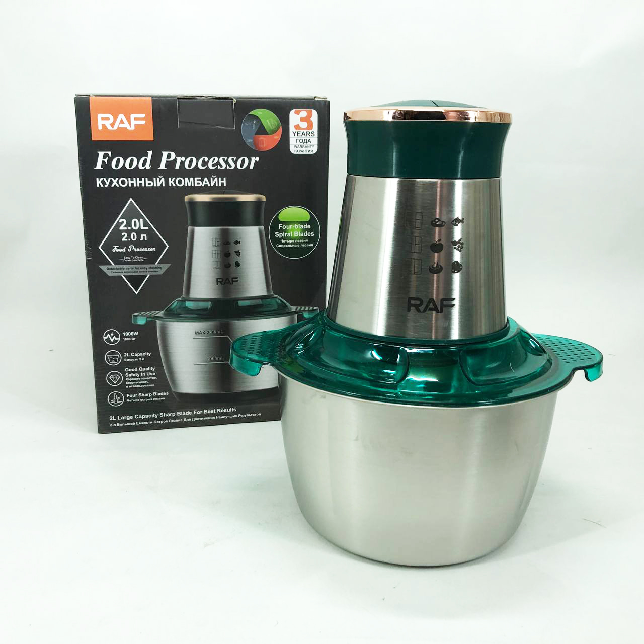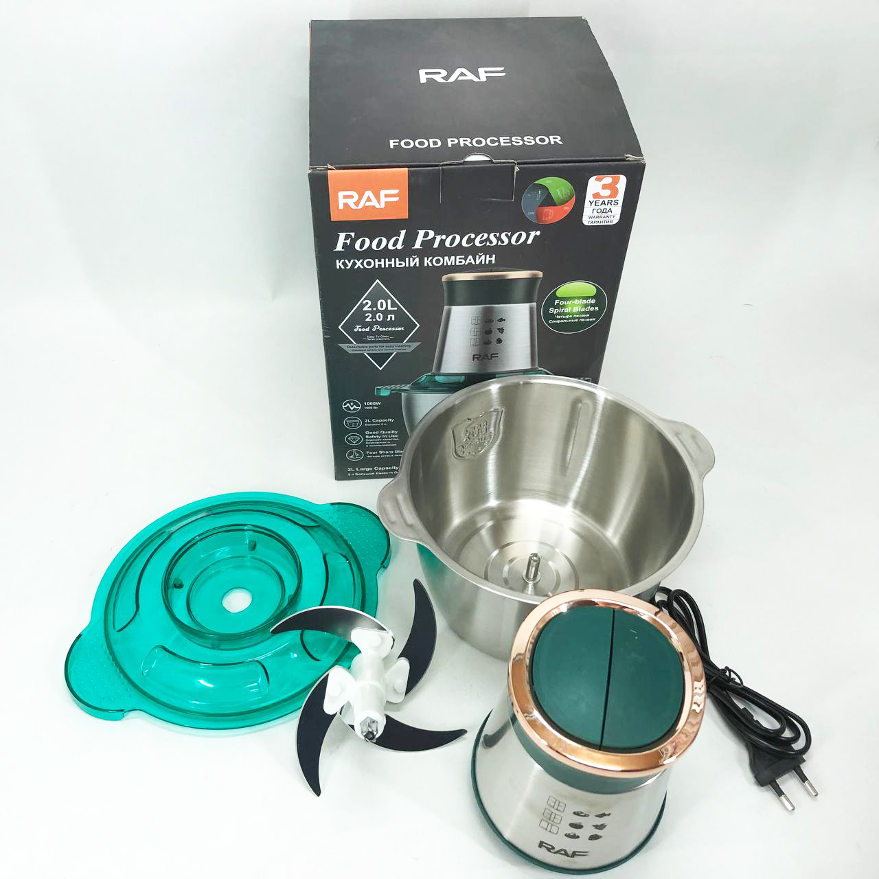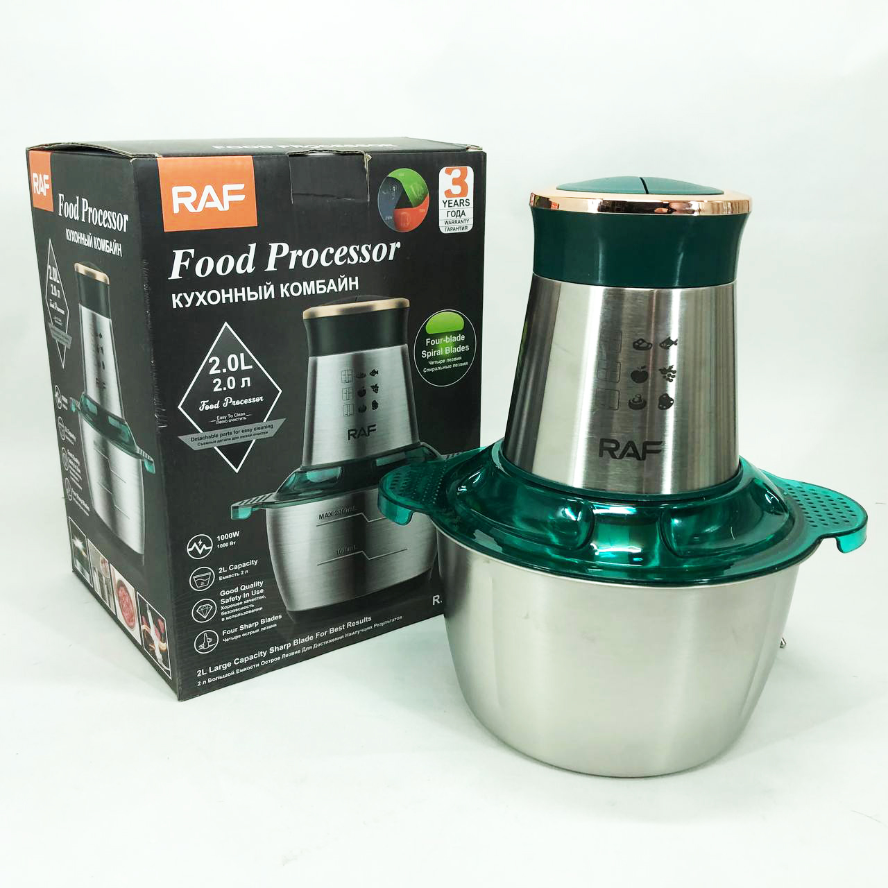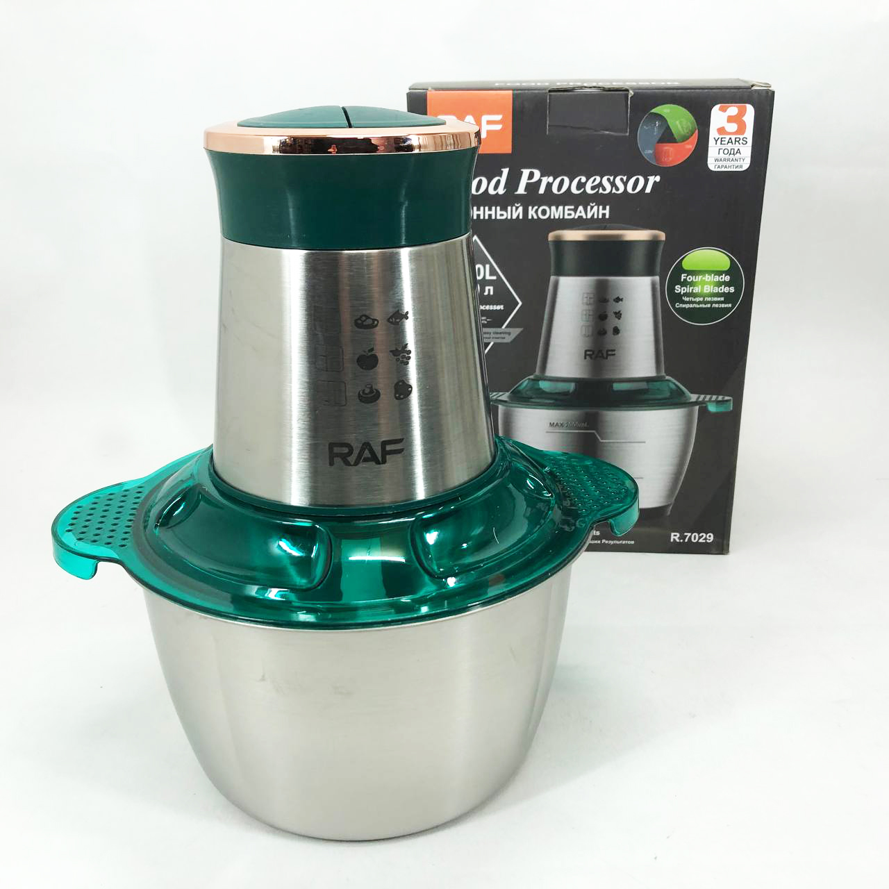 Кухонний комбайн RAF R 7029 — це потужний багатофункціональний подрібнювач, блендер, м’ясорубка, млин для швидкого подрібнення як м’яких продуктів, таких як фрукти, перець, змішування різних соусів, яєць, так і твердих продуктів. м’ясо, овочі, зерна кукурудзи, бобові, коріння рослин, кава, боби, рис, з можливістю застосування не тільки в домашніх умовах, а й для ресторанів та барів.
