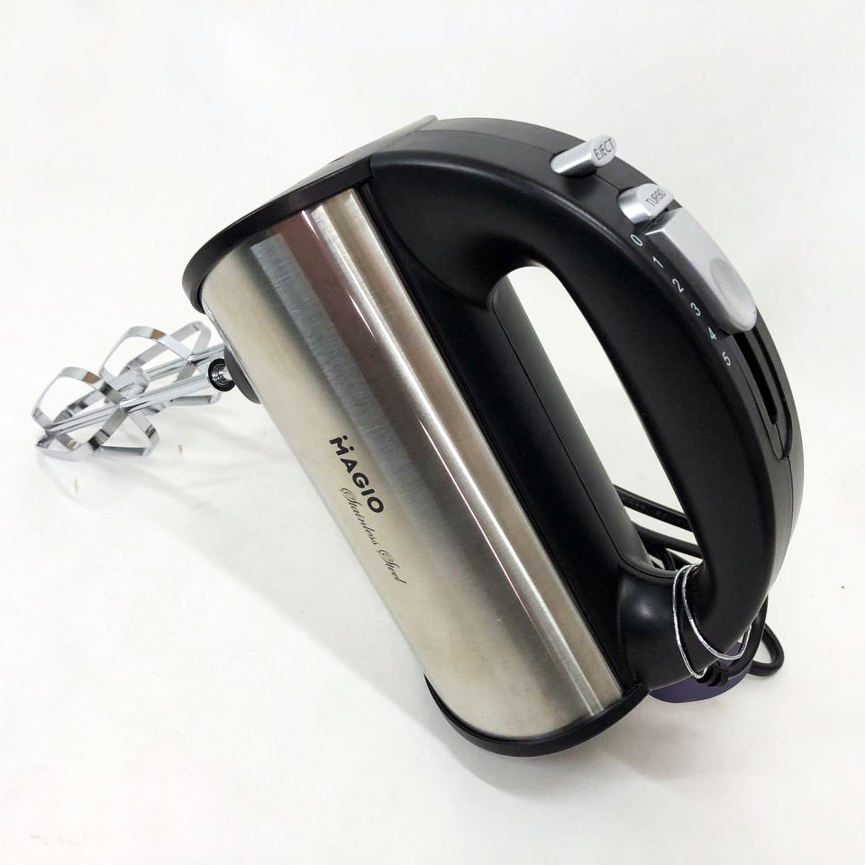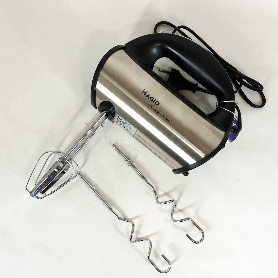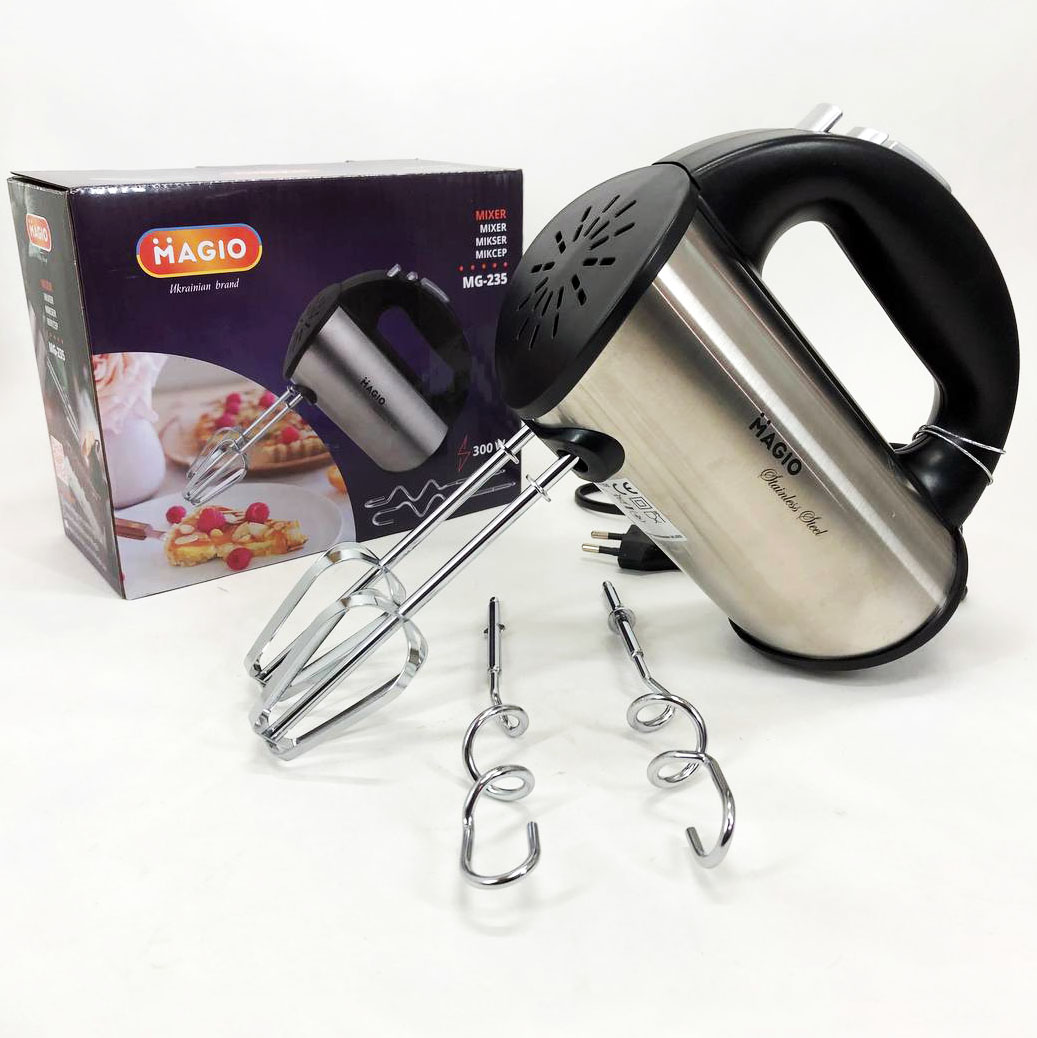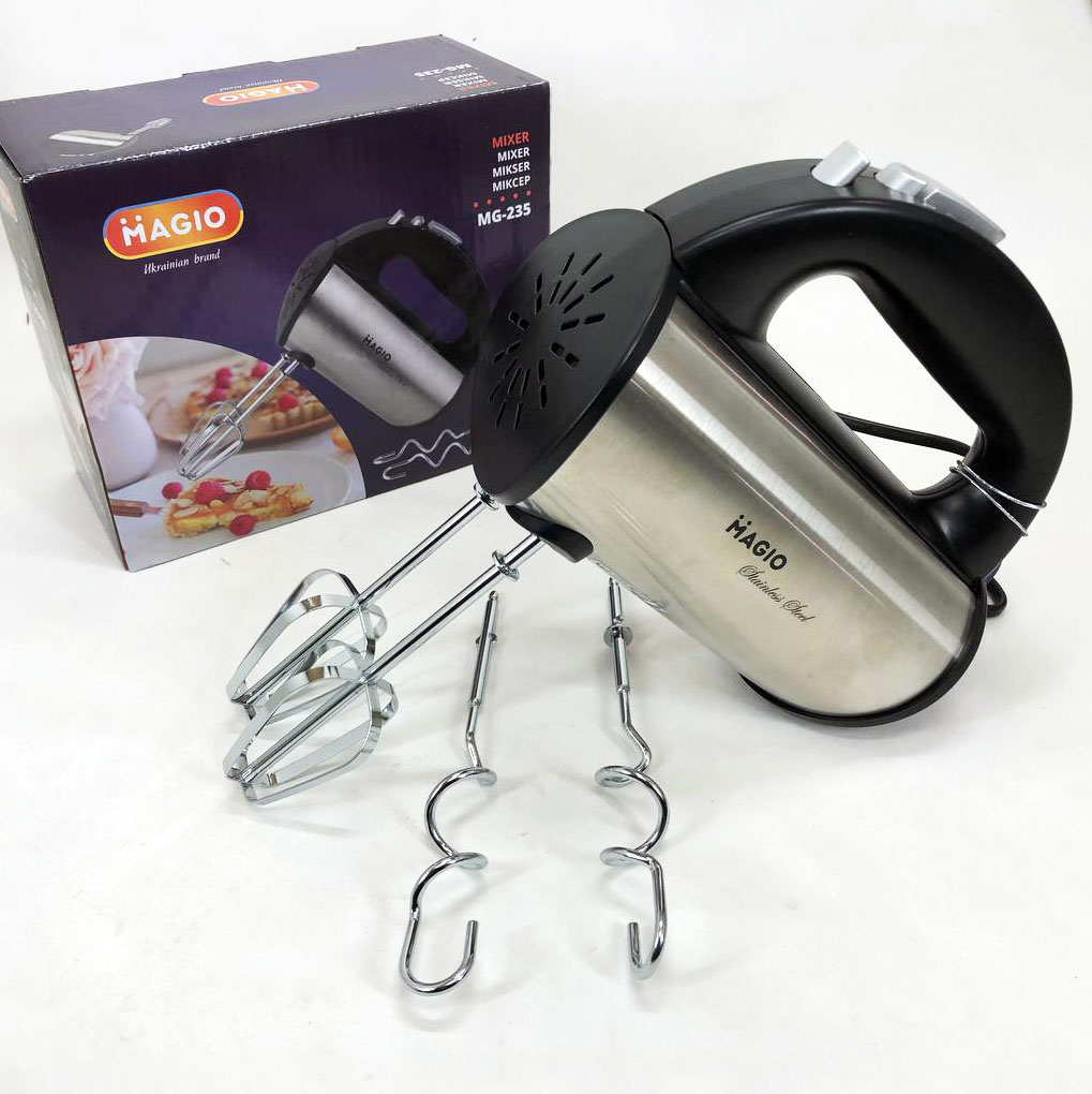 Міксер Magio MG-235 значно полегшить процес приготування тіста, забезпечить швидкий і відмінний результат, так що ви зможете балувати своїх рідних домашньою випічкою щодня. Потужний і водночас компактний ручний міксер із зручною ергономічною ручкою виконаний у корпусі з нержавіючої сталі, що значно підвищує його надійність та довговічність. Є два види насадок в комплекті: віночки для розмішування рідин і збивання яєць і вершків, а також гачки для перемішування густого тіста або пюре. Зручне розташування регулятора швидкості на ручці дозволяє керувати режимом роботи, не перериваючи процес. Варто відзначити наявність кнопки викиду насадок, яка значно полегшує догляд виробу. Двигун потужністю 280 Вт забезпечує ефективну роботу міксераMagio MG-235 і підтримує п’ять швидкостей/Додатковим можливості надає режим «Турбо», що дозволяє значно швидше досягти бажаного результату.
