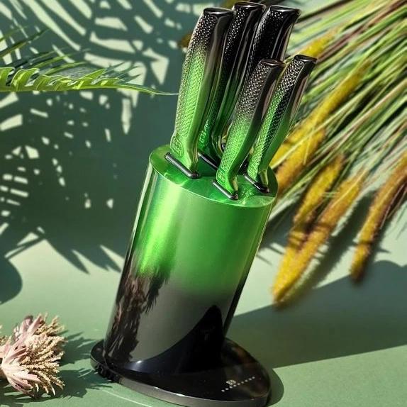 - Зручне зберігання: Компактна настільна підставка забезпечує швидкий доступ до кожного ножа.