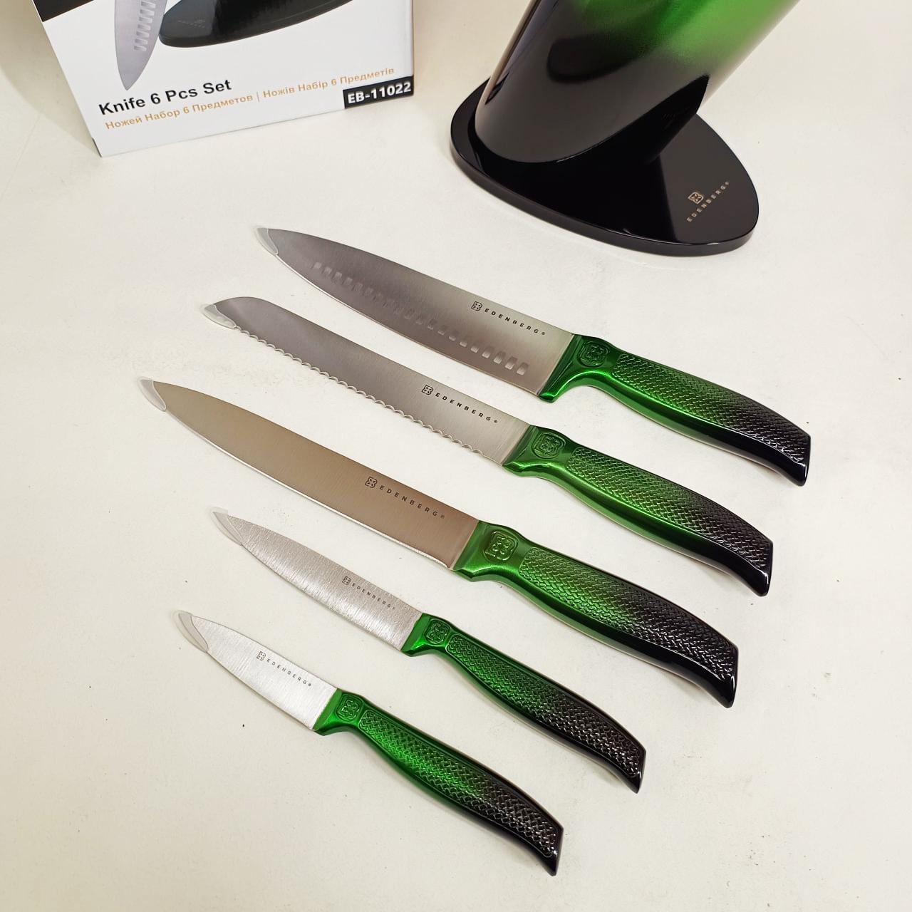 Набір кухонних ножів Edenberg EB-11022 Green — це ідеальне поєднання професійної якості та сучасного дизайну. Виконаний повністю з високоякісної нержавіючої сталі, цей комплект розроблений для тих, хто цінує надійність та мінімалізм у догляді. Яскраві зелені вставки на рукоятках додають свіжості кухонному інтер’єру, а ергономічна форма ножів гарантує безпечну та швидку роботу з будь-якими продуктами.