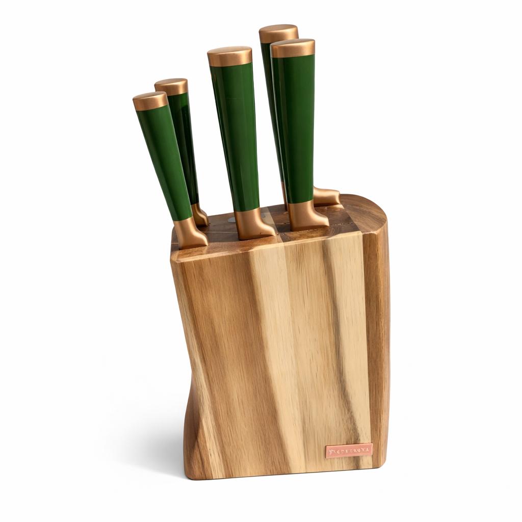- Дерев’яна підставка захищає ріжучу кромку ножів від контакту з іншими приборами.