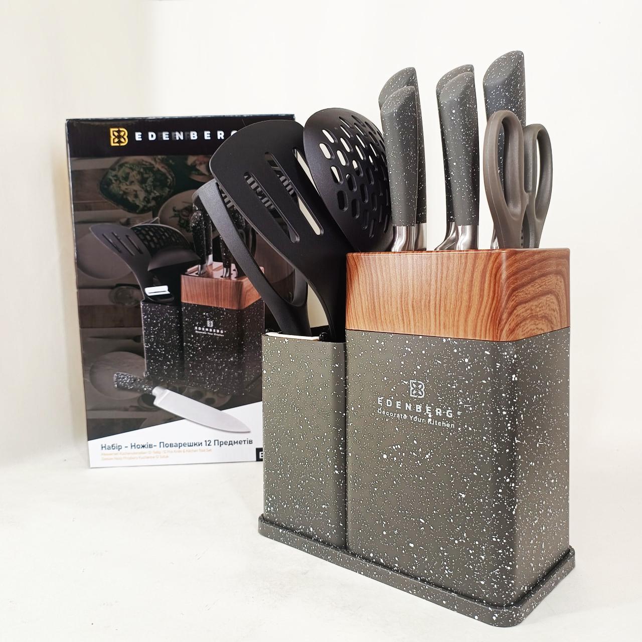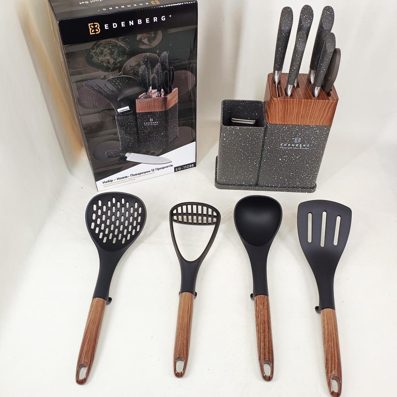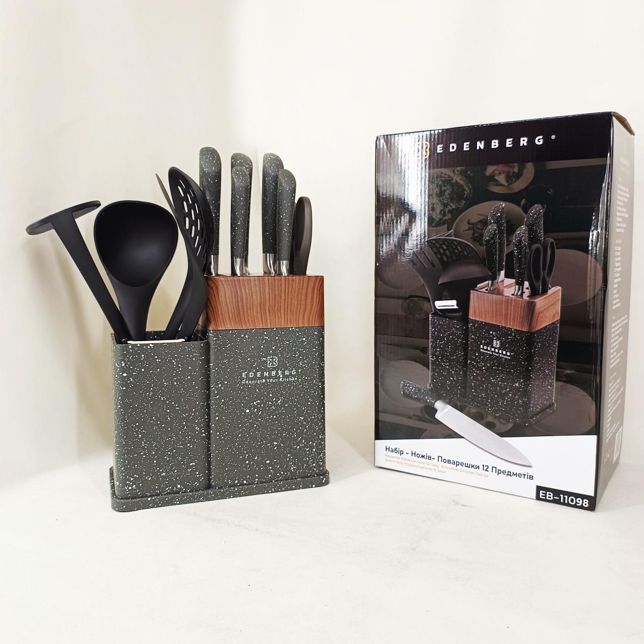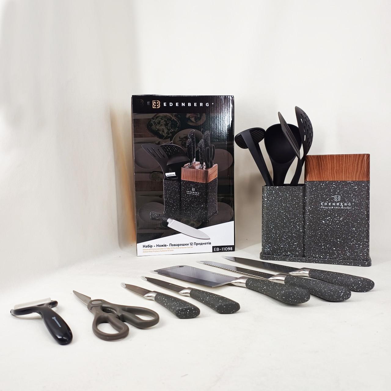 Кухонний набір Edenberg EB-11098 — це максимально повна комплектація для тих, хто прагне організувати робочий простір професійно та стильно. Набір включає 12 предметів, серед яких гострі ножі з нержавіючої сталі, кухонні ножиці, керамічна овочечистка та набір лопаток і ложок для приготування гарячих страв. Всі інструменти виготовлені з безпечних матеріалів, які не вступають у реакцію з їжею та зберігають її природний смак. Завдяки продуманій бакелітовій стійці, інструменти завжди знаходяться під рукою, займаючи мінімум місця на стільниці. Це ідеальний вибір для щоденного використання, що поєднує в собі надійність, багатофункціональність та сучасну естетику.