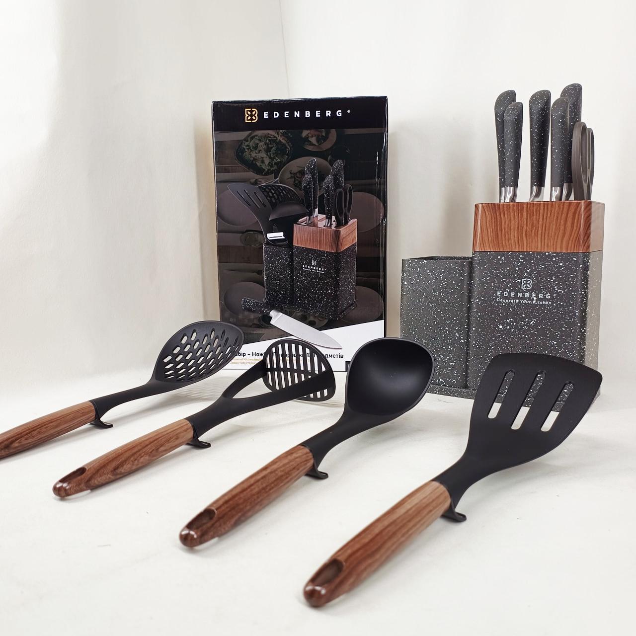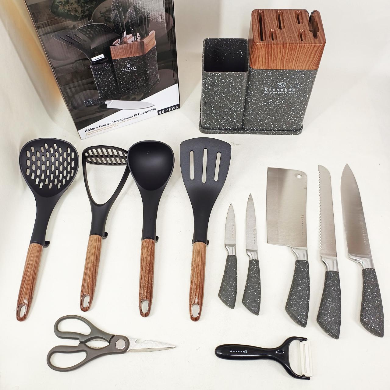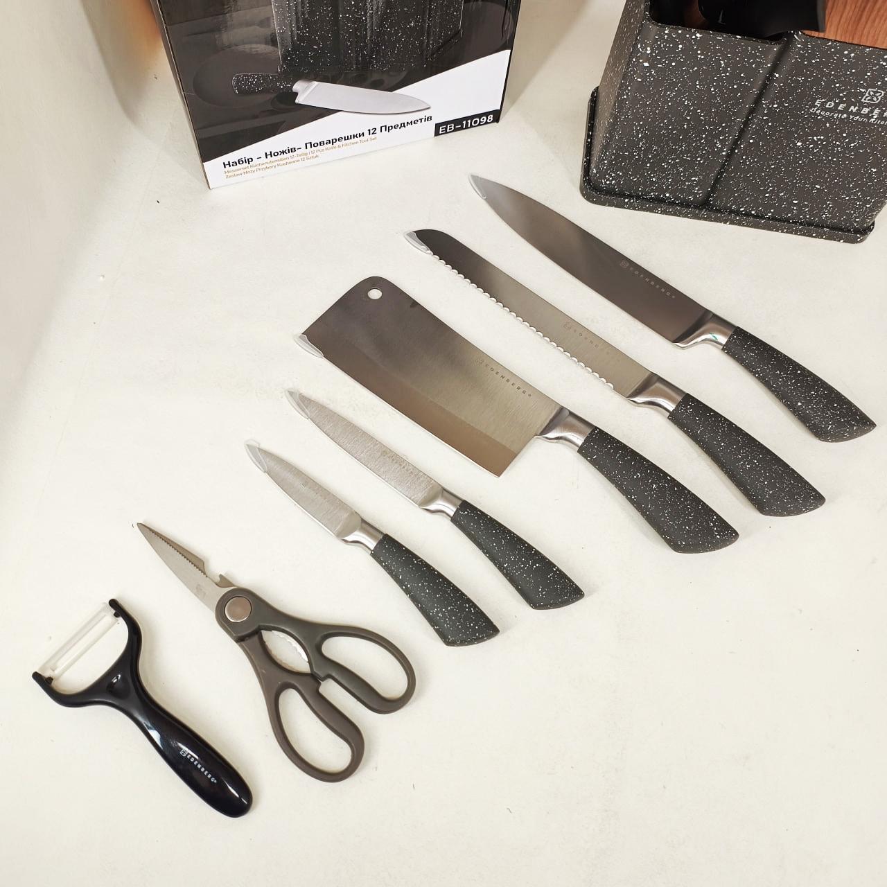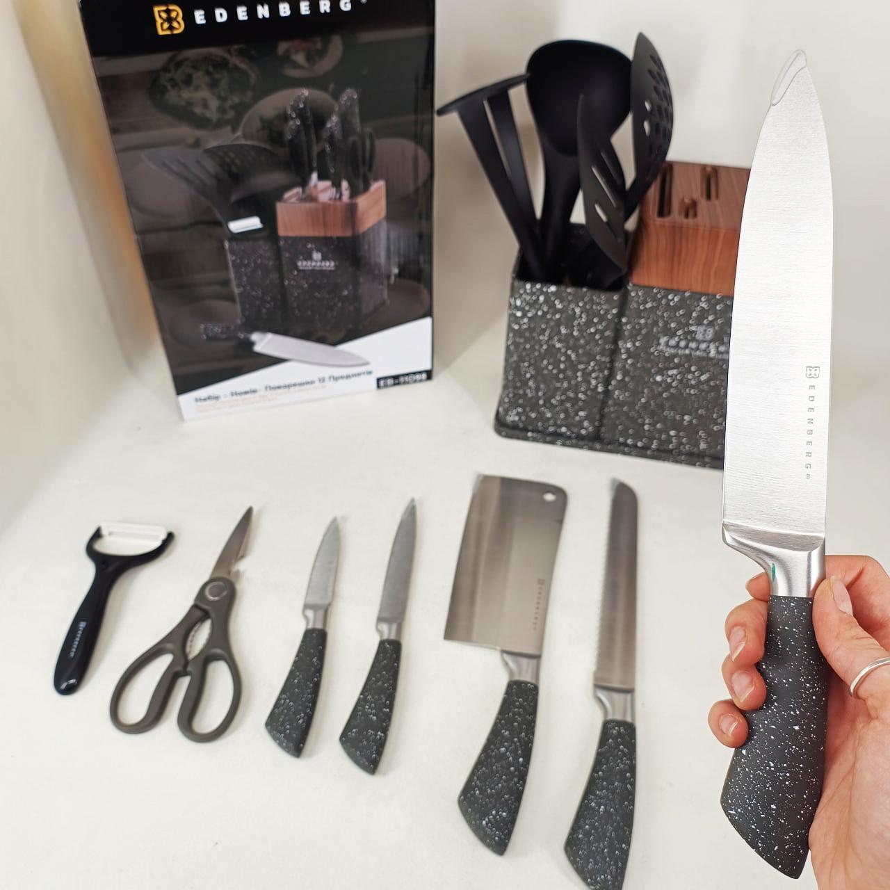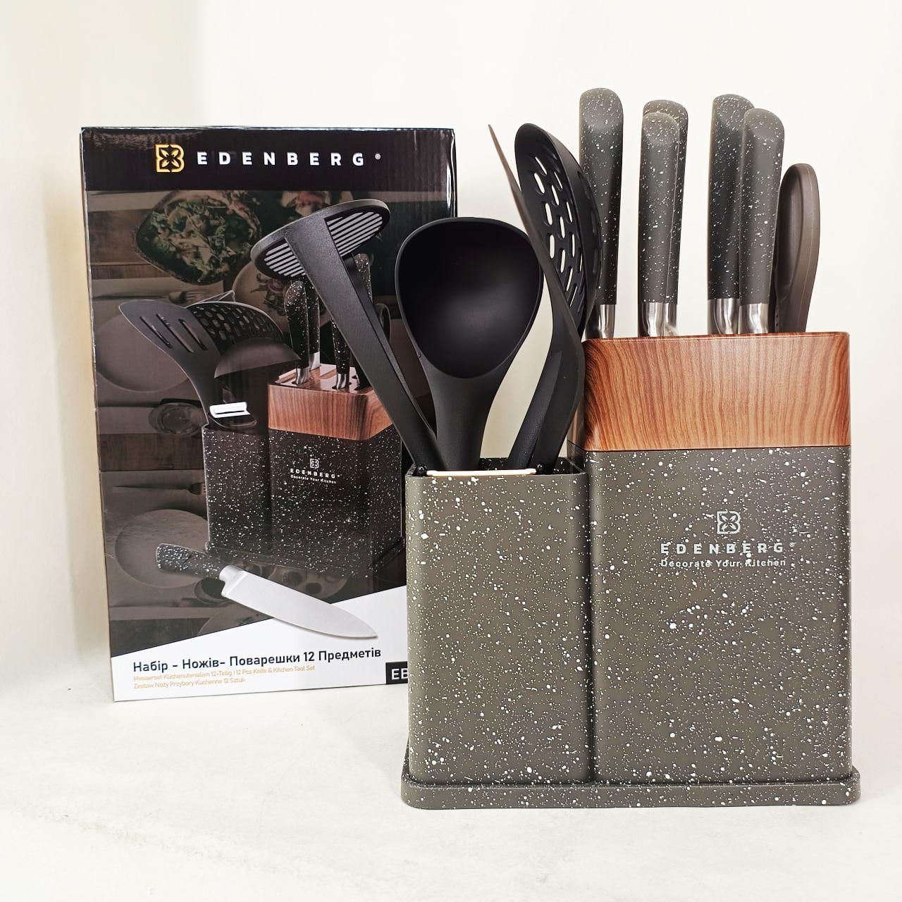 Кухонний набір Edenberg EB-11098 — це максимально повна комплектація для тих, хто прагне організувати робочий простір професійно та стильно. Набір включає 12 предметів, серед яких гострі ножі з нержавіючої сталі, кухонні ножиці, керамічна овочечистка та набір лопаток і ложок для приготування гарячих страв. Всі інструменти виготовлені з безпечних матеріалів, які не вступають у реакцію з їжею та зберігають її природний смак. Завдяки продуманій бакелітовій стійці, інструменти завжди знаходяться під рукою, займаючи мінімум місця на стільниці. Це ідеальний вибір для щоденного використання, що поєднує в собі надійність, багатофункціональність та сучасну естетику.