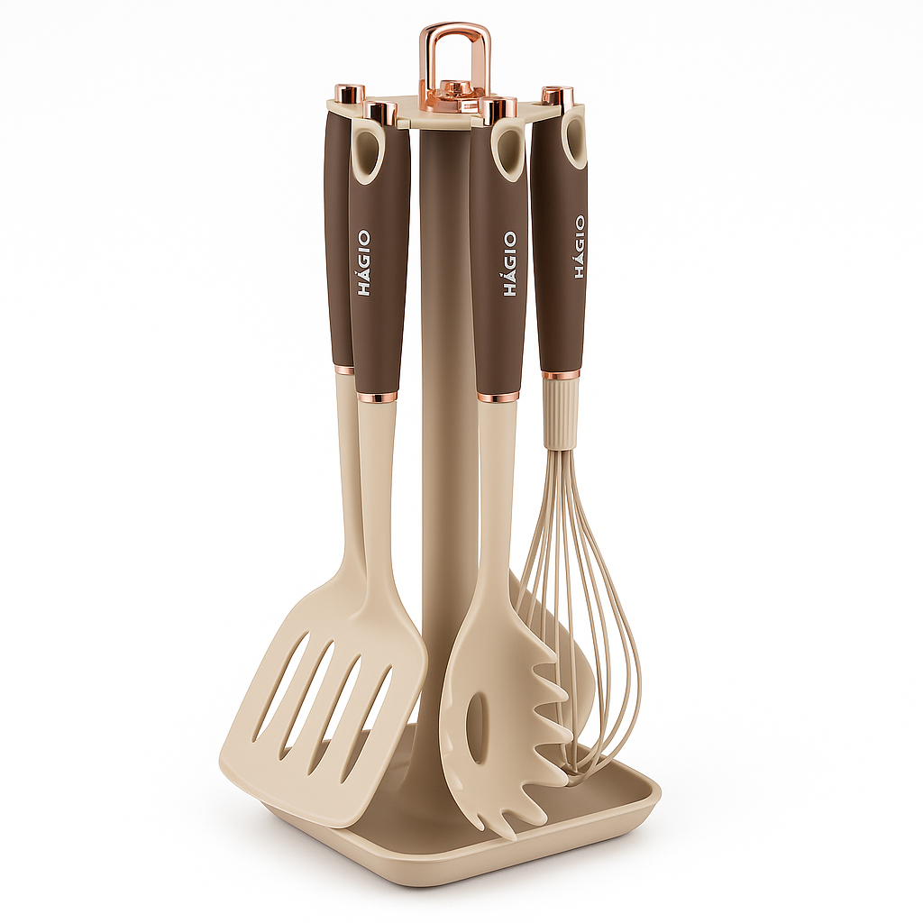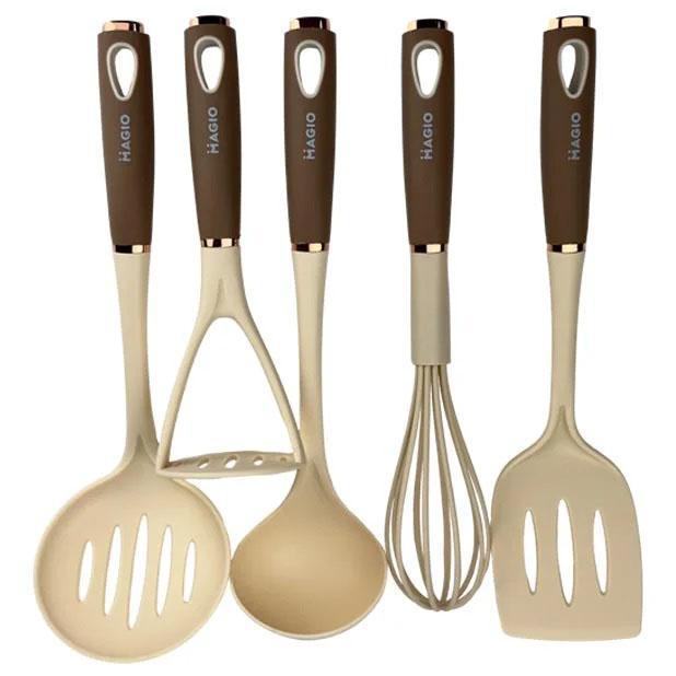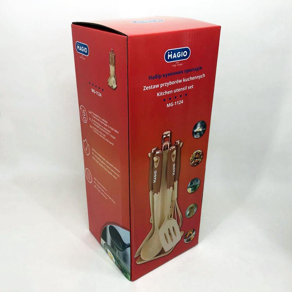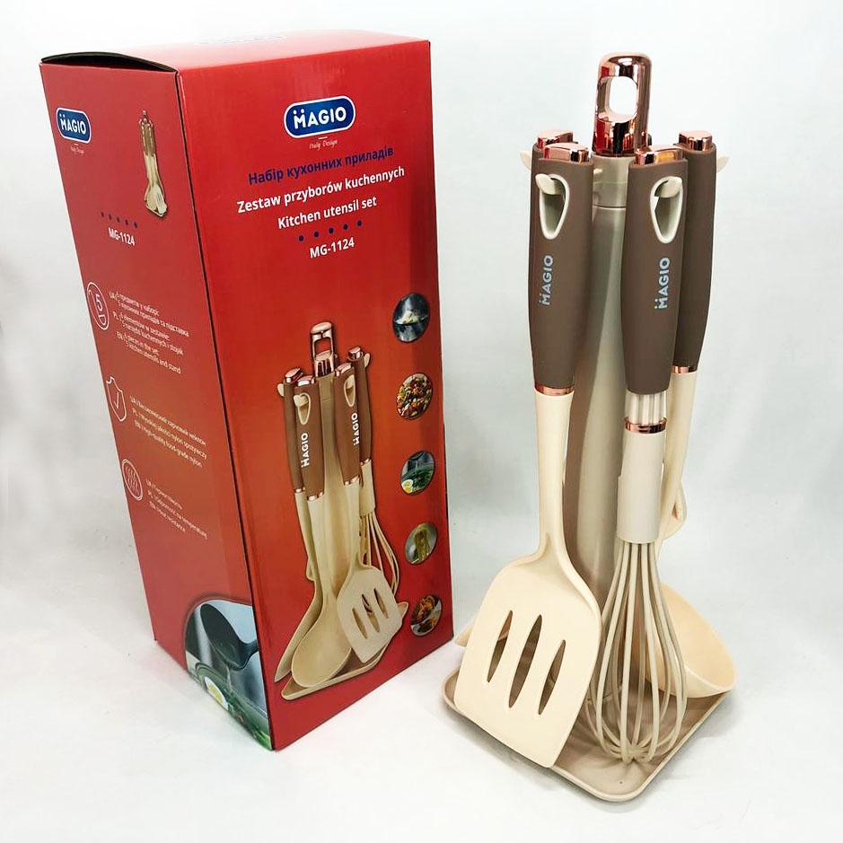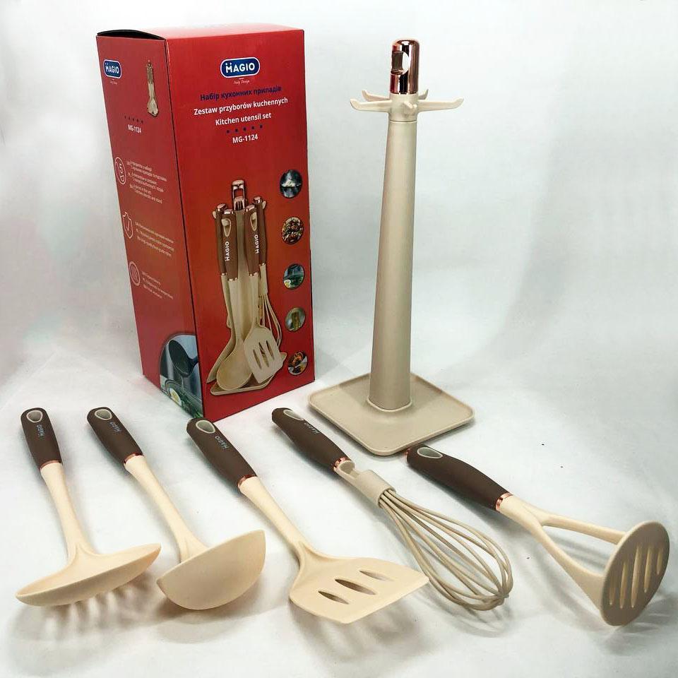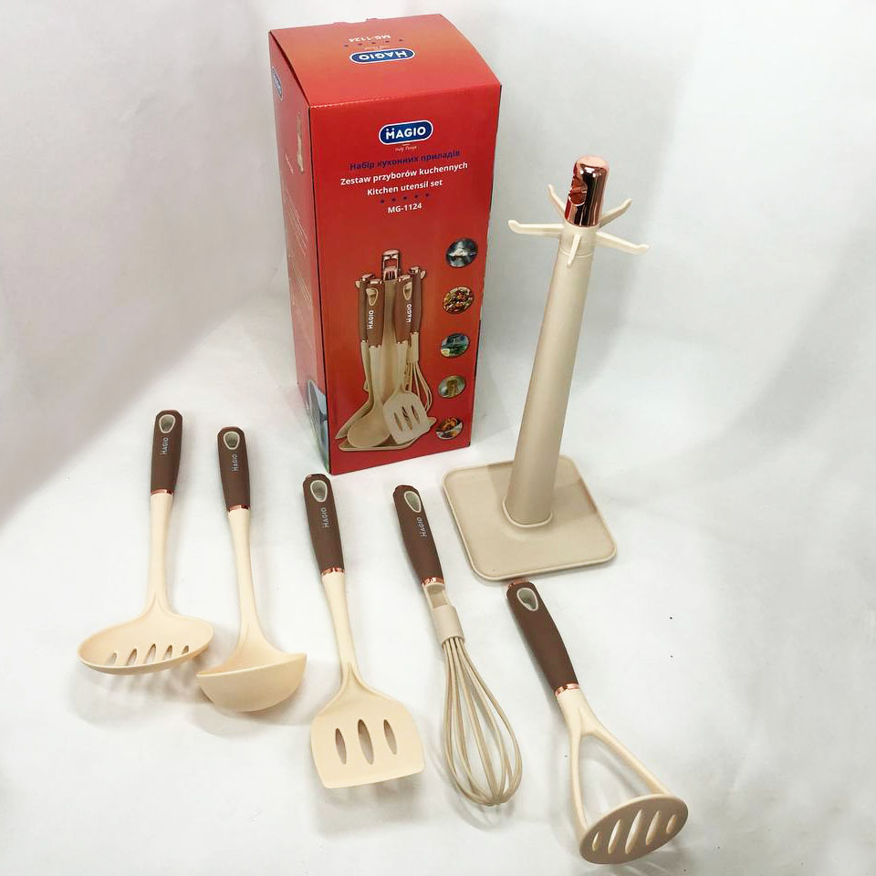 Набір кухонний MG-1124 — це практичні приладдя з нейлону, які ідеально підходять для всіх ваших повсякденних кулінарних потреб. Завдяки стильному дизайну та можливості зберігати на підставці, ви зможете легко організувати вашу кухонну площу. Цей набір чудово підходить для посуду з антипригарним покриттям та не вбирає запахи, що робить його незамінним у кожній кухні.