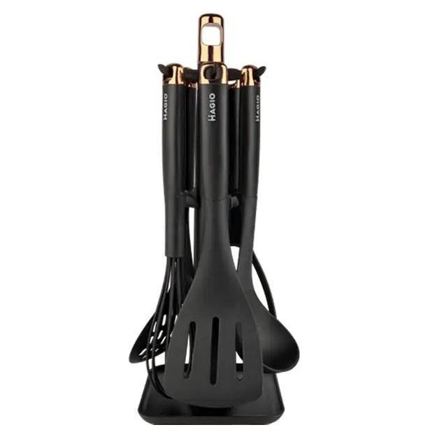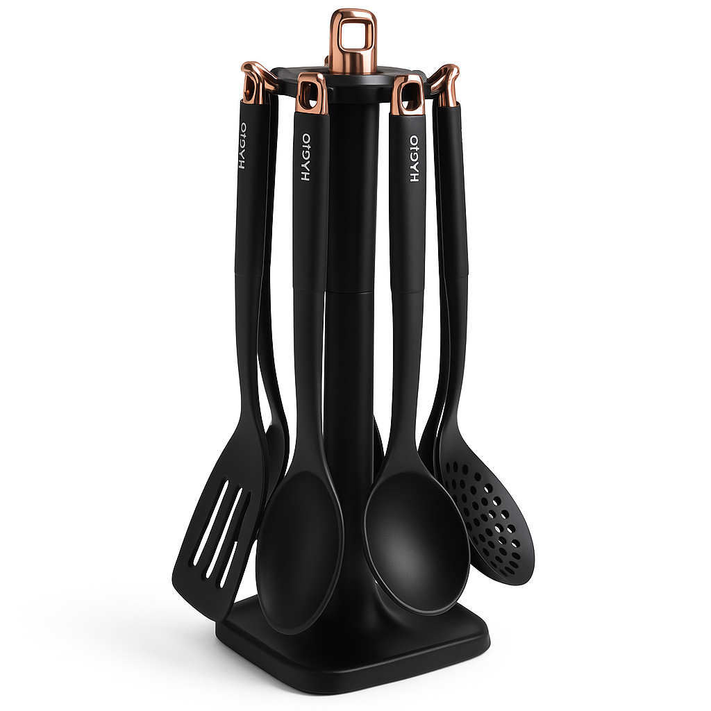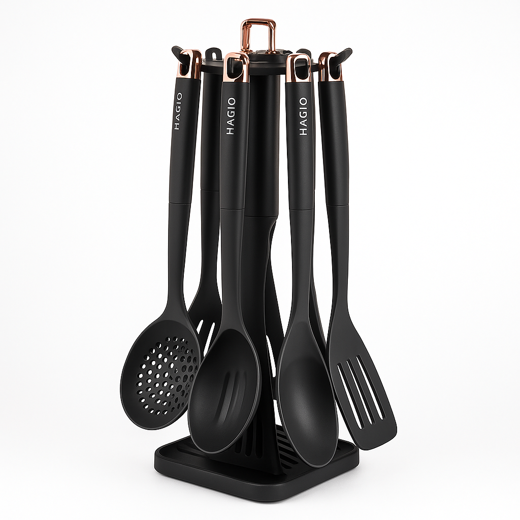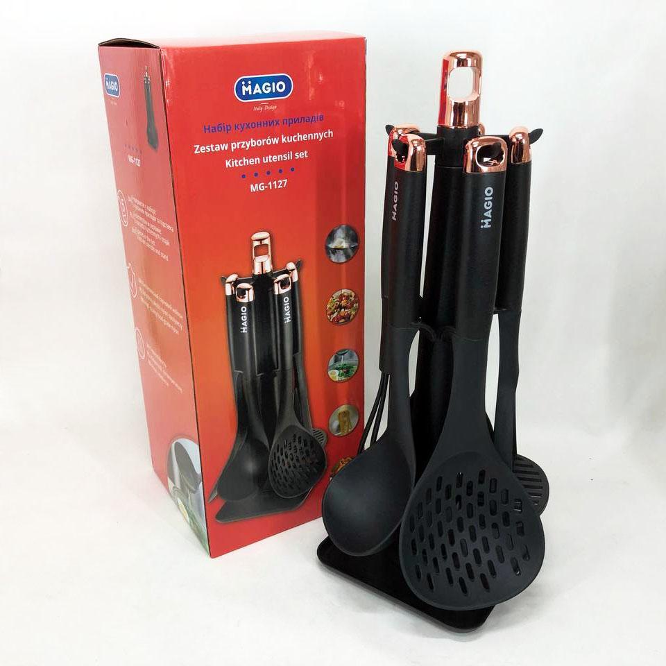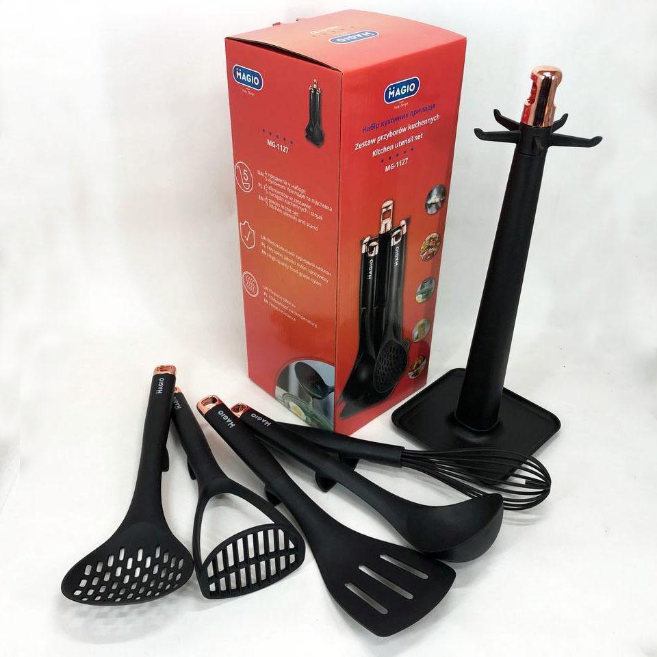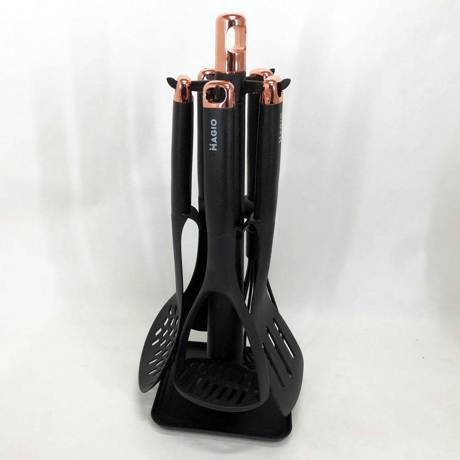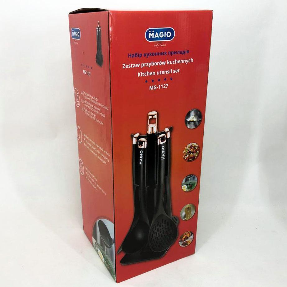Інноваційний набір кухонного приладдя MG-1127 поєднує в собі набор необхідних інструментів для зручного приготування їжі з надійним захистом кухонного посуду. Завдяки використанню якісних матеріалів – пластику та нейлону – цей комплект демонструє відмінну легкість, довговічність і безпеку застосування, зберігаючи антипригарне покриття ваших сковорідок і каструль від пошкоджень. З ергономічними ручками та практичною стійкою для зберігання, MG-1127 допоможе впорядкувати робочу поверхню, забезпечить комфорт і швидкість на кухні, підвищуючи ефективність кулінарного процесу.
