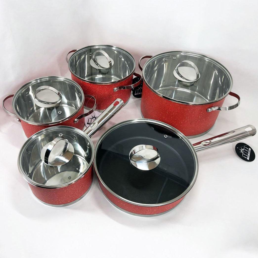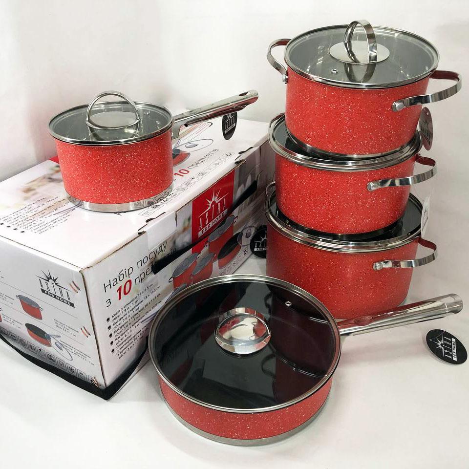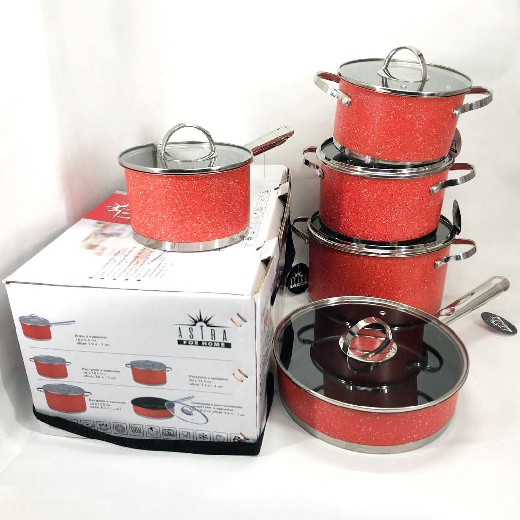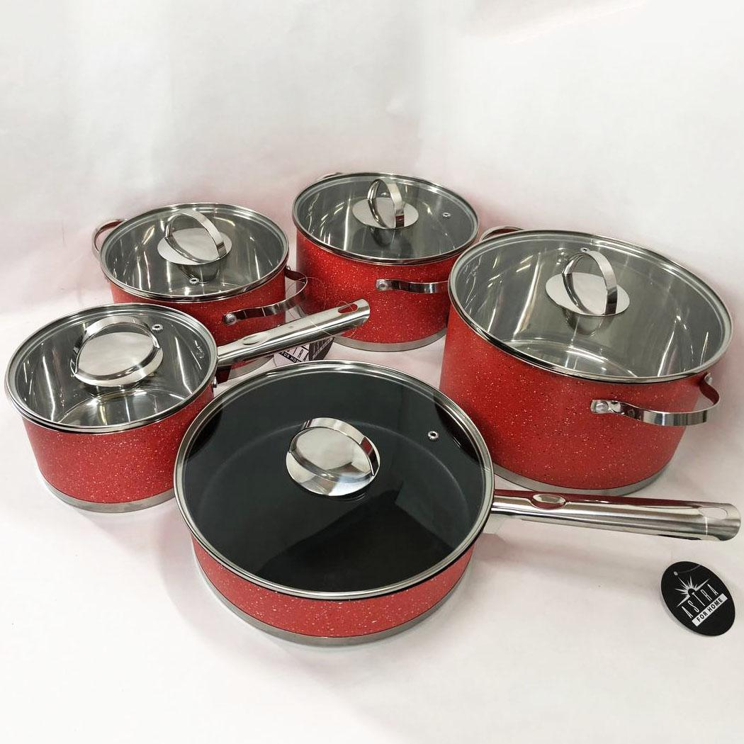 Набір посуду ASTRA виготовлений з високоякісної нержавіючої сталі 18/10 (18% Хром & 10% Нікель) такий матеріал робить набори міцними і довговічними. Посуд на відміну від інших видів металевого посуду не впливає на смак їжі, що готується. Всі ємності мають дзеркальне полірування зовні та матове всередині. П’ятишарове капсульне дно не деформується при нагріванні і забезпечує швидкий і рівномірний розподіл тепла. Ручки каструль клепні, зручно розташовані, ергономічні. Скляні кришки з отвором для виходу пари дозволять контролювати весь процес приготування в оптимальному режимі.