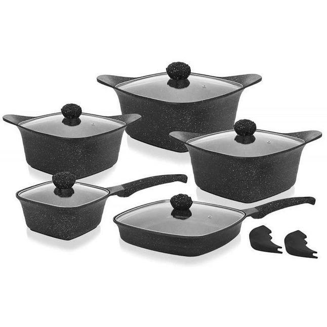 Набір кухонного посуду Еденберг EB-12912 – це сучасне та багатофункціональне рішення для щоденного приготування страв на плиті та в духовці. Квадратна форма каструль та сковороди-гриль забезпечує велику корисну площу, що особливо зручно для гасіння, запікання, смаження та приготування страв для всієї родини.