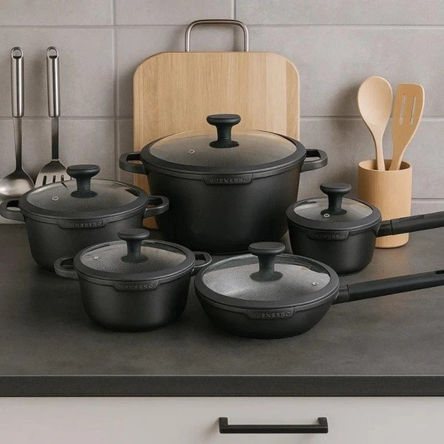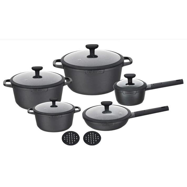 Набір каструль та сковорід Edenberg EB-5652 — це практичний та довговічний кухонний комплект для щоденного використання. Посуд виконаний з міцного литого алюмінію і оснащений тришаровим мармуровим антипригарним покриттям, яке запобігає пригоранню та забезпечує рівномірне нагрівання по всій поверхні.