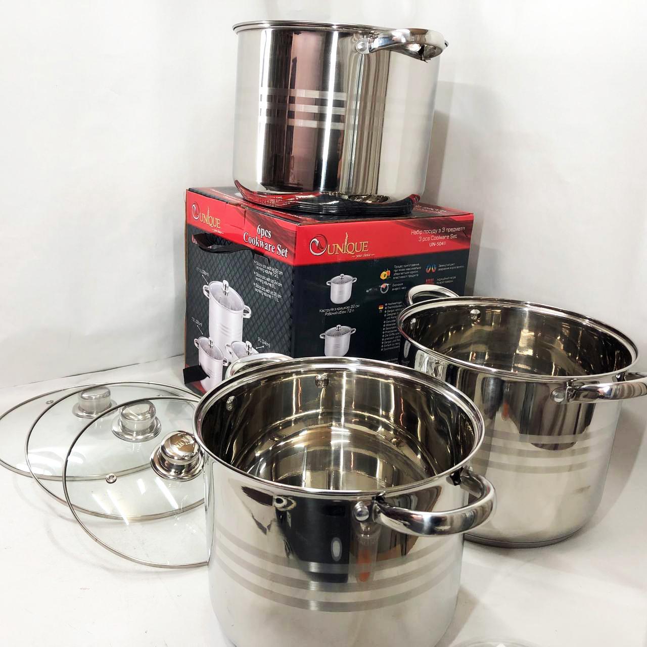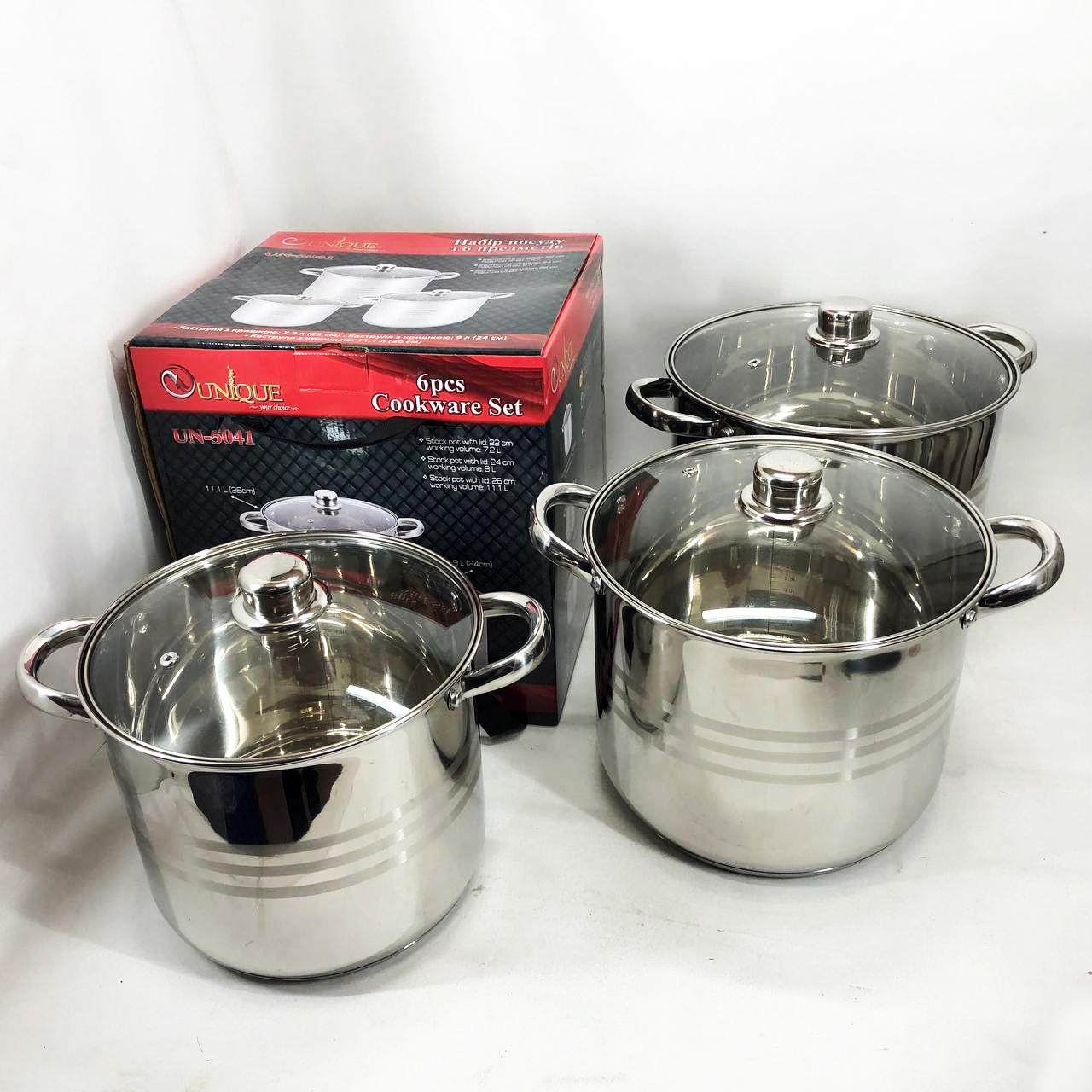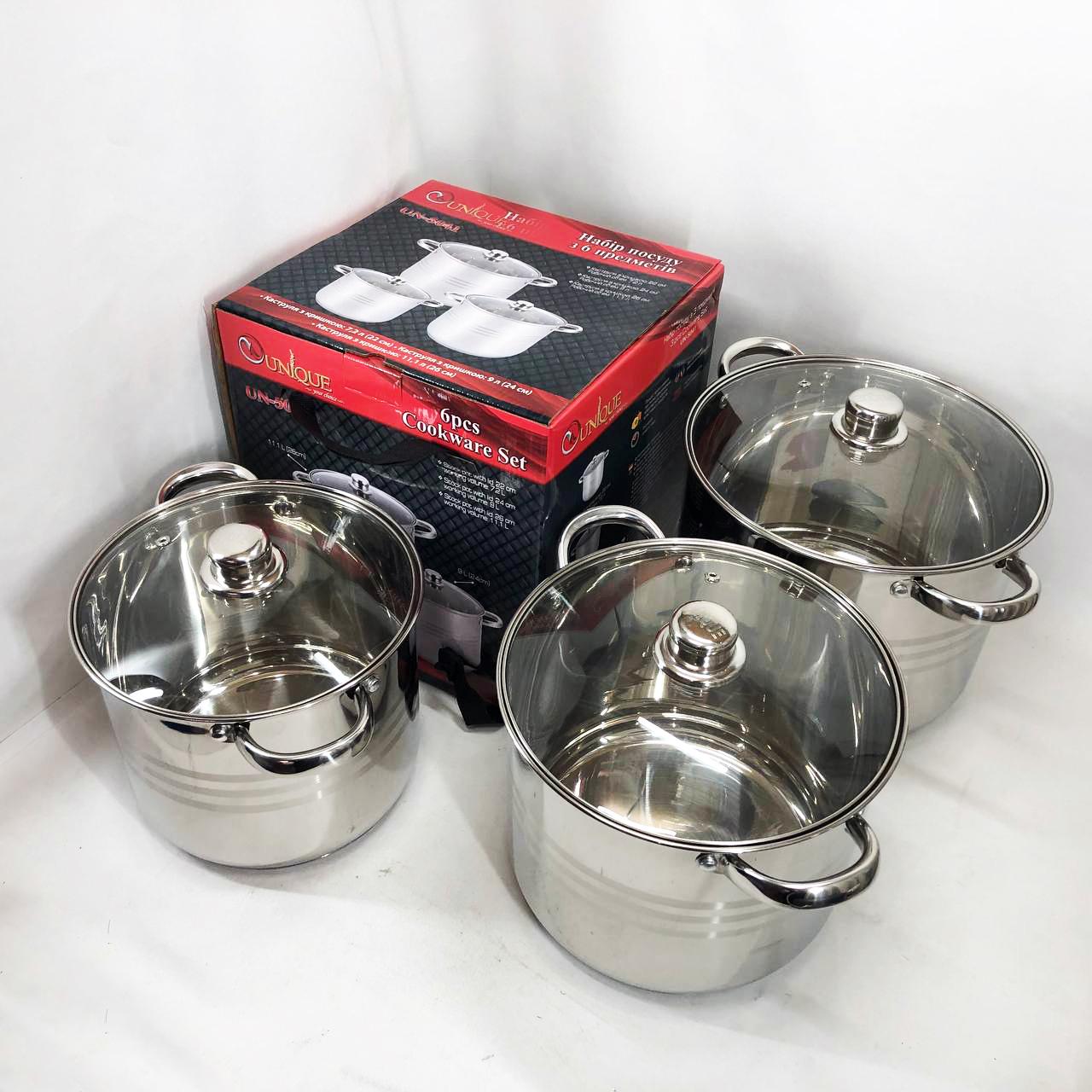 - Об’єм і діаметр кастрюль у наборі: