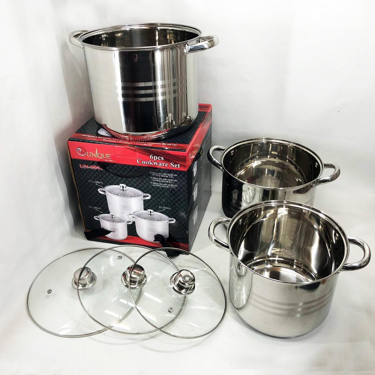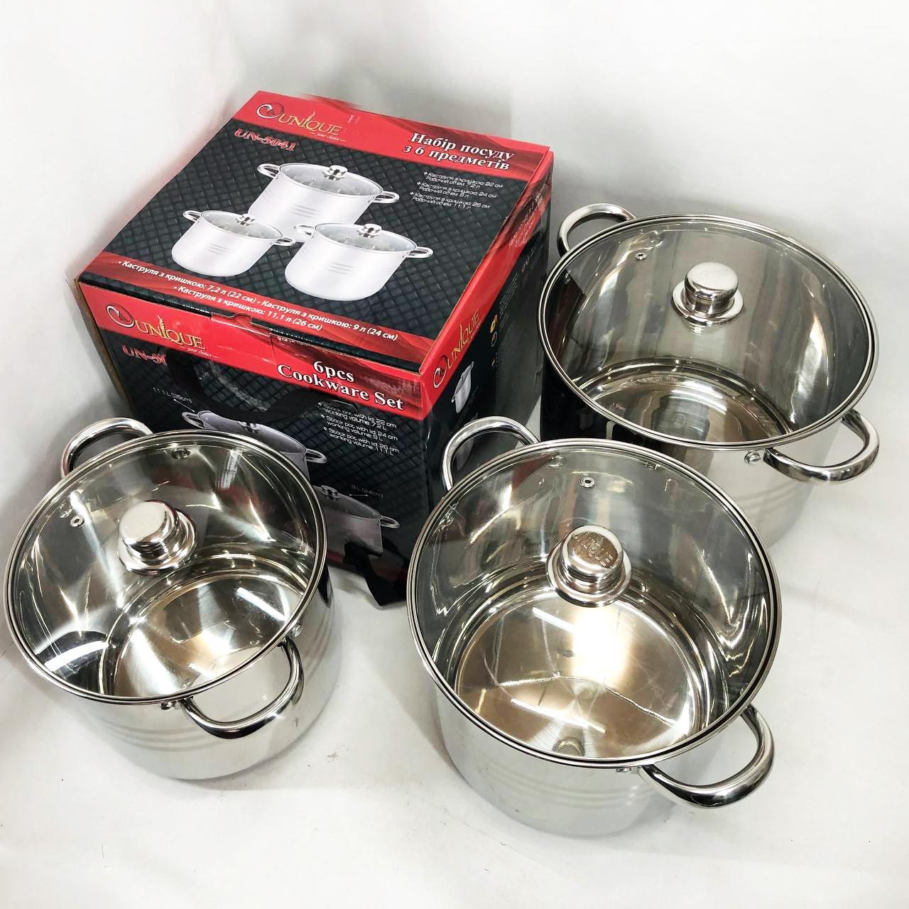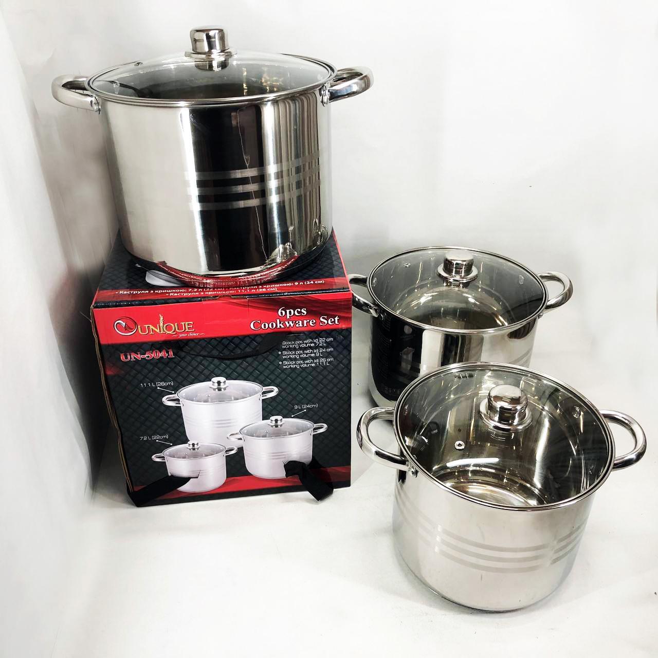 - Об’єм і діаметр кастрюль у наборі: