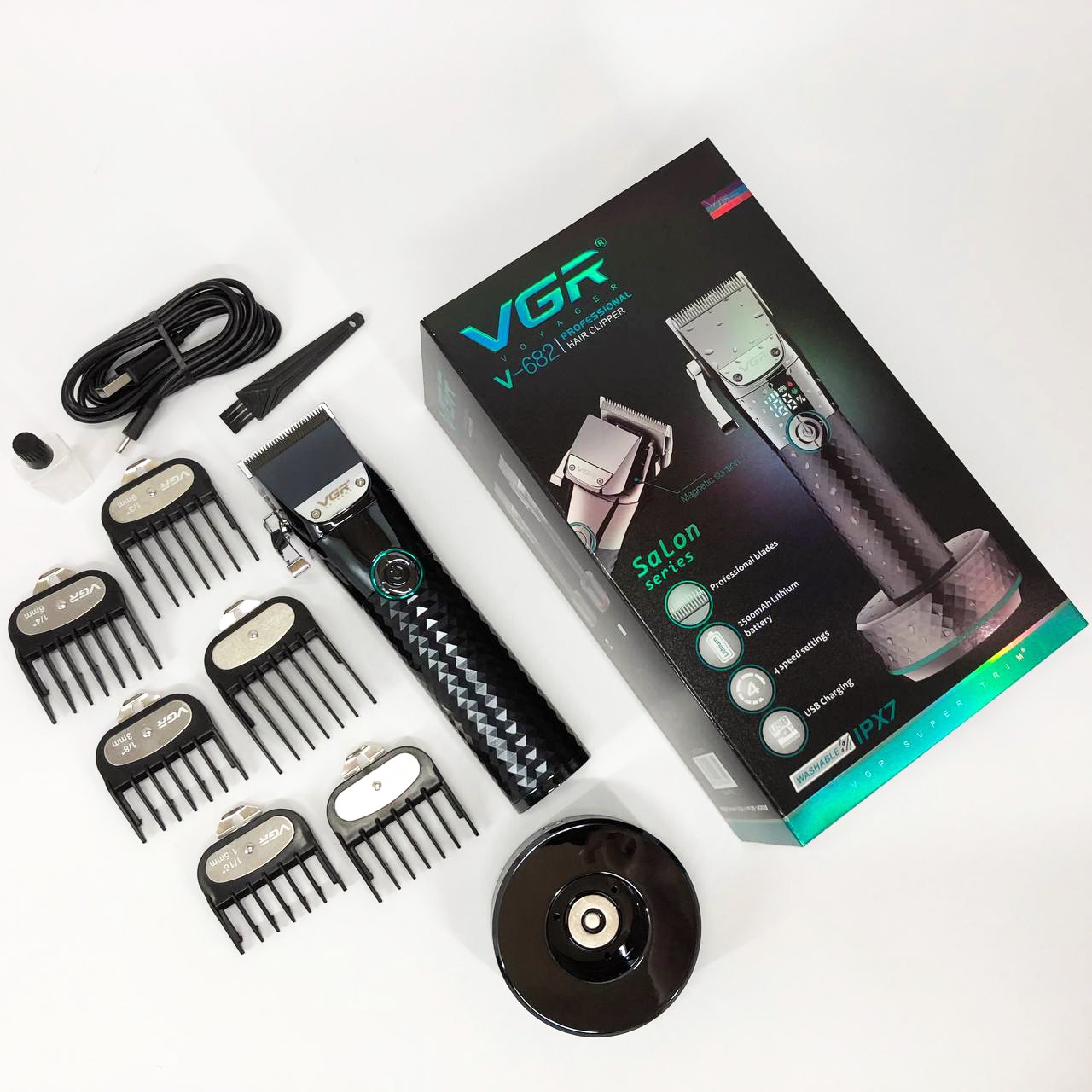VGR V-682 — це потужна професійна машинка для стрижки волосся, бороди та вусів, створена для тих, хто цінує якість, комфорт та сучасний дизайн. Модель поєднує леза з нержавіючої сталі, 4 режими швидкості та зручну підставку-зарядку, що робить її ідеальною як для домашнього використання, так і для перукарень.