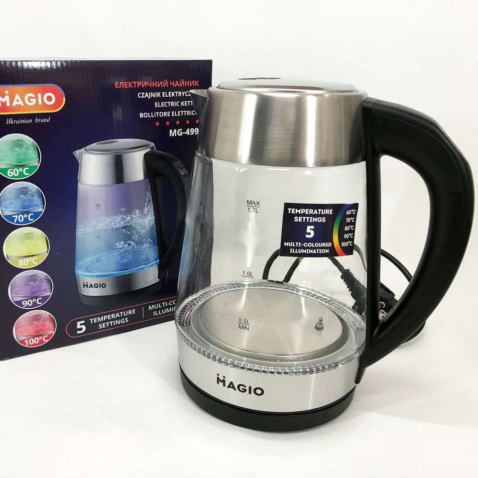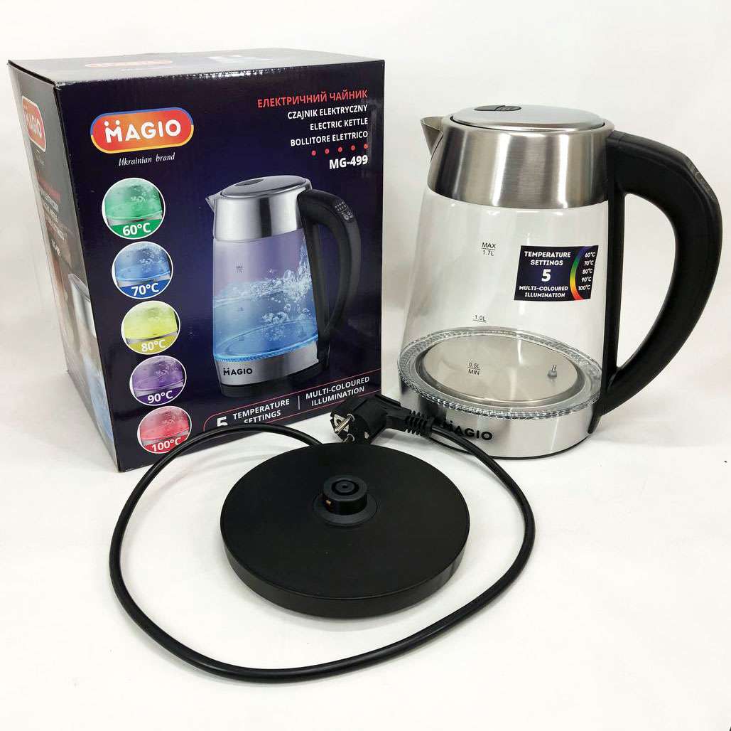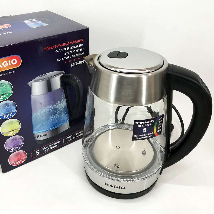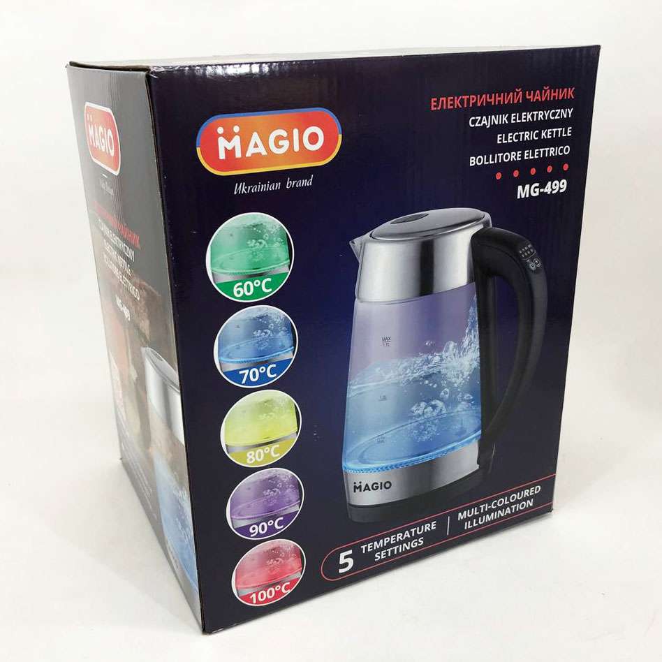 Чайник MG-499 об’ємом 1,7 л поєднує в собі стильний дизайн із чудовою якістю та довговічністю. Корпус виготовлений з прозорого термостійкого скла, завдяки чому у воді просто ні звідки з’явитися неприємним присмакам або навіть небезпечним для здоров’я речовинам. Внутрішній світловий індикатор роботи ефектно осяює киплячу воду різнобарвним підсвічуванням. При натисканні кнопки механізм відкриття кришки спрацьовує м’яко і плавно, виключаючи розбризкування конденсату з кришки. Прихований нагрівальний елемент забезпечує швидке кип’ятіння, надійність та простоту очищення чайника, а вбудований контролер захищає від перегріву. Комплексна система безпеки для запобігання короткому замиканню та википанню води. Захист від перегріву забезпечить автоматичне вимкнення при недостатньому рівні води.