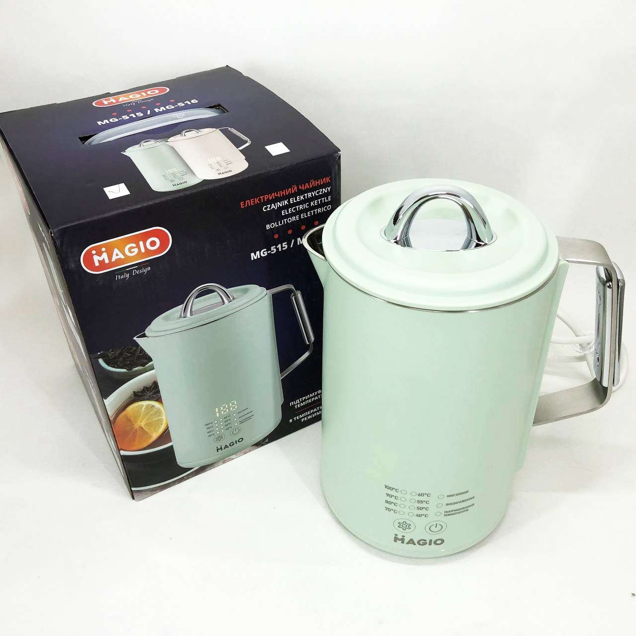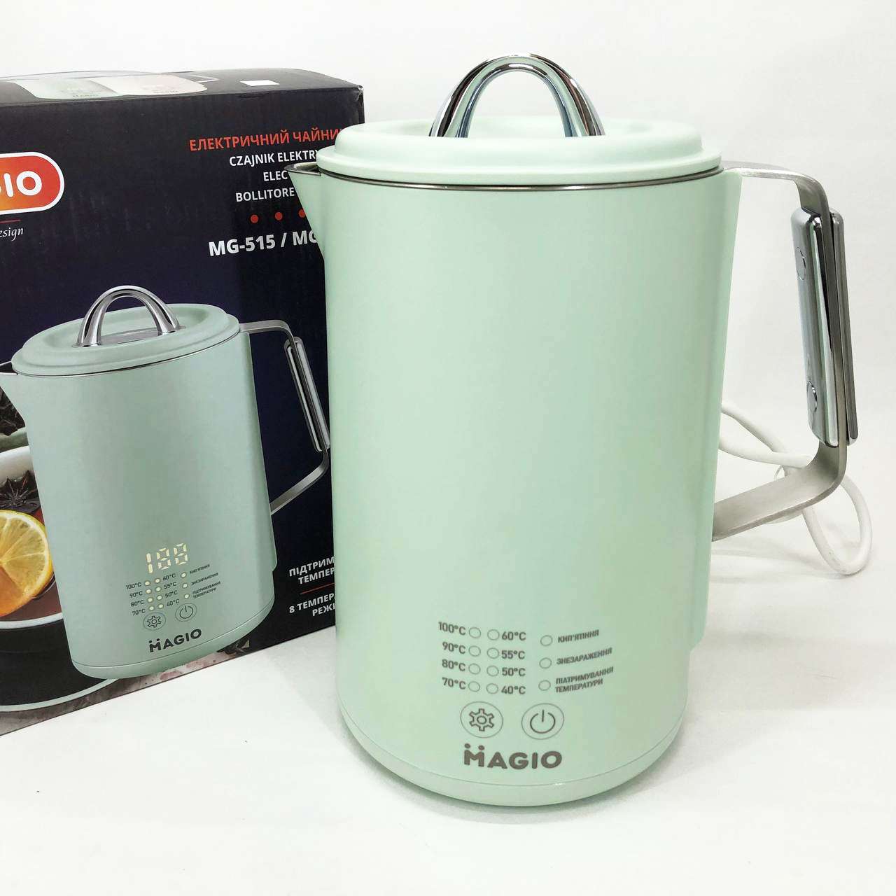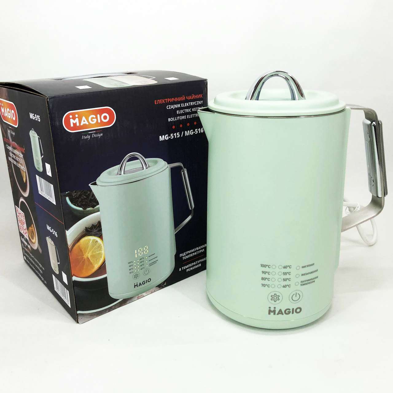 Magio MG-518 – це не просто чайник, а справжній помічник для любителів чаю та кави. Завдяки функції регулювання температури (від 40°C до 100°C) ви зможете вибрати ідеальний режим для заварювання зеленого, чорного, трав’яного чаю або дитячих сумішей. дисплей здійснює управління простим та інтуїтивно зрозумілим.