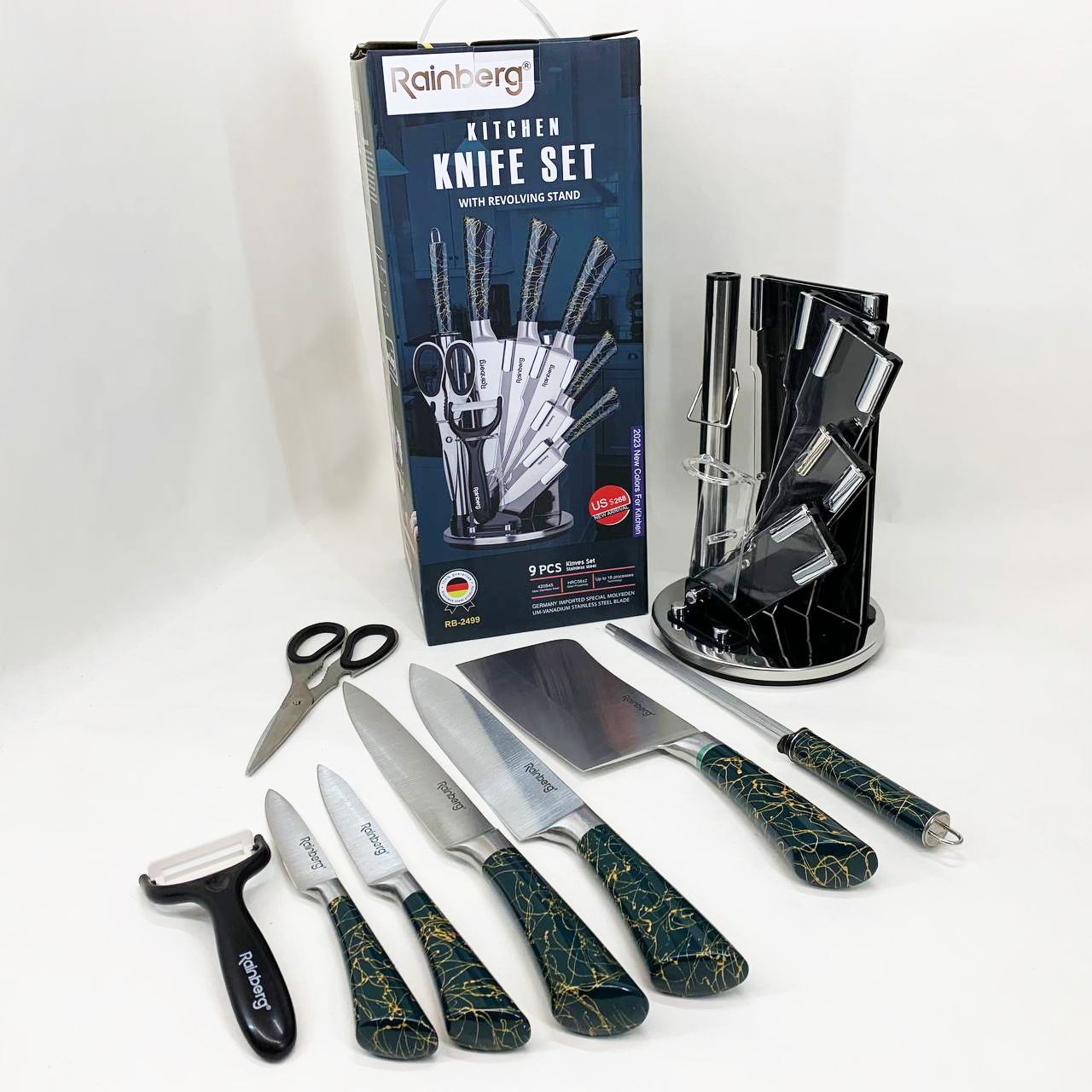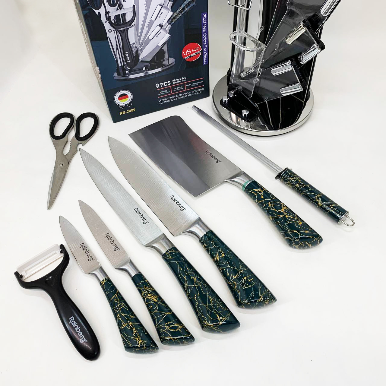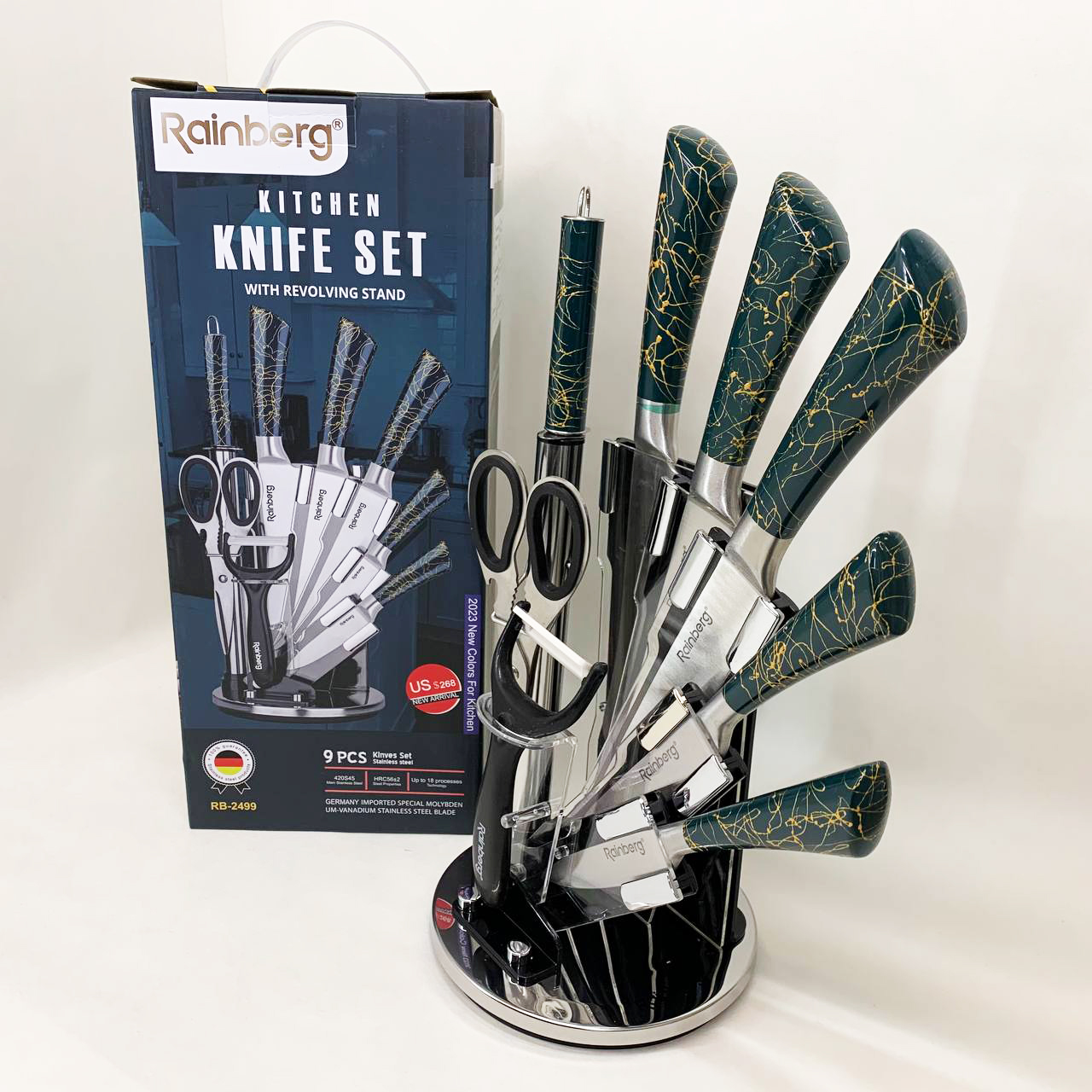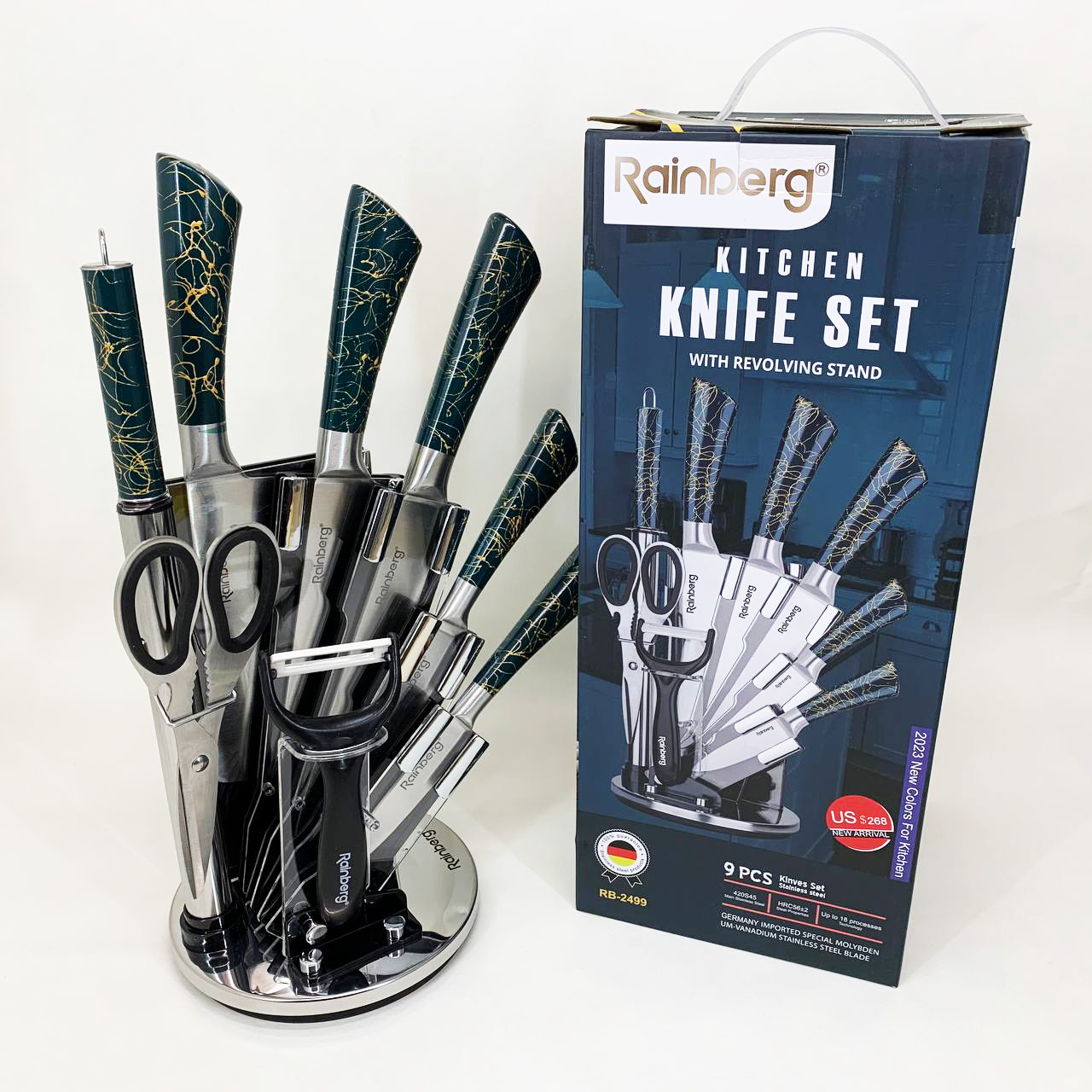 Набір ножів Rainberg RB-2499 – це стильне та функціональне рішення для сучасної кухні. В комплект входить 9 предметів, включаючи 5 універсальних ножів, кухонні ножиці, точило, овочечистку і підставку, що обертається. Завдяки ергономічним ручкам та гострим лезам з нержавіючої сталі, набір забезпечує точне та комфортне нарізування будь-яких продуктів — від овочів до м’яса.