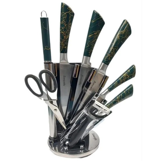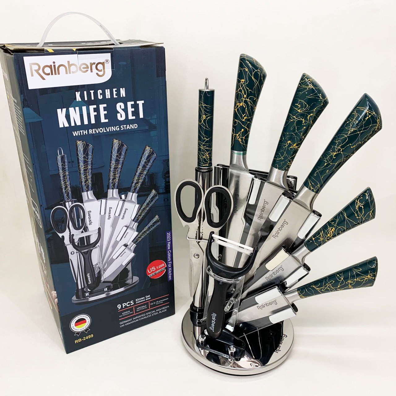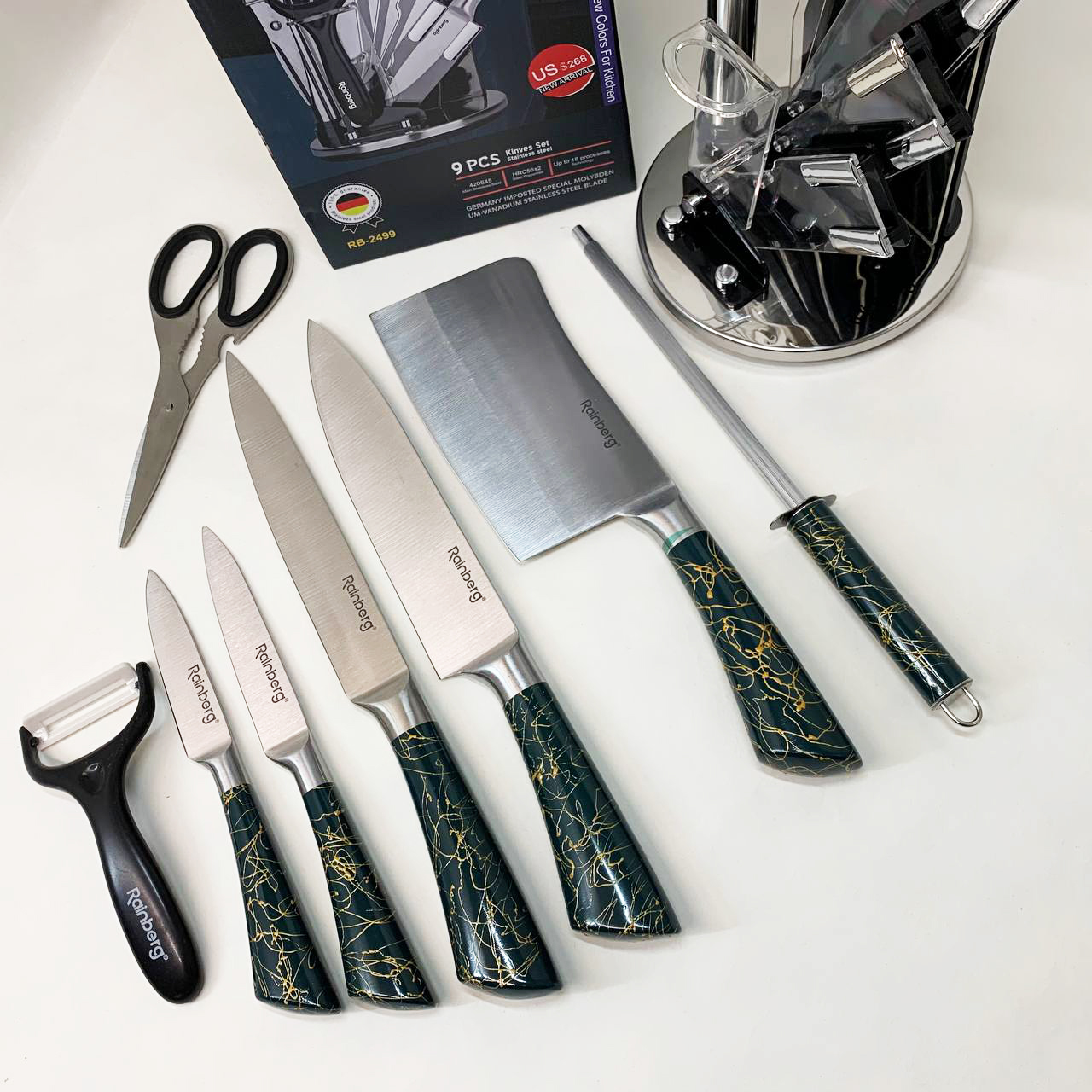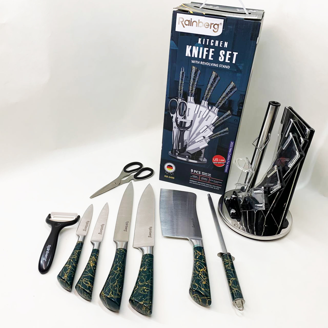 Набір ножів Rainberg RB-2499 – це стильне та функціональне рішення для сучасної кухні. В комплект входить 9 предметів, включаючи 5 універсальних ножів, кухонні ножиці, точило, овочечистку і підставку, що обертається. Завдяки ергономічним ручкам та гострим лезам з нержавіючої сталі, набір забезпечує точне та комфортне нарізування будь-яких продуктів — від овочів до м’яса.