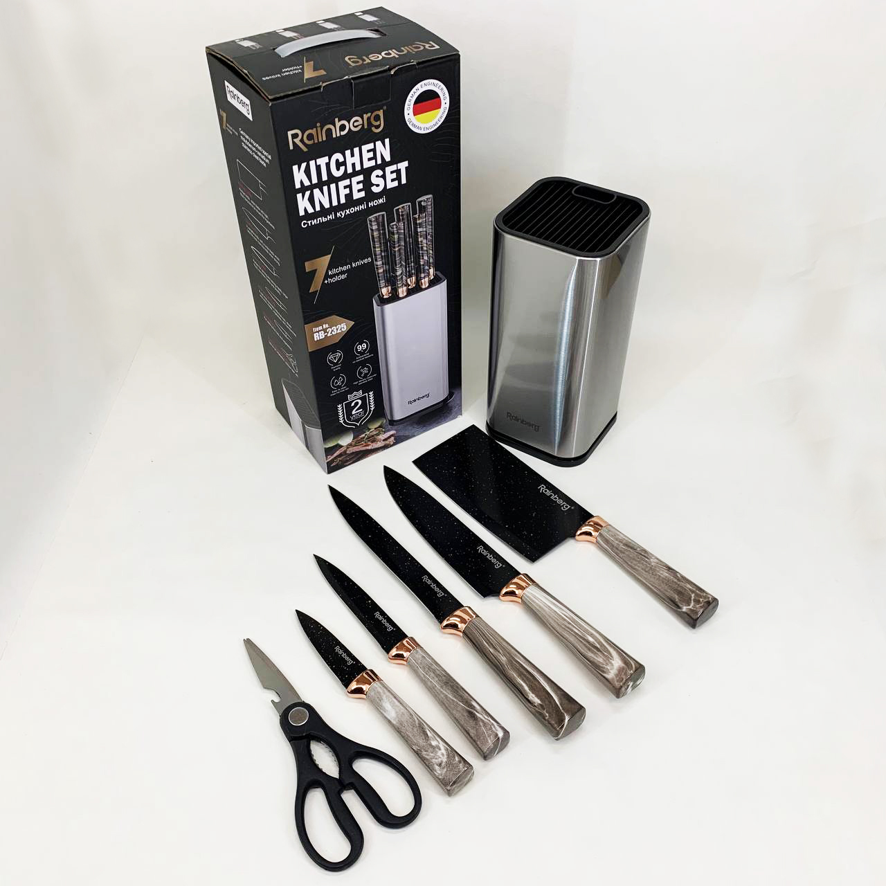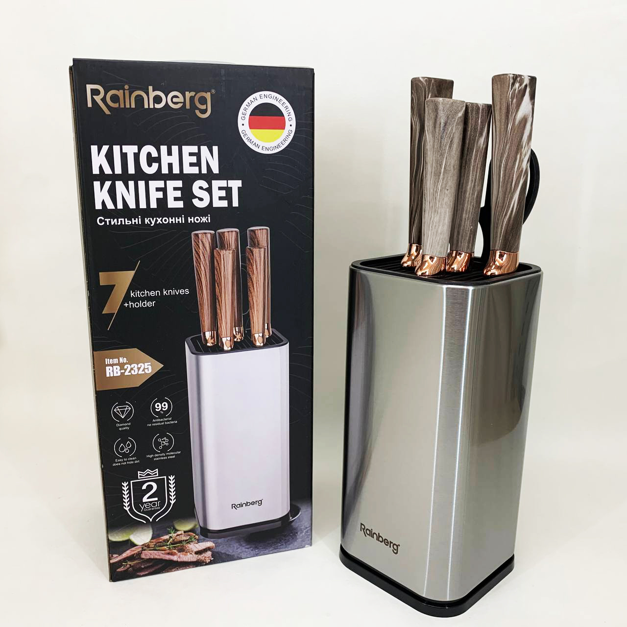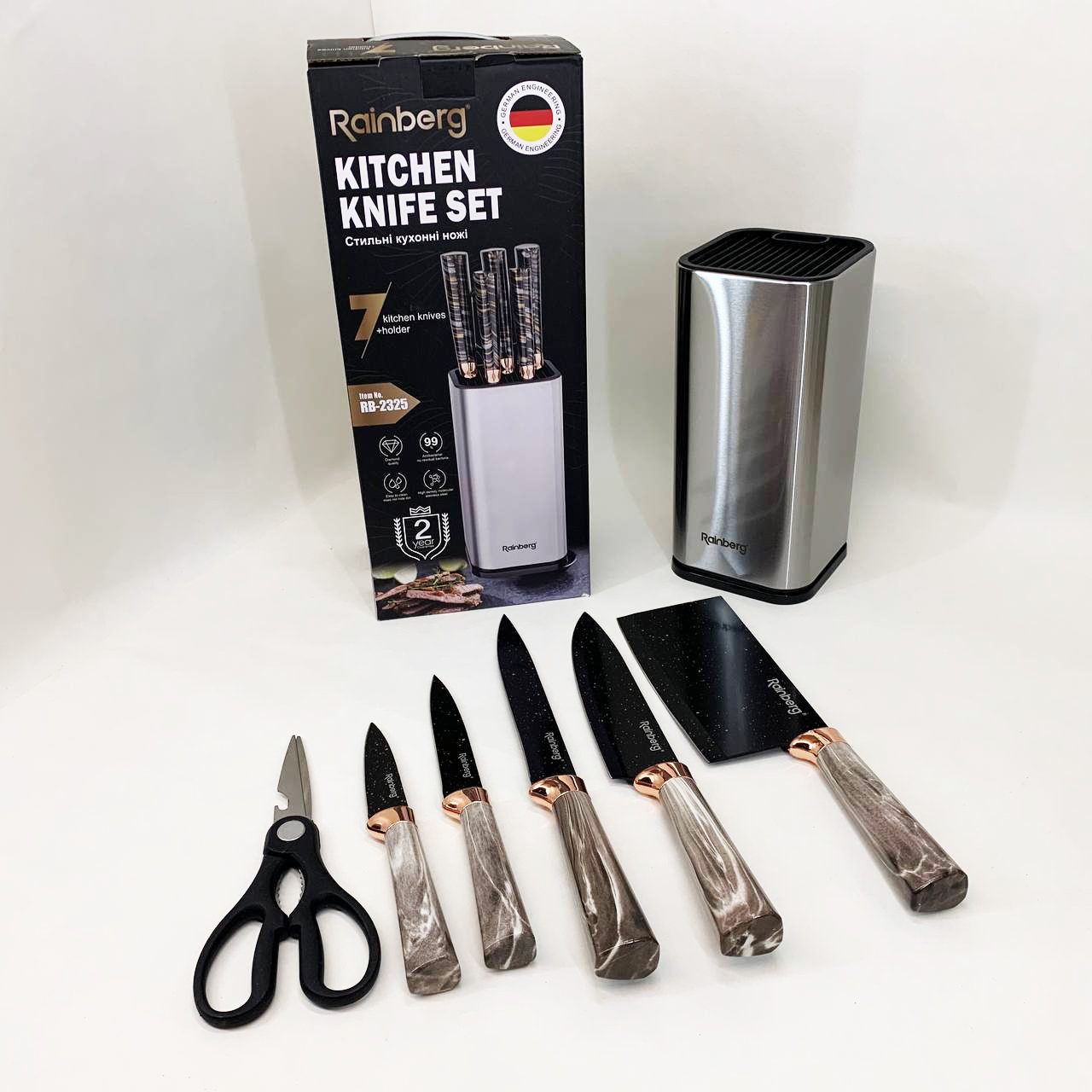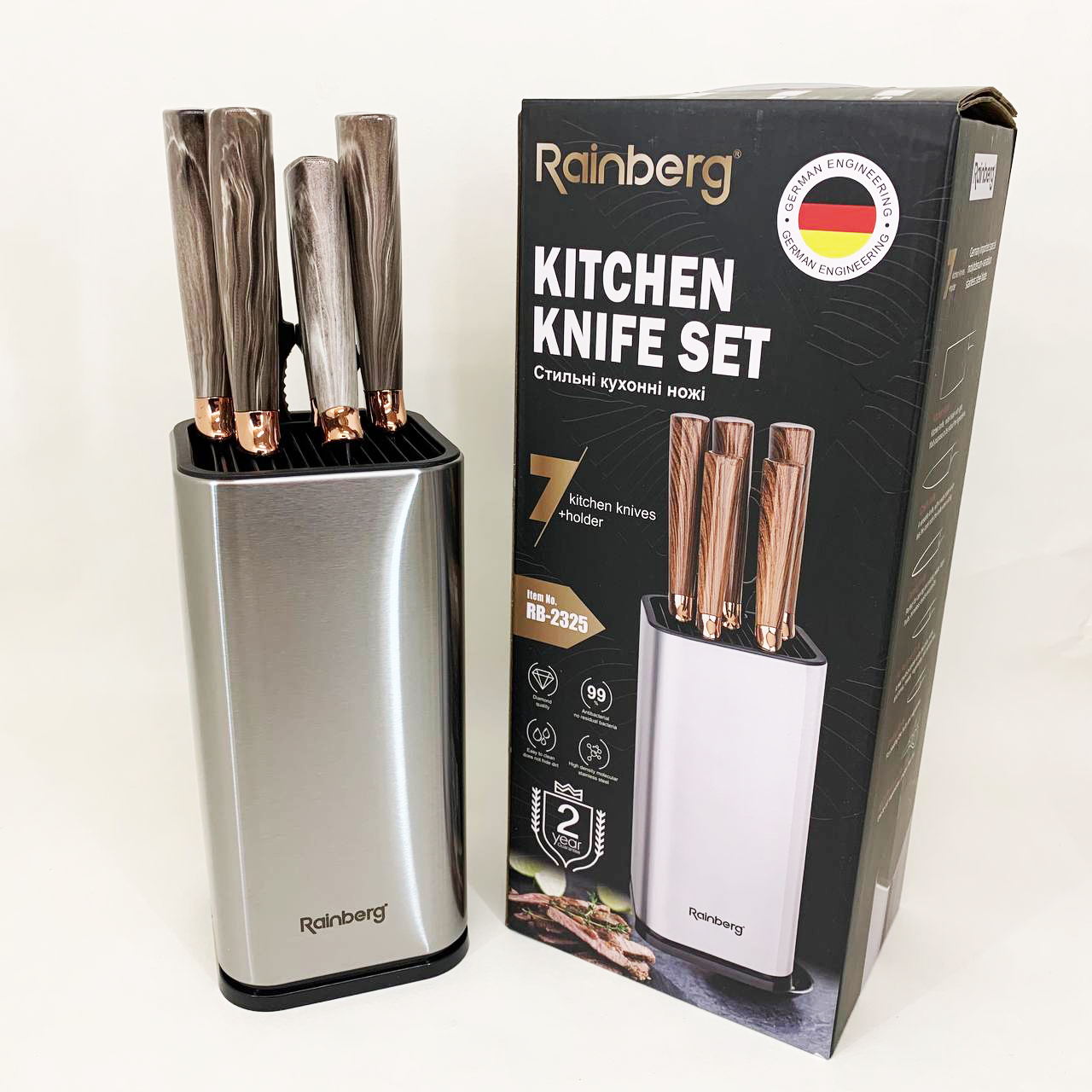 Леза з нержавіючої сталі вкрита декоративним чорним покриттям з білими точками, що підкреслює преміальність набору. Підставка дозволяє зберігати всі елементи в одному місці, забезпечуючи порядок та зручний доступ. Rainberg RB-2325 стане чудовим помічником у приготуванні страв і одночасно прикрасить кухонний простір.