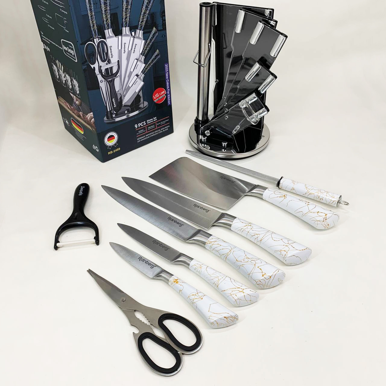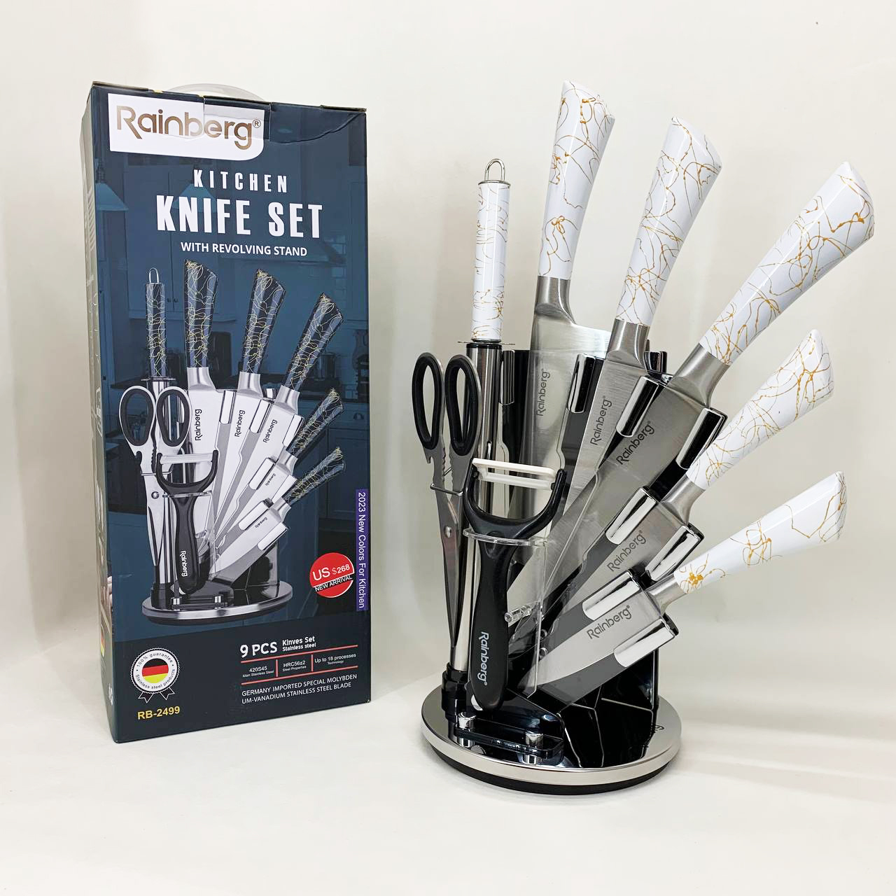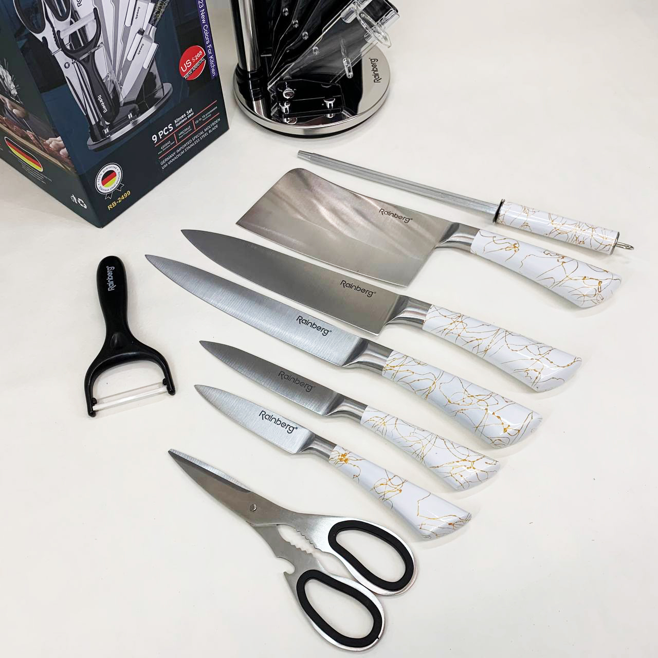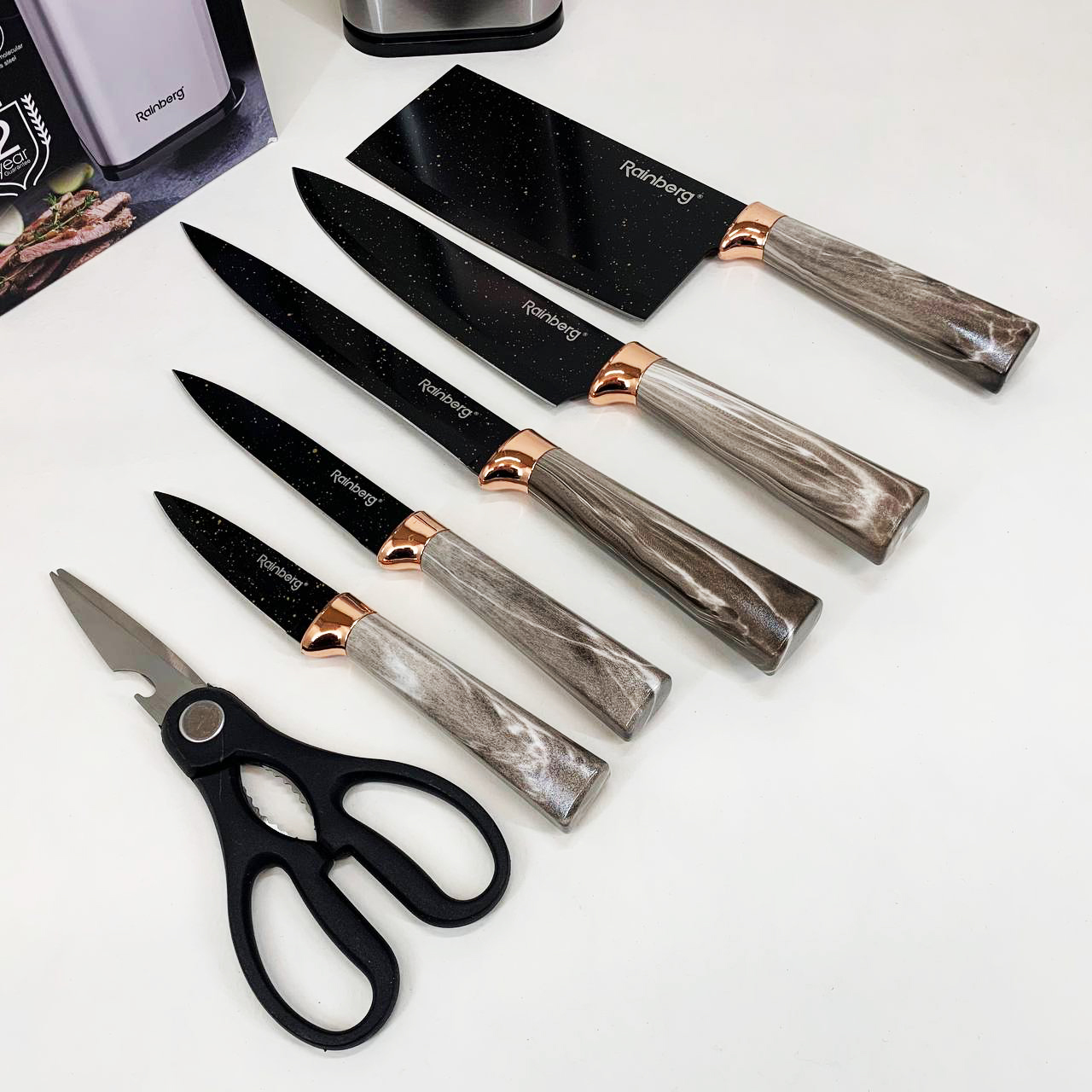 Леза з нержавіючої сталі вкрита декоративним чорним покриттям з білими точками, що підкреслює преміальність набору. Підставка дозволяє зберігати всі елементи в одному місці, забезпечуючи порядок та зручний доступ. Rainberg RB-2325 стане чудовим помічником у приготуванні страв і одночасно прикрасить кухонний простір.