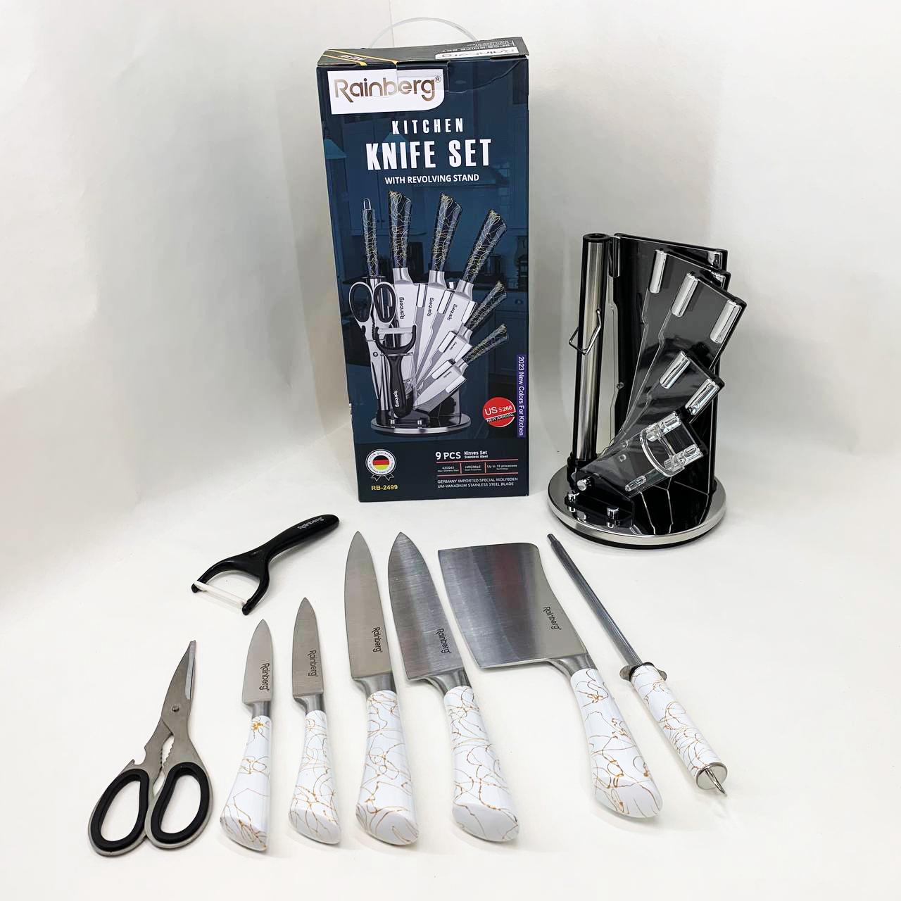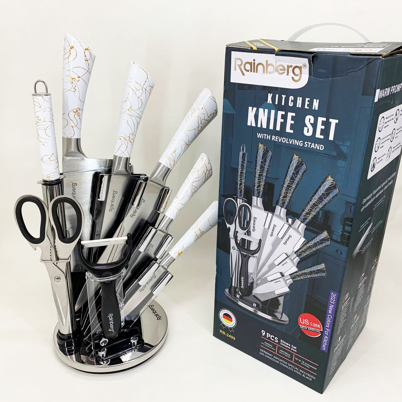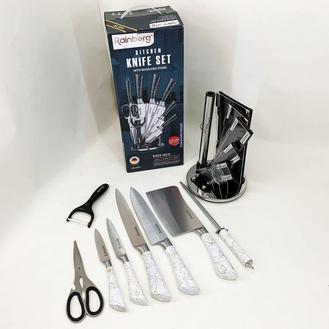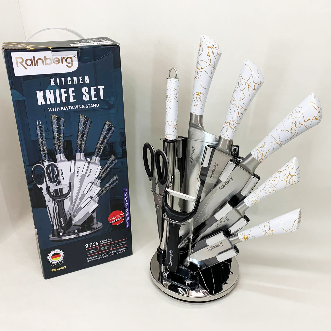 Леза з нержавіючої сталі вкрита декоративним чорним покриттям з білими точками, що підкреслює преміальність набору. Підставка дозволяє зберігати всі елементи в одному місці, забезпечуючи порядок та зручний доступ. Rainberg RB-2325 стане чудовим помічником у приготуванні страв і одночасно прикрасить кухонний простір.