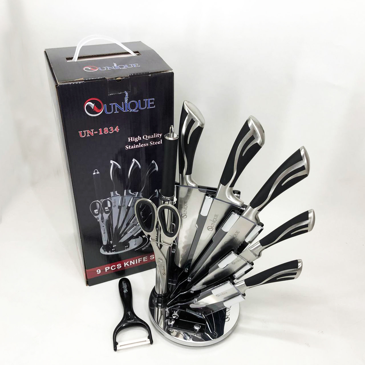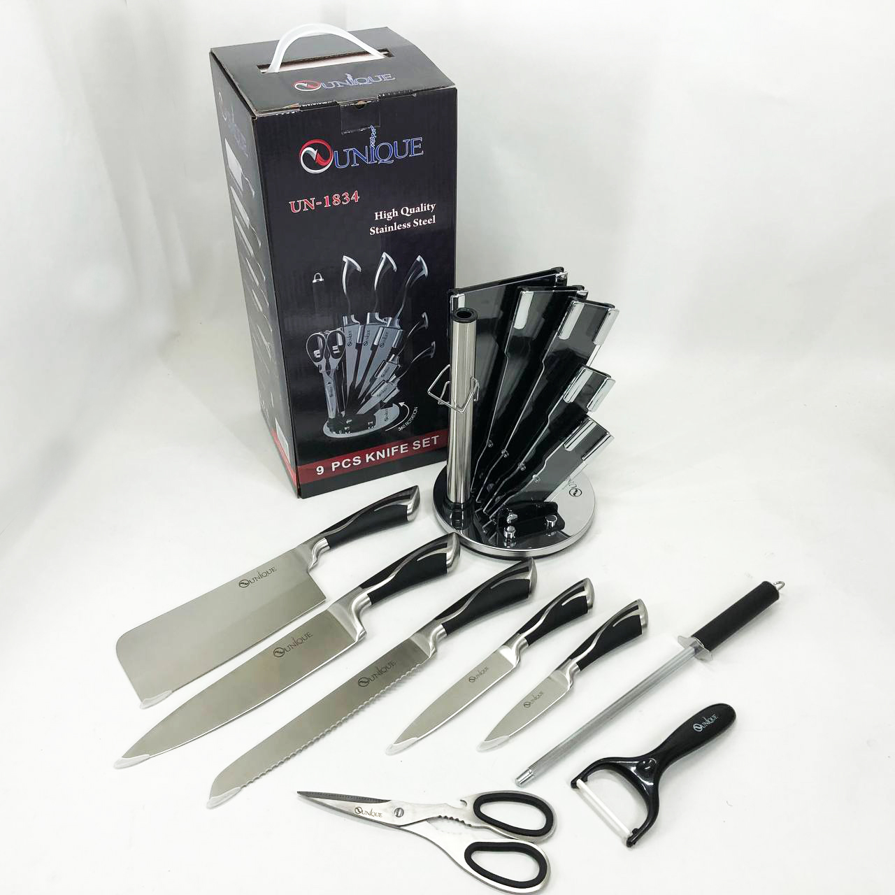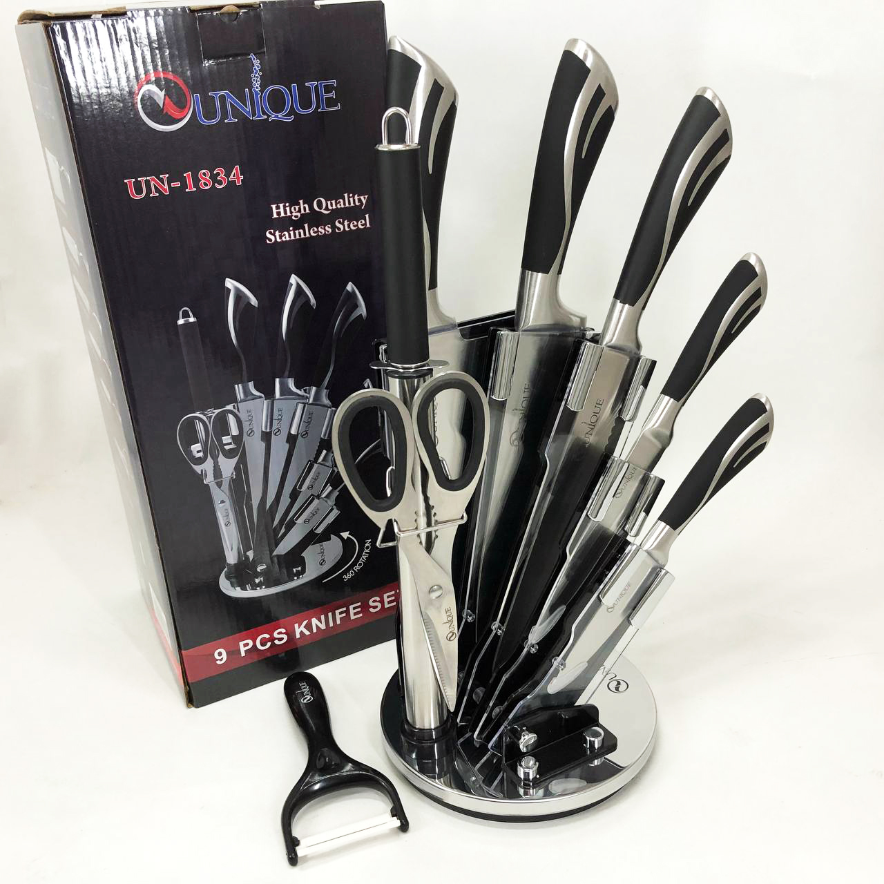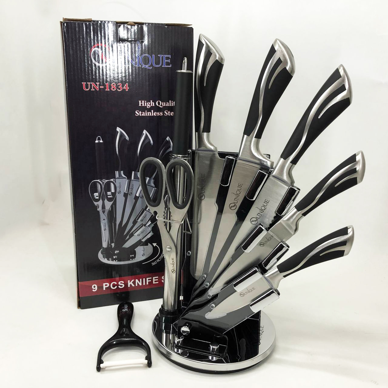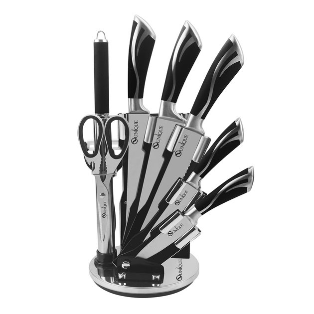 Набір ножів UNIQUE UN-1834 з 9 предметів, що обертається, Ножі кухонні з нержавіючої сталі