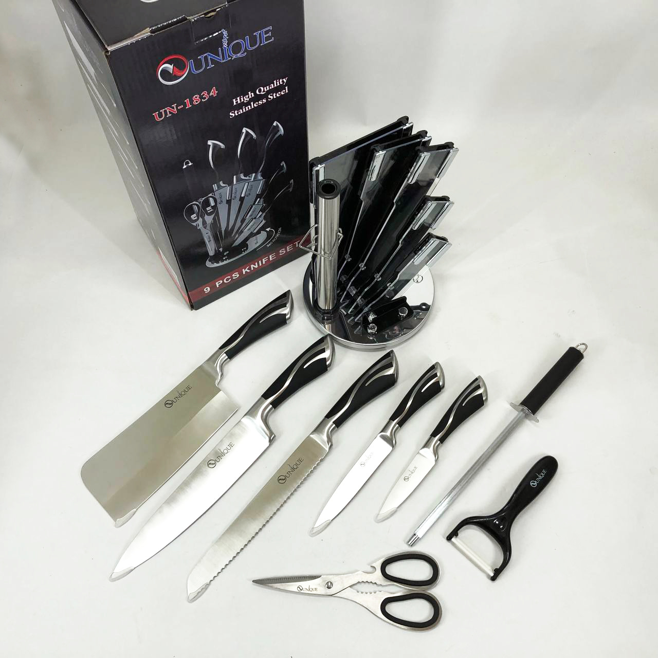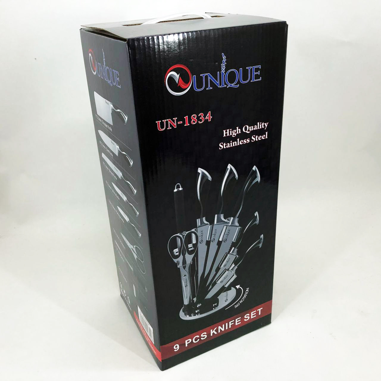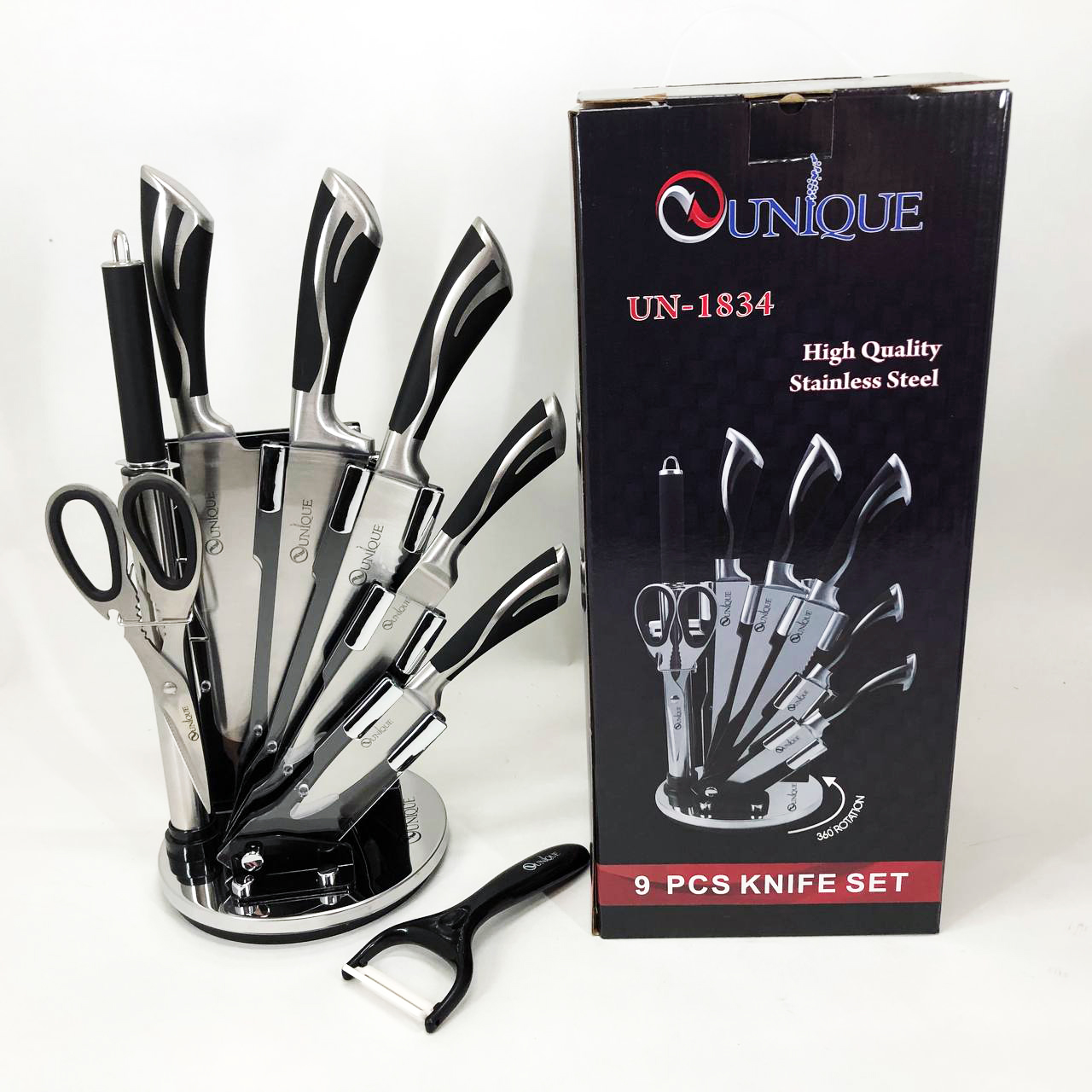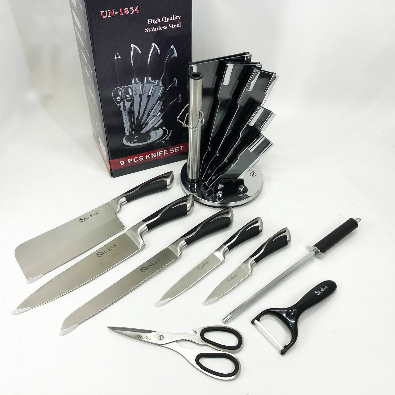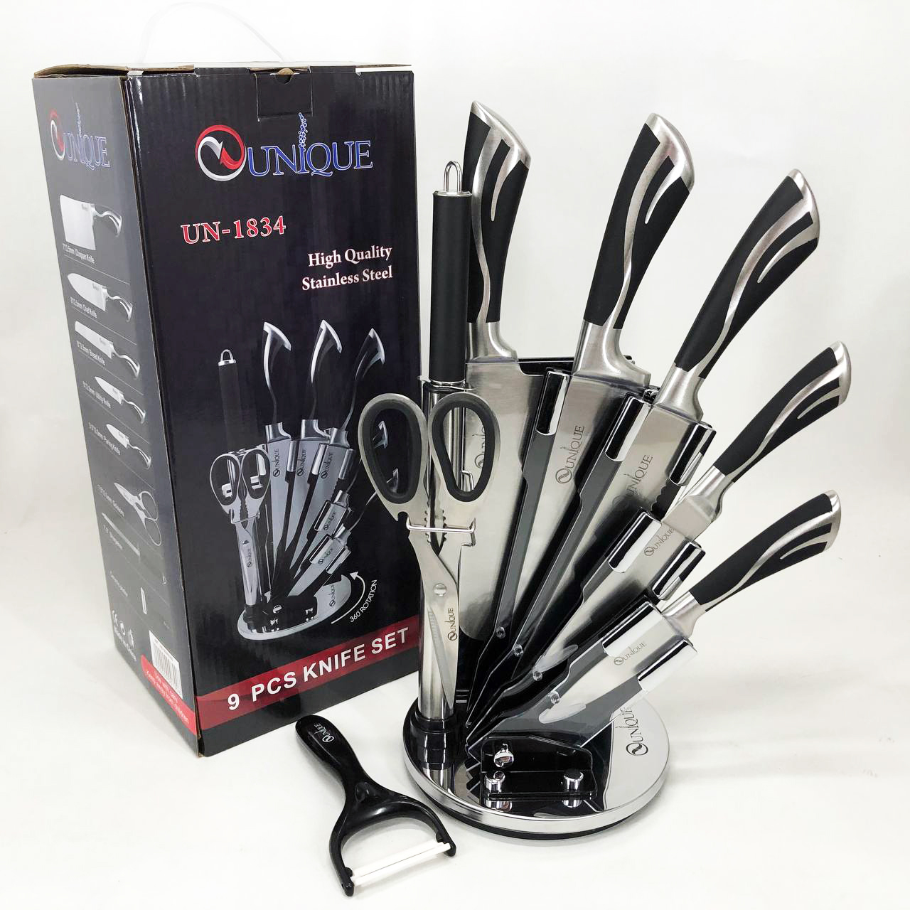 Набір ножів UNIQUE UN-1834 з 9 предметів, що обертається, Ножі кухонні з нержавіючої сталі