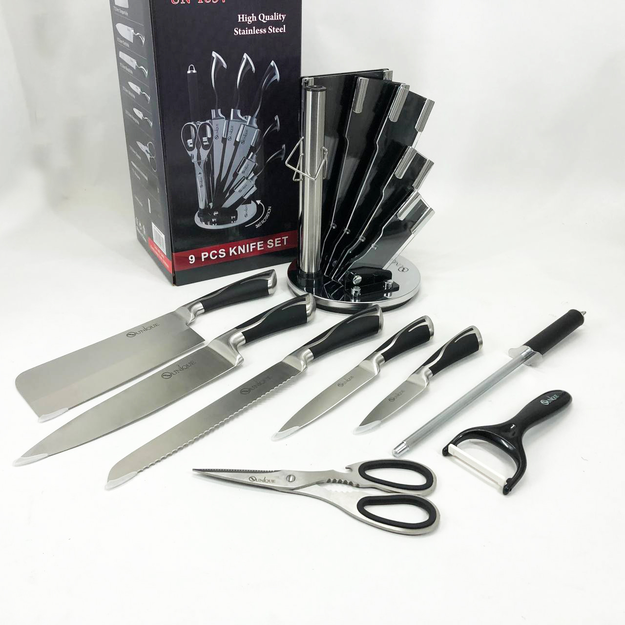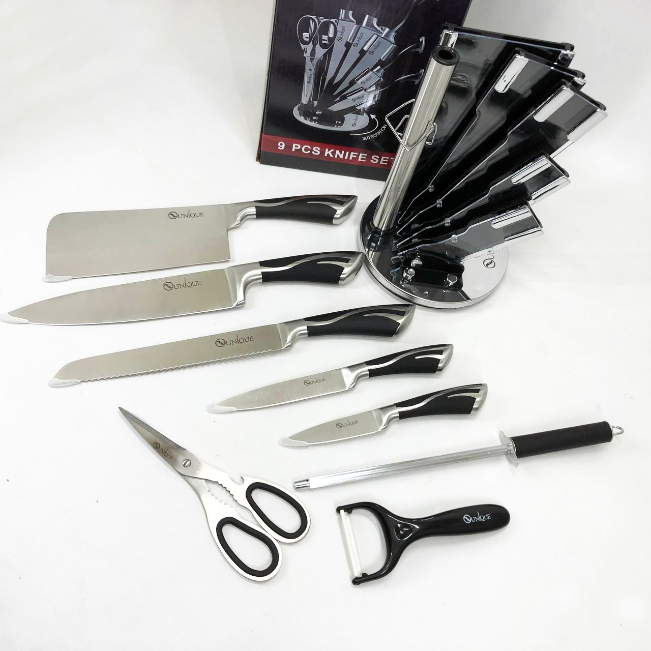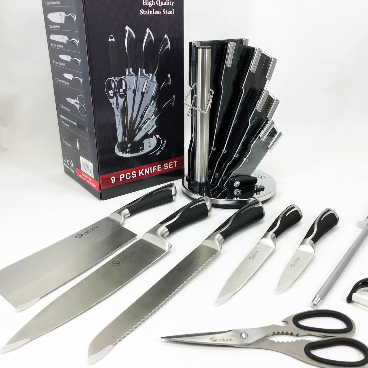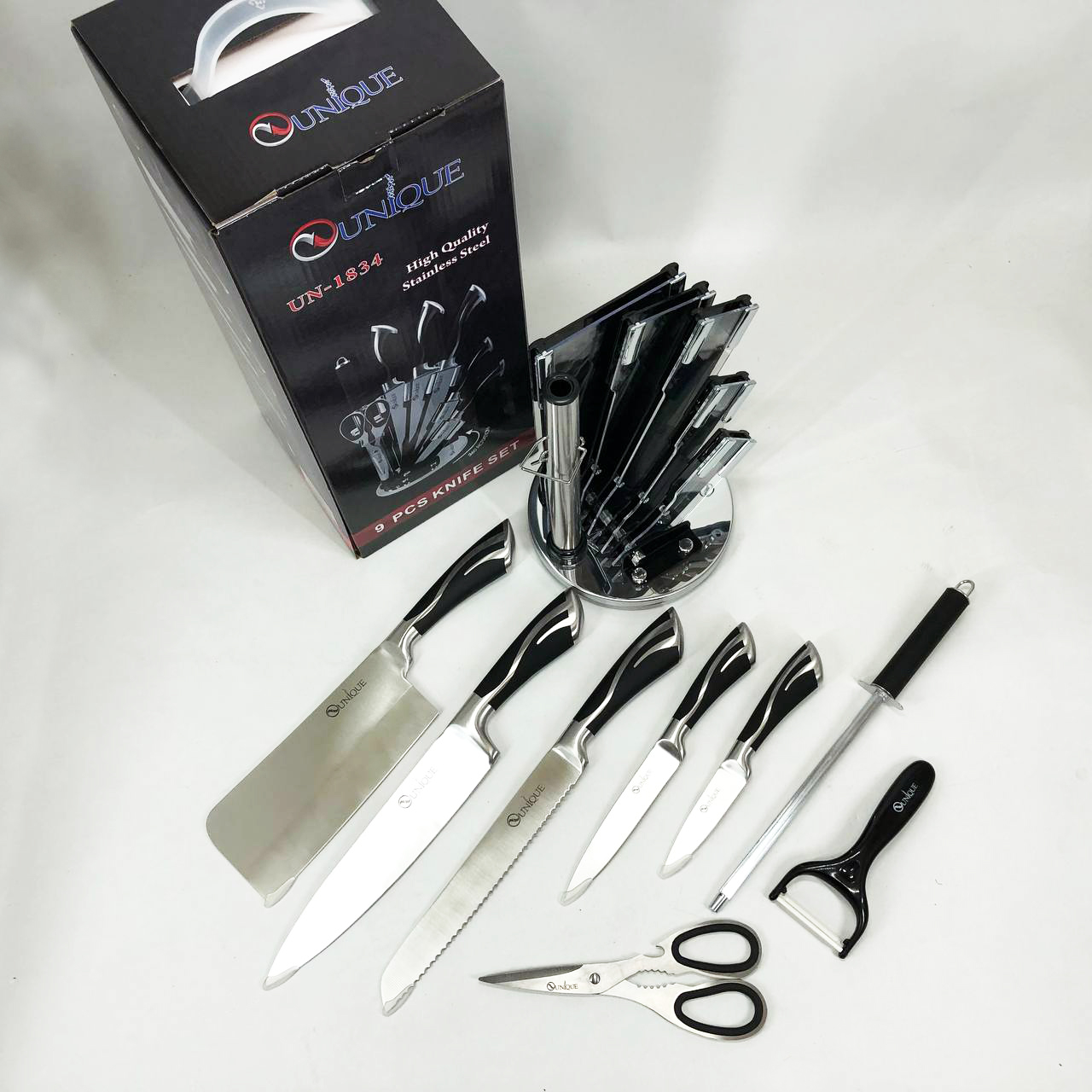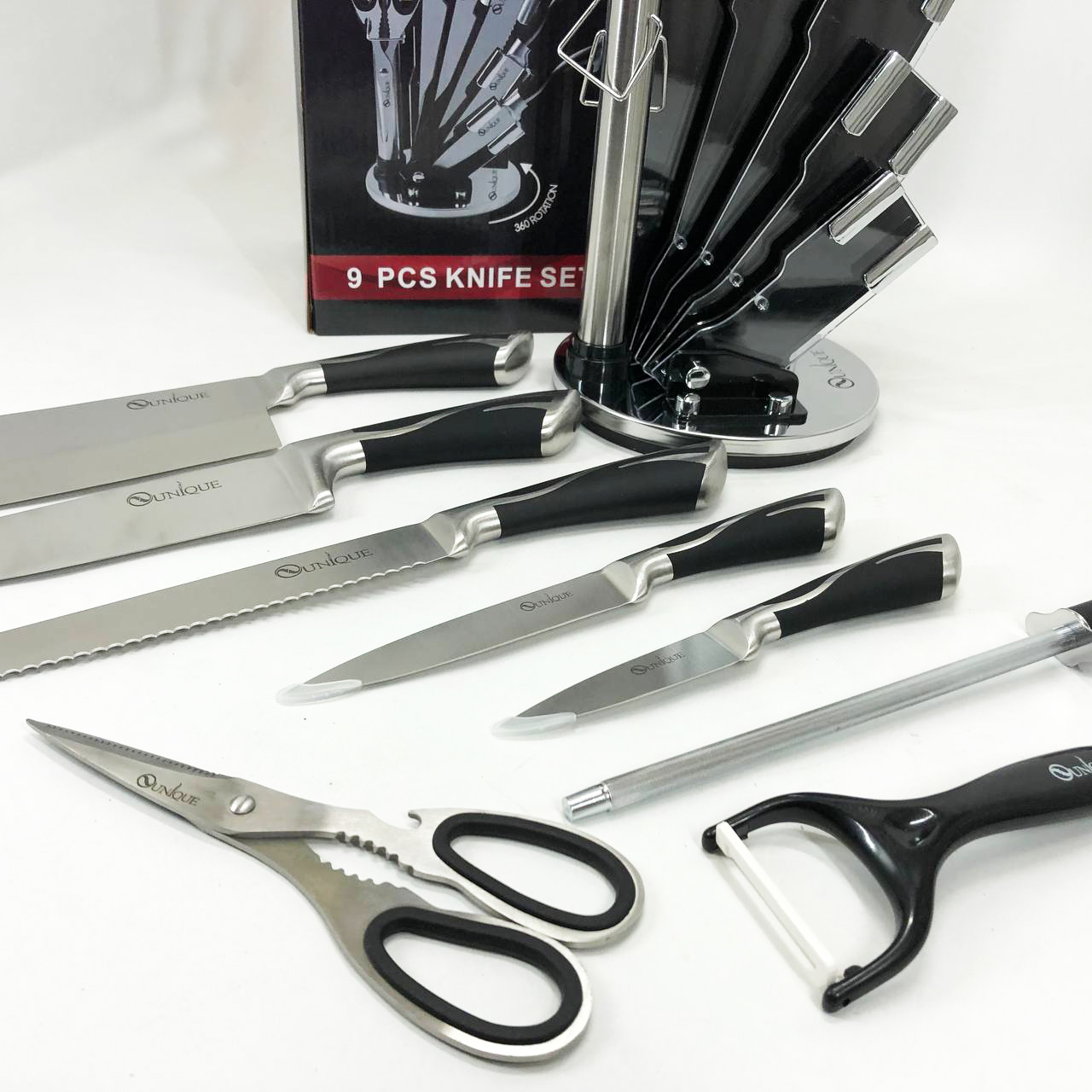 Набір ножів UNIQUE UN-1834 з 9 предметів, що обертається, Ножі кухонні з нержавіючої сталі