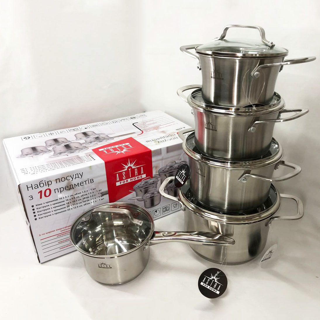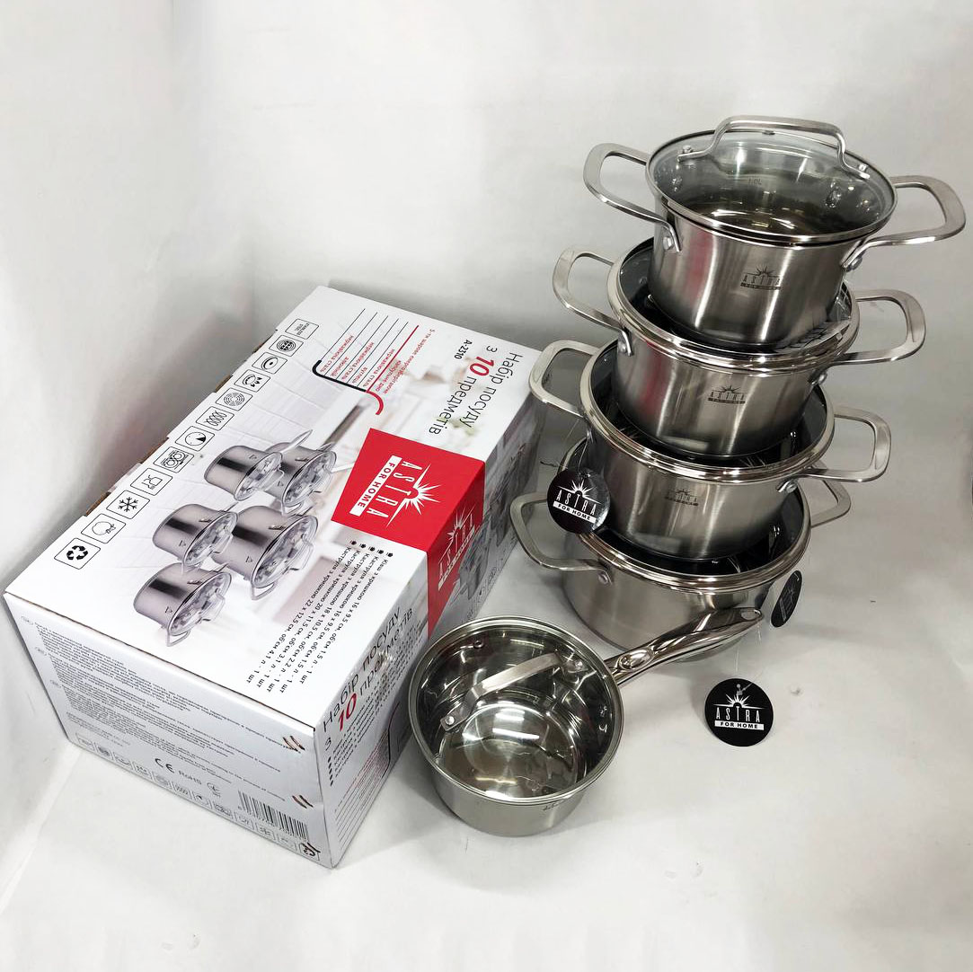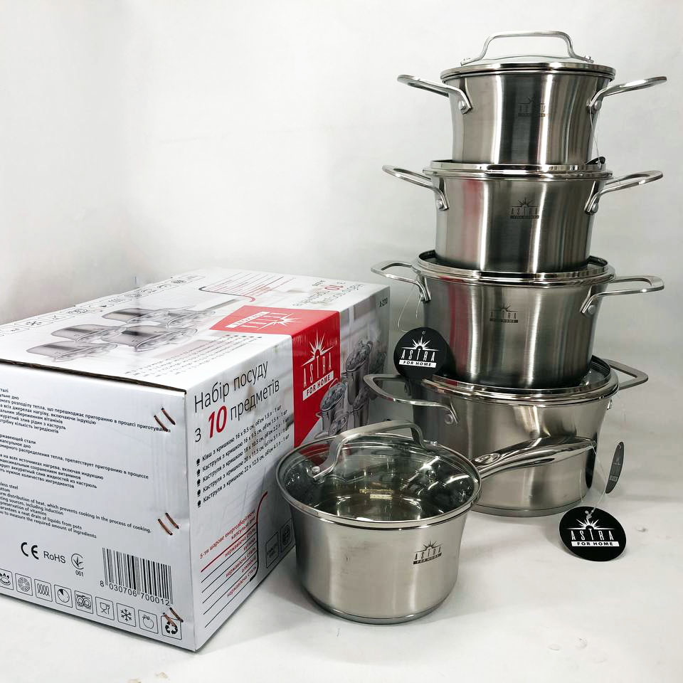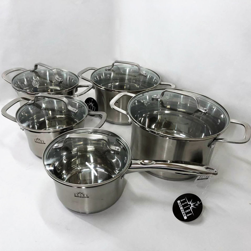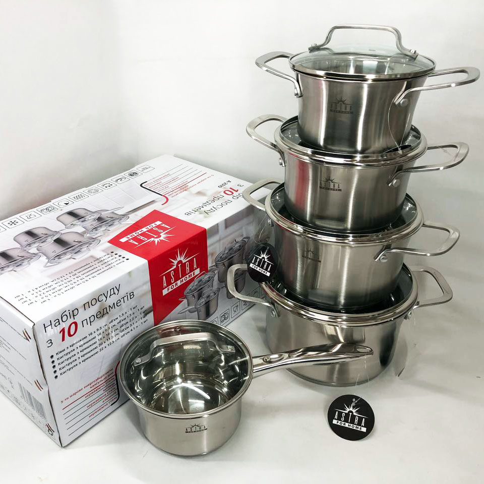 Набір посуду ASTRA виготовлений з високоякісної нержавіючої сталі 18/10 (18% Хром & 10% Нікель) такий матеріал робить набори міцними і довговічними. Посуд на відміну від інших видів металевого посуду не впливає на смак їжі, що готується. Всі ємності мають дзеркальне полірування зовні та матове всередині. П’ятишарове капсульне дно не деформується при нагріванні і забезпечує швидкий і рівномірний розподіл тепла. Ручки каструль клепні, зручно розташовані, ергономічні. Скляні кришки з отвором для виходу пари дозволять контролювати весь процес приготування в оптимальному режимі.