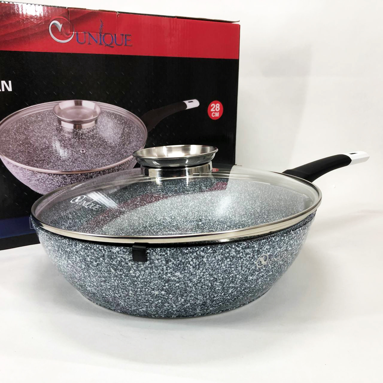 Сковорода UNIQUE виготовлена з литого алюмінію з багатошаровим гранітним антипригарним покриттям. Таке покриття не змінює смаку їжі і не вбирає запахи.