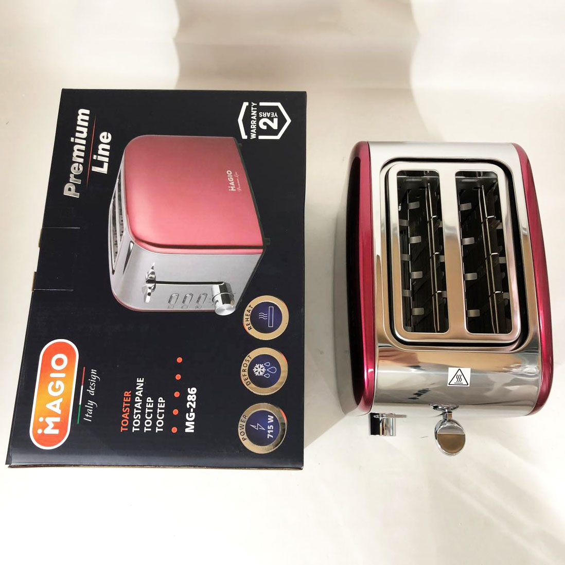 Тостер MG-286 максимально легко впишеться в інтер’єр кухні завдяки лаконічному дизайну. Крім дизайнерської сторони, він ще й відмінно підрум’янить тости до сніданку, оскільки має потужність 715 Вт. Завдяки режиму розморожування можна з легкістю використовувати хліб, що зберігається в холодильнику, а 6 режимів підсмажування дозволяє самостійно контролювати ступінь зарум’янювання тостів. Вам не доведеться контролювати приготування тостів, оскільки у пристрої є автоматичний викид хліба, а з піддоном для крихт кухня завжди залишиться чистою та акуратною.