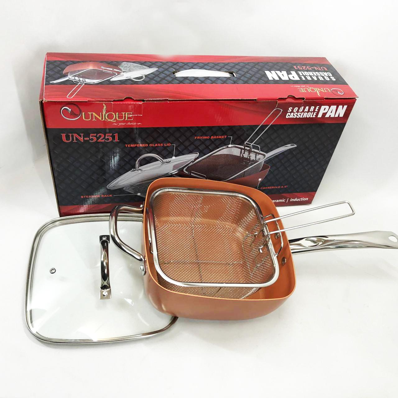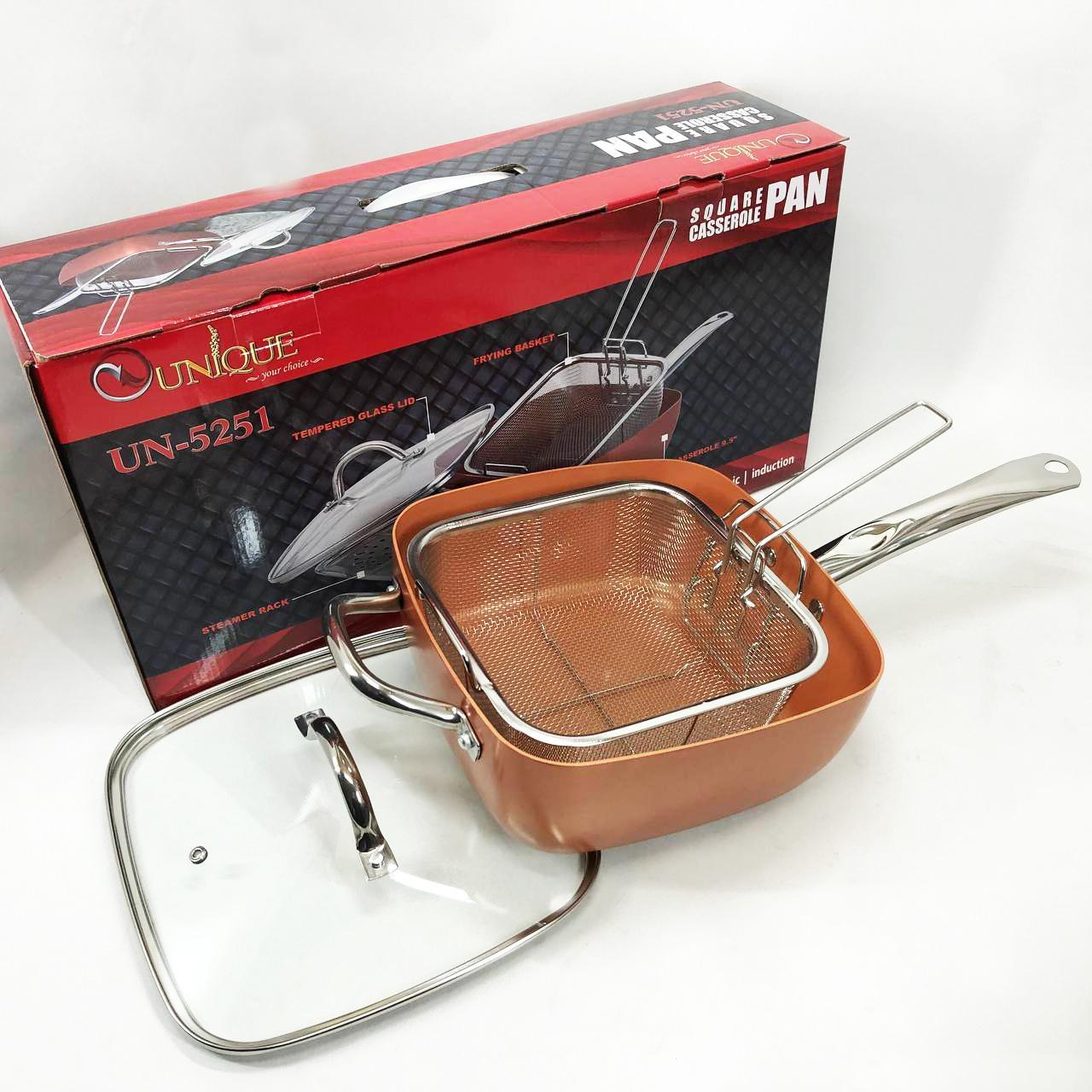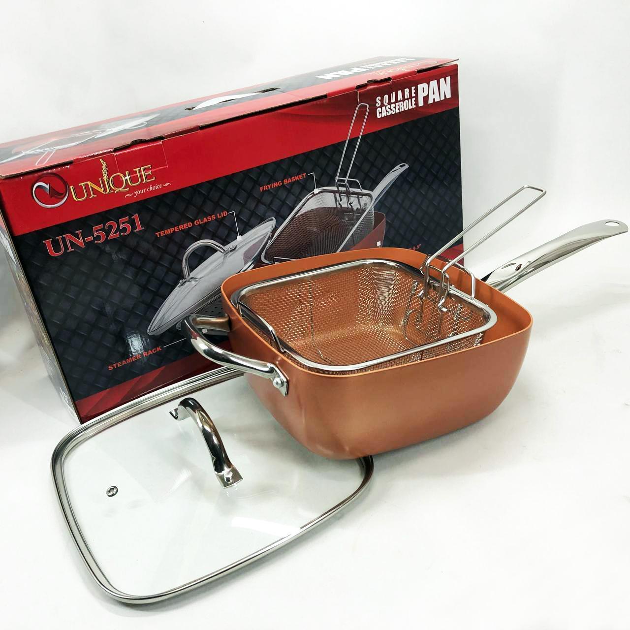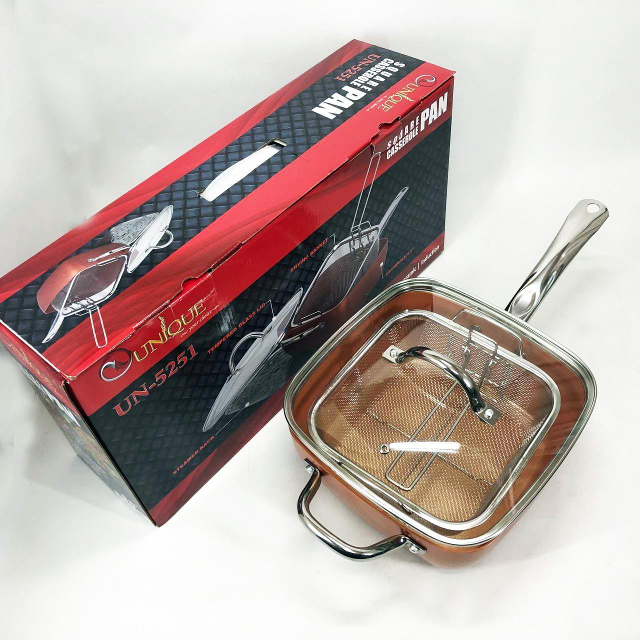 Сковорода-фритюрниця Unique UN-5251 — це справжнє технологічне диво для вашої кухні, яке здатне замінити цілий набір кухонного посуду. Завдяки глибокій квадратній формі та високим прямим стінкам, цей виріб поєднує в собі функції класичної сковороди, місткої каструлі та сотейника. Спеціальний медно-керамічний сплав Ti-Cerama створює надміцний антипригарний шар, що дозволяє смажити продукти при температурі 180°C без прилипання та використання зайвого жиру. Особливістю моделі є її універсальність: ви можете варити супи, смажити хрустку картоплю фрі, готувати здорову їжу на пару або навіть використовувати її як форму для випікання в духовці. Товсті стінки рівномірно розподіляють жар, створюючи ефект томління, що робить смак страв незабутнім.