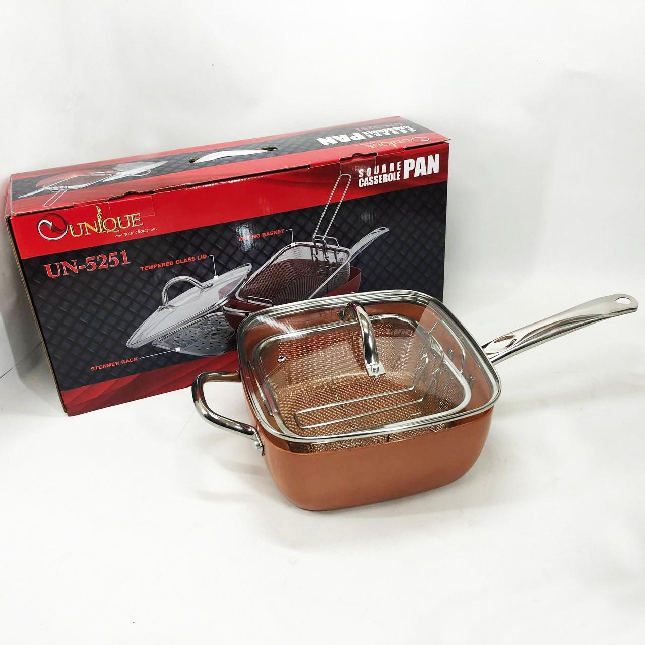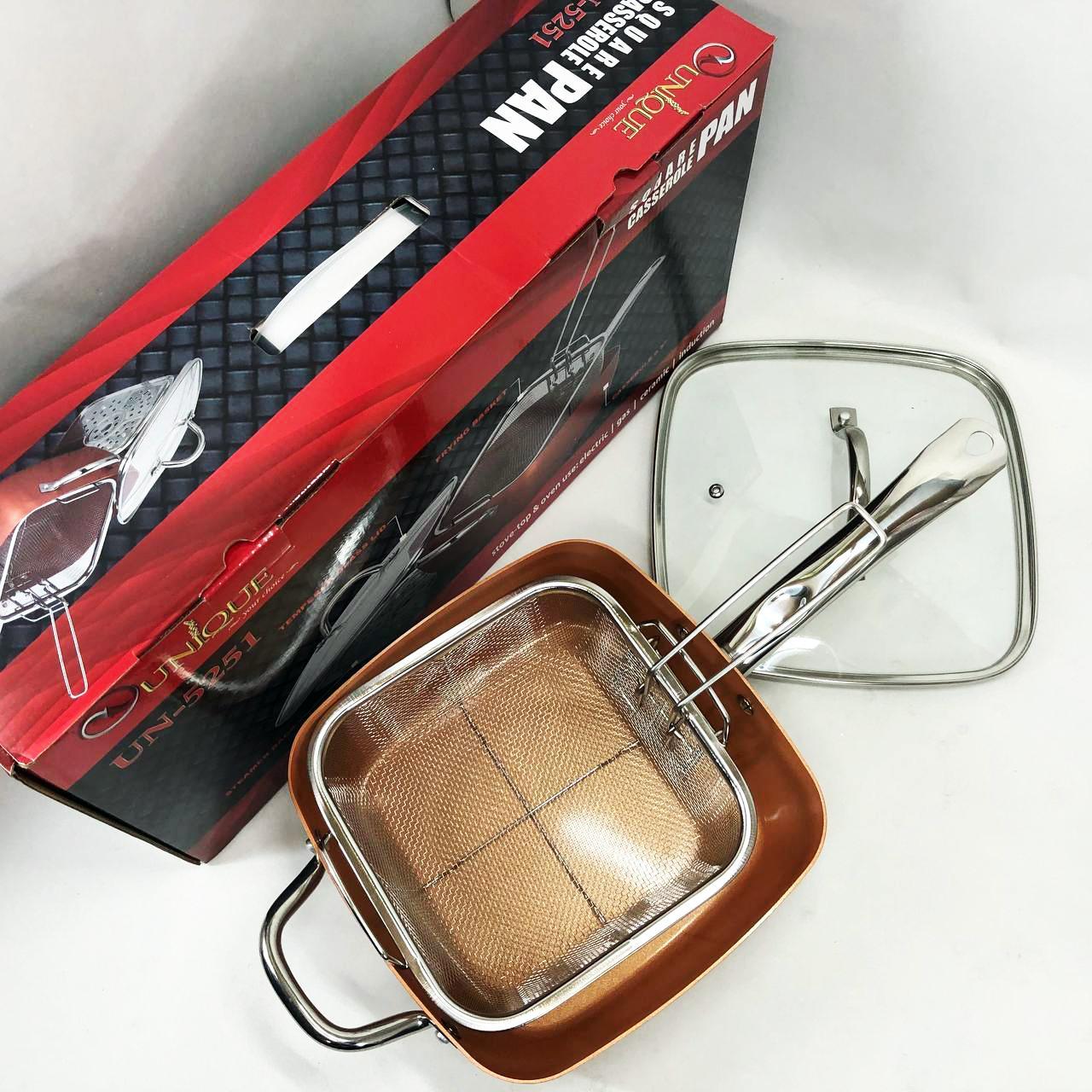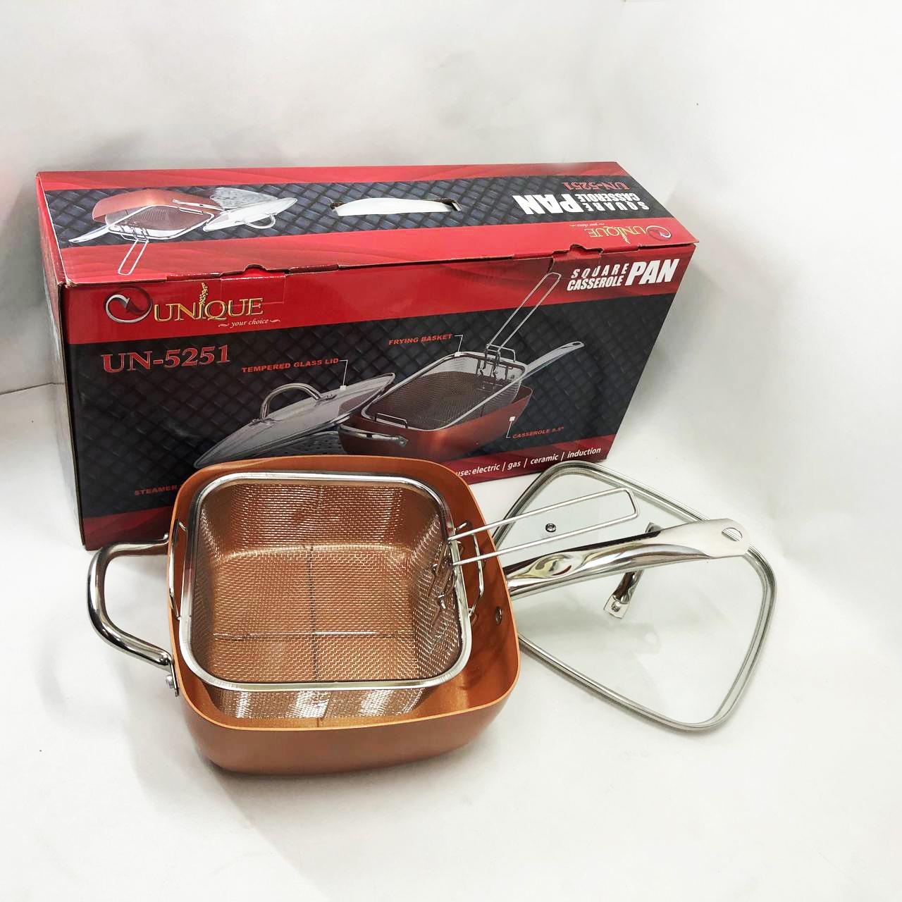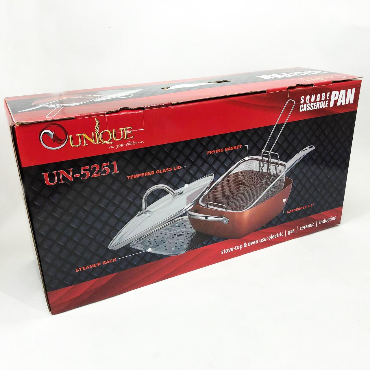 Сковорода-фритюрниця Unique UN-5251 — це справжнє технологічне диво для вашої кухні, яке здатне замінити цілий набір кухонного посуду. Завдяки глибокій квадратній формі та високим прямим стінкам, цей виріб поєднує в собі функції класичної сковороди, місткої каструлі та сотейника. Спеціальний медно-керамічний сплав Ti-Cerama створює надміцний антипригарний шар, що дозволяє смажити продукти при температурі 180°C без прилипання та використання зайвого жиру. Особливістю моделі є її універсальність: ви можете варити супи, смажити хрустку картоплю фрі, готувати здорову їжу на пару або навіть використовувати її як форму для випікання в духовці. Товсті стінки рівномірно розподіляють жар, створюючи ефект томління, що робить смак страв незабутнім.
