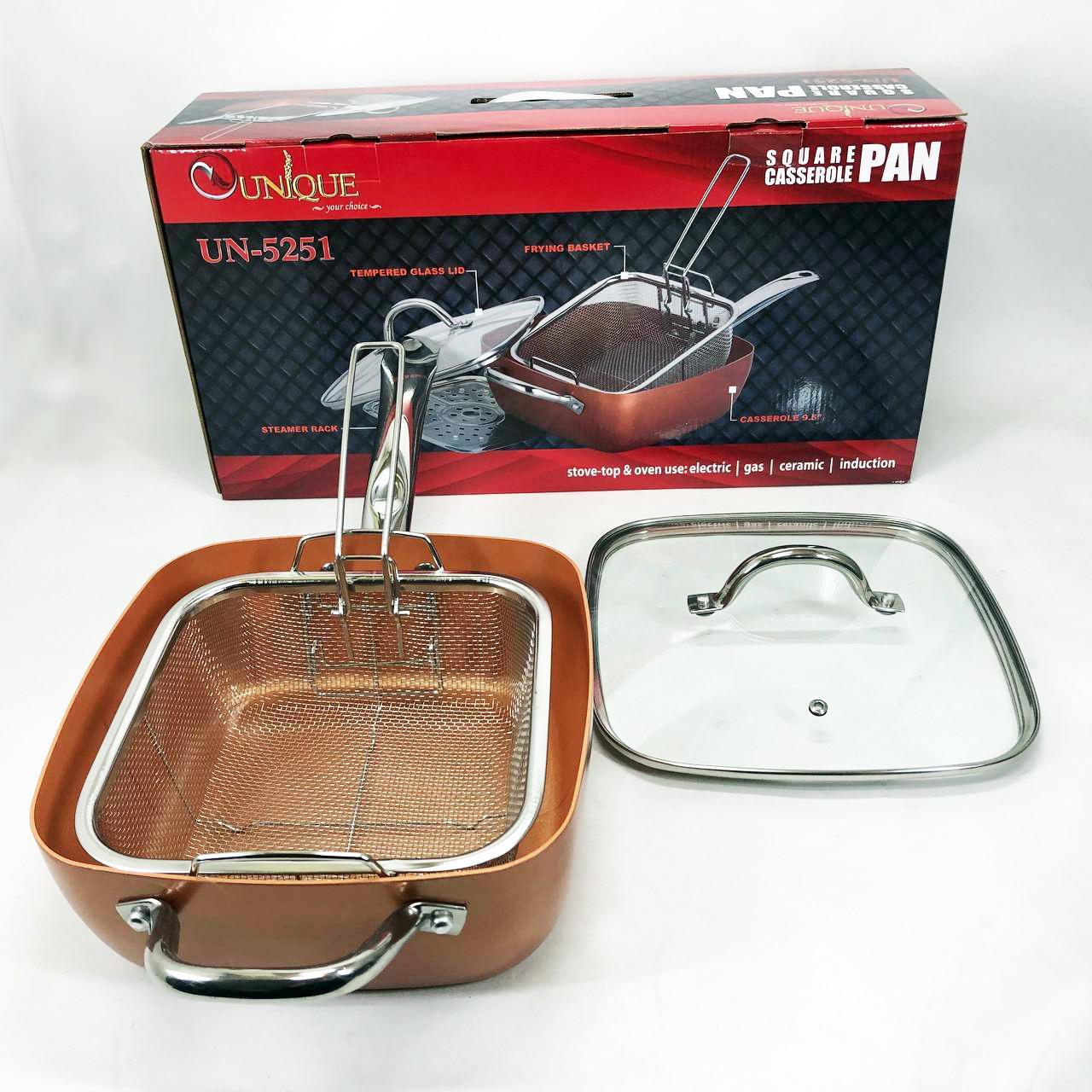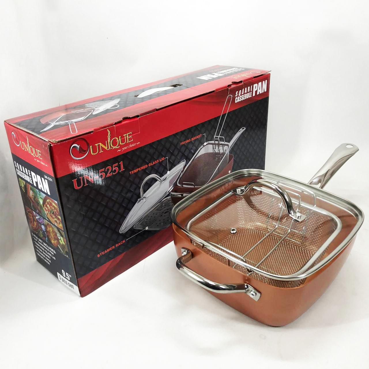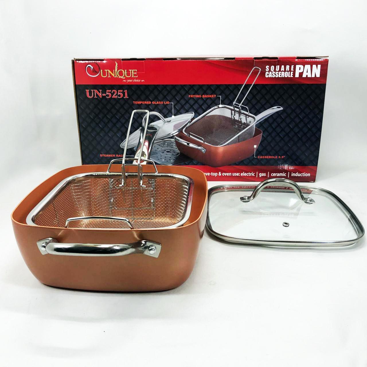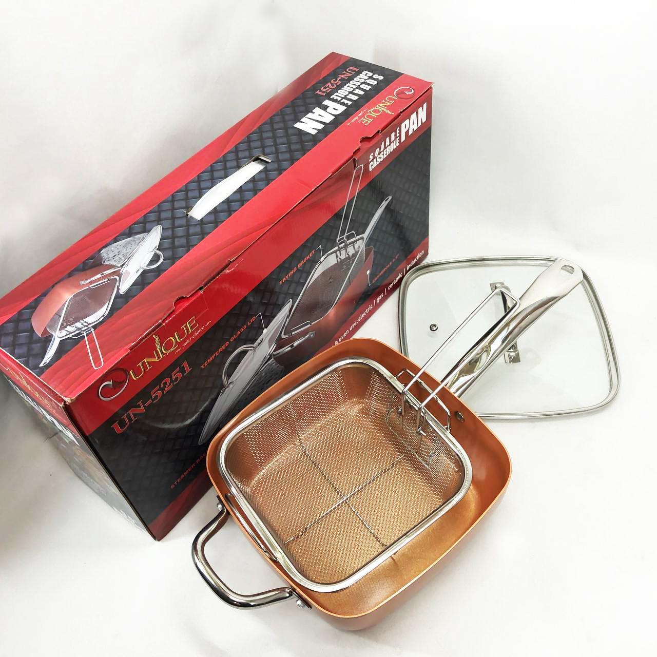 Сковорода-фритюрниця Unique UN-5251 — це справжнє технологічне диво для вашої кухні, яке здатне замінити цілий набір кухонного посуду. Завдяки глибокій квадратній формі та високим прямим стінкам, цей виріб поєднує в собі функції класичної сковороди, місткої каструлі та сотейника. Спеціальний медно-керамічний сплав Ti-Cerama створює надміцний антипригарний шар, що дозволяє смажити продукти при температурі 180°C без прилипання та використання зайвого жиру. Особливістю моделі є її універсальність: ви можете варити супи, смажити хрустку картоплю фрі, готувати здорову їжу на пару або навіть використовувати її як форму для випікання в духовці. Товсті стінки рівномірно розподіляють жар, створюючи ефект томління, що робить смак страв незабутнім.