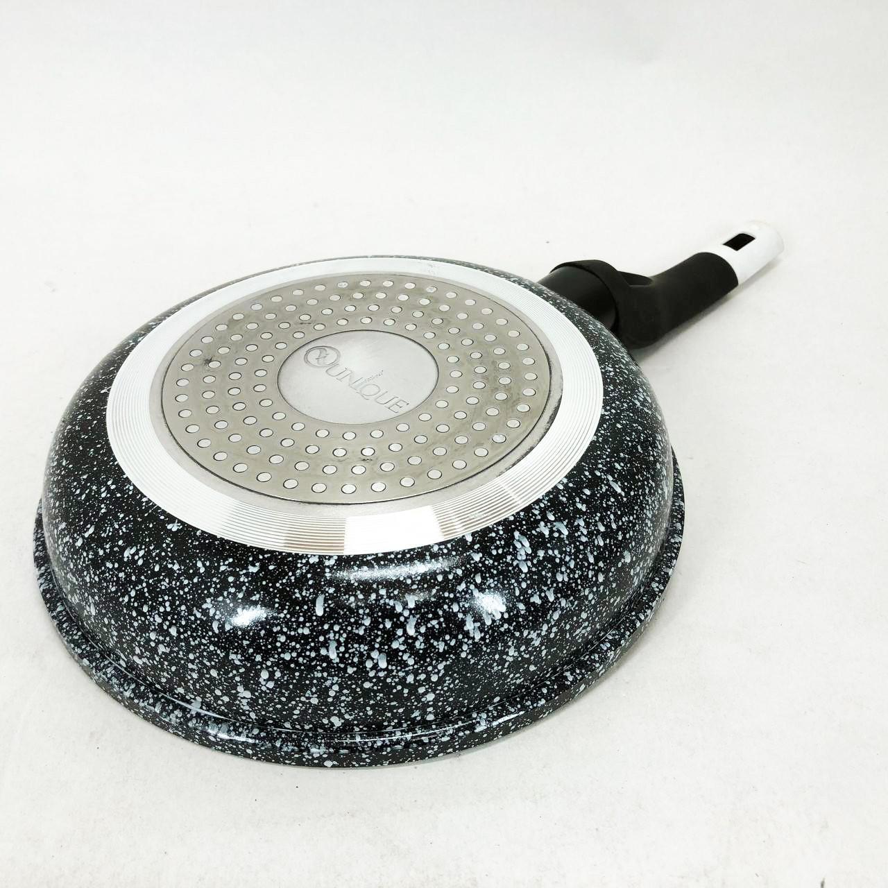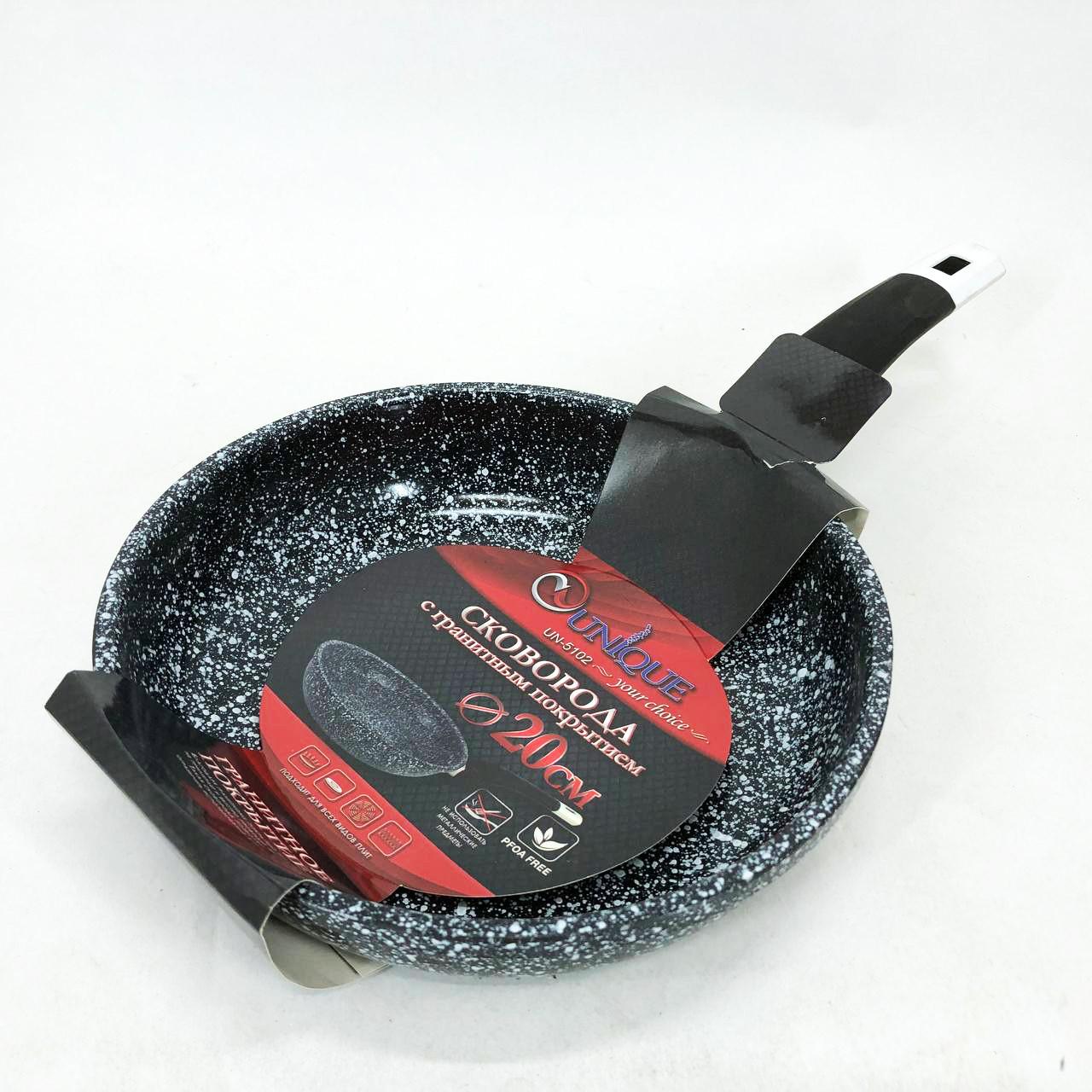 Сковорода UNIQUE Granite coating UN-5102 діаметром 20 см — це надійний вибір для щоденного приготування їжі. Виготовлена з литого алюмінію, вона вирізняється високою теплопровідністю та довговічністю. Головною перевагою моделі є багатошарове гранітне покриття, яке складається з декількох шарів кам’яної крихти на мінеральній основі. Таке технологічне рішення забезпечує відмінні антипригарні властивості, дозволяючи готувати корисні страви з мінімальною кількістю жиру. Нова система пористого покриття гарантує рівномірне прогрівання, завдяки чому продукти отримують апетитну хрустку скоринку, залишаючись соковитими всередині.