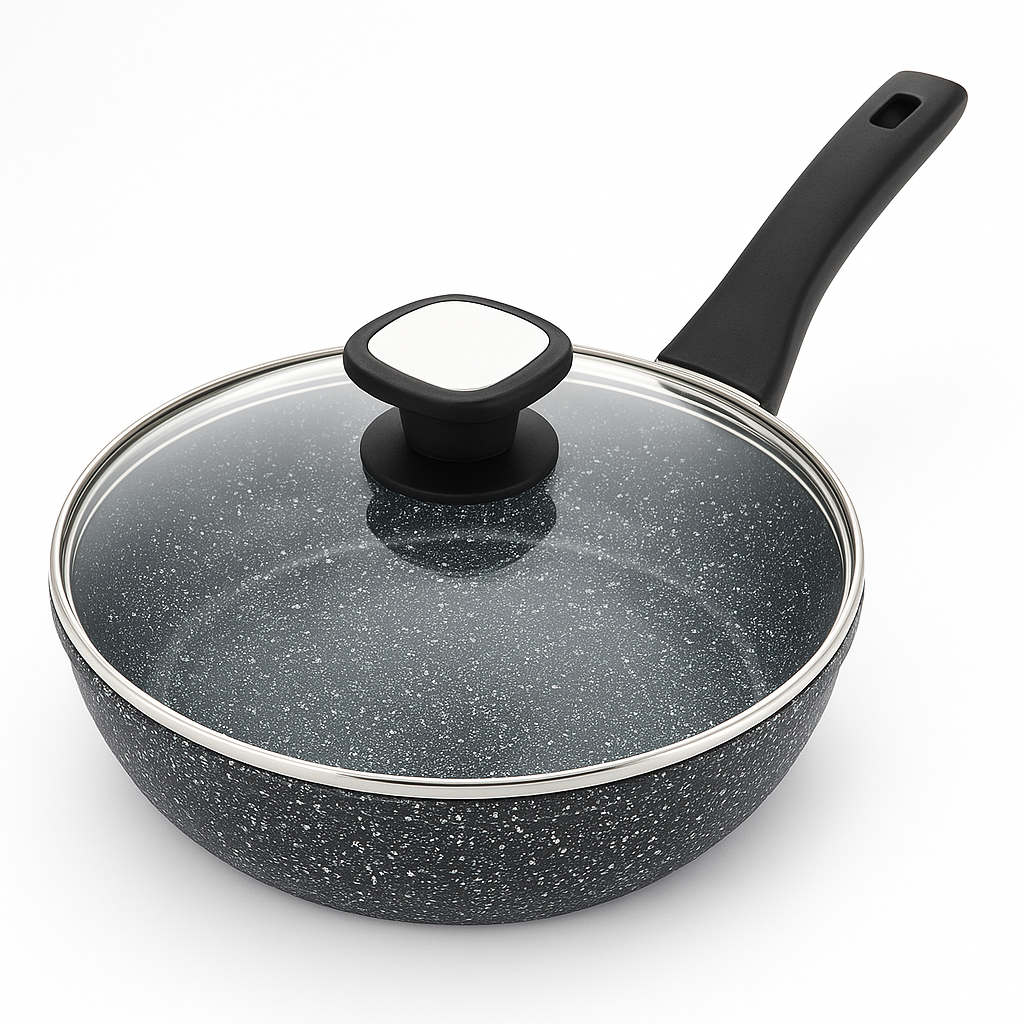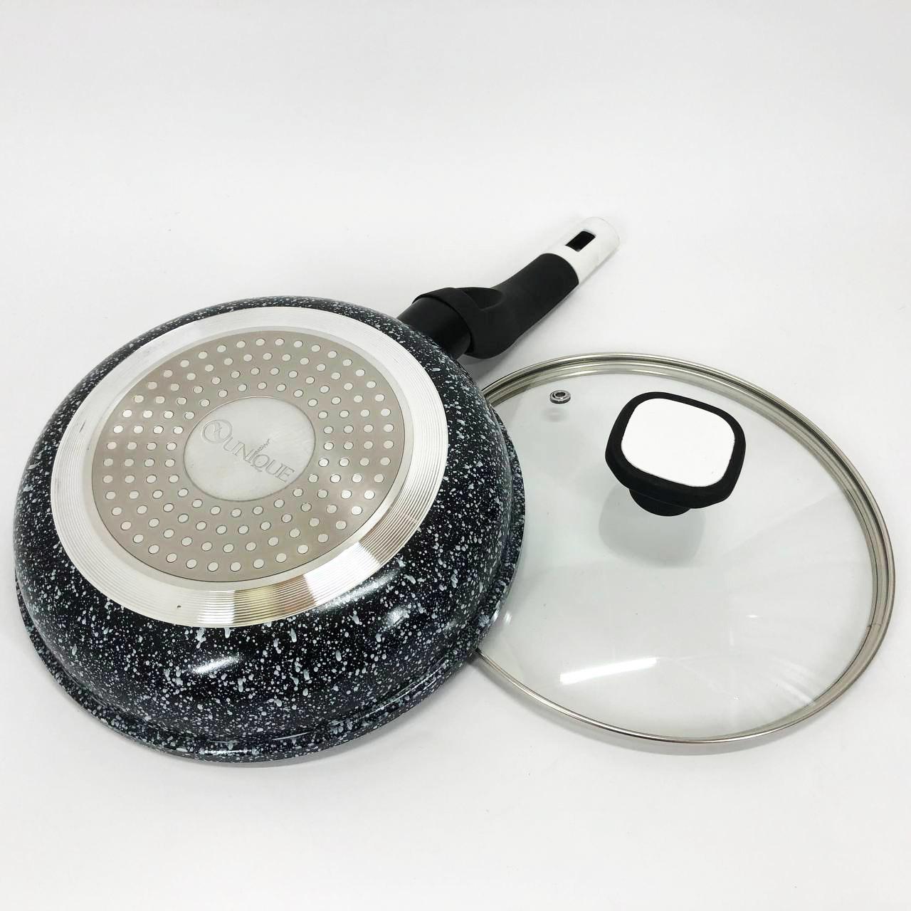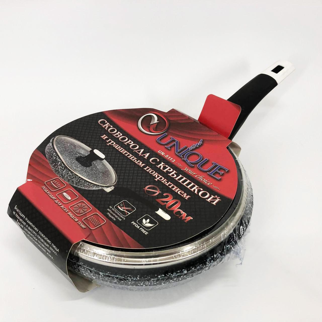 Сковорода UNIQUE Granite coating UN-5113 діаметром 20 см — це ідеальне рішення для прихильників здорового харчування. Виготовлена з високоякісного литого алюмінію, вона оснащена унікальним багатошаровим антипригарним покриттям із кам’яної крихти. Головна особливість цієї моделі — двостороннє нанесення гранітного шару (внутрішнє та зовнішнє), що не тільки полегшує процес смаження з мінімальною кількістю олії, але й спрощує догляд за посудом. Спеціальна пориста система покриття дозволяє отримати ідеальну хрустку скоринку, зберігаючи корисні властивості продуктів. Потовщене дно гарантує швидке нагрівання та високу стійкість до корозії та деформацій.