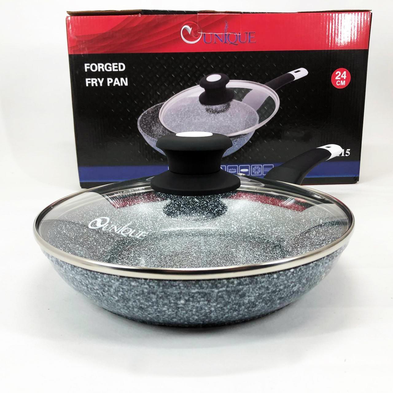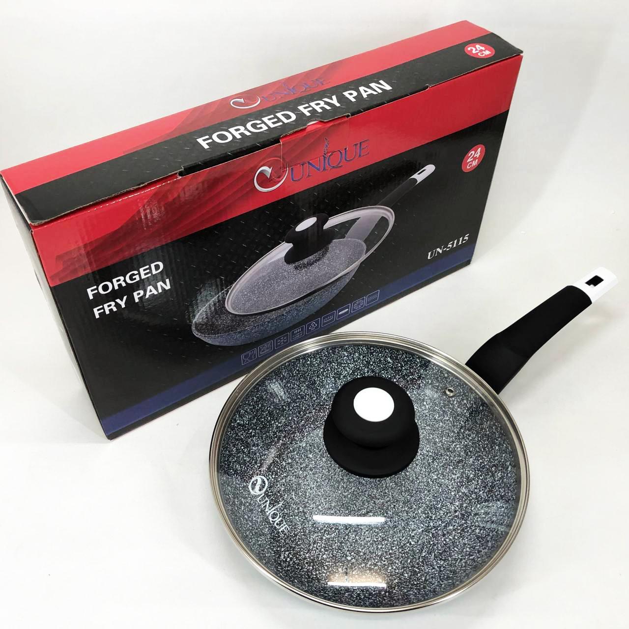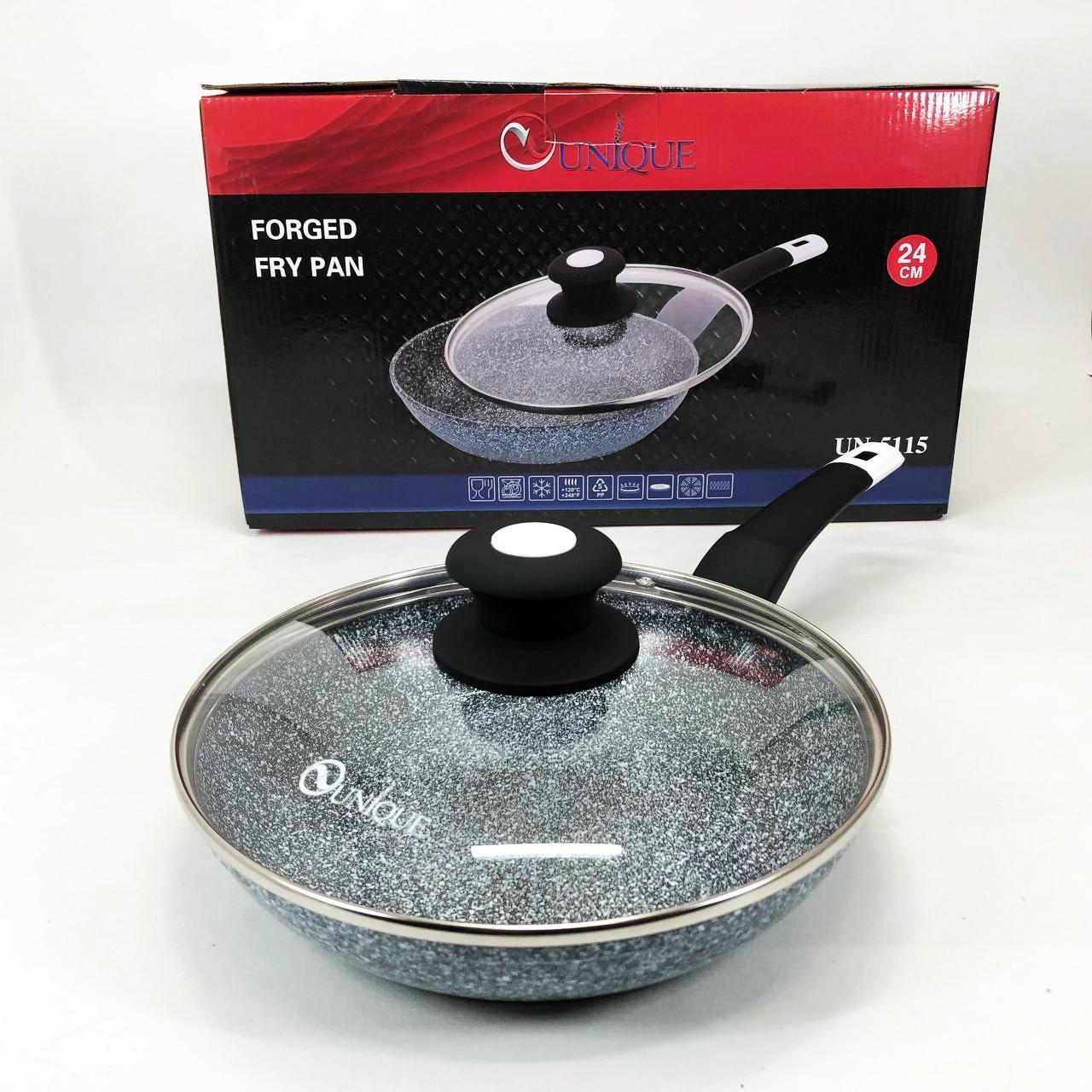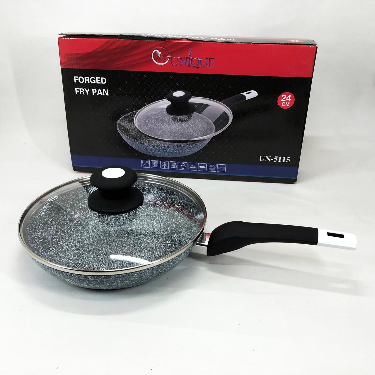 Сковорода UNIQUE UN-5115 діаметром 24 см — це універсальне рішення для сучасної кухні, яке поєднує в собі міжнародні стандарти якості та передові технології. Виготовлена з міцного алюмінію, вона оснащена багатошаровим гранітним покриттям, де частинки каменю значно підсилюють захисні властивості антипригарного шару. Завдяки новій системі пористої поверхні, продукти просмажуються рівномірно, дозволяючи досягти апетитної золотистої скоринки без зайвих зусиль. Виріб відрізняється високою енергоефективністю, швидким нагріванням та повною безпекою для здоров’я, що робить його ідеальним вибором для щоденного приготування корисних страв.