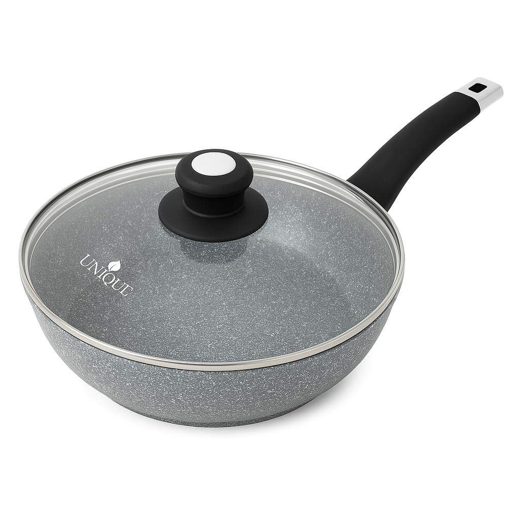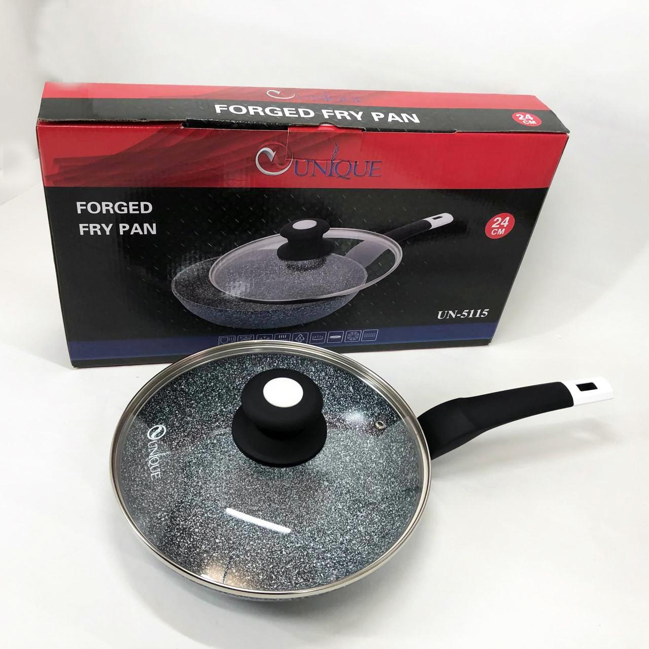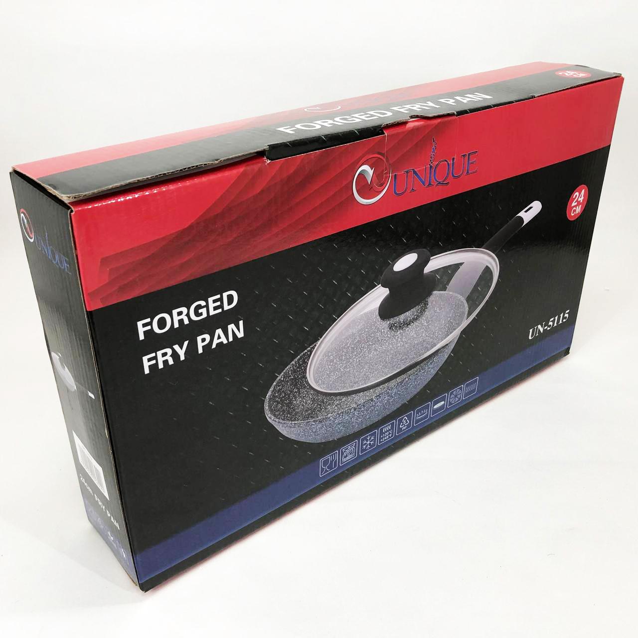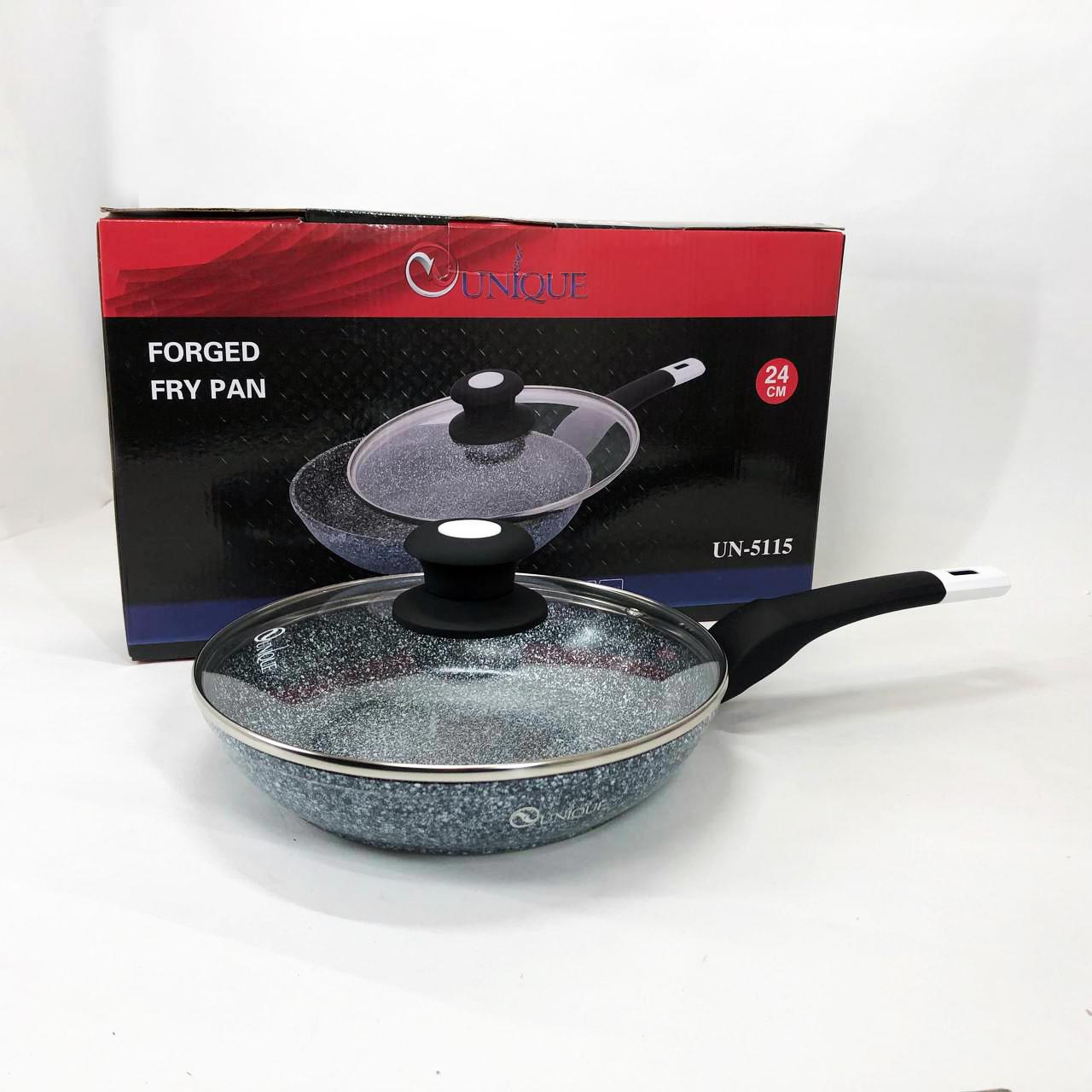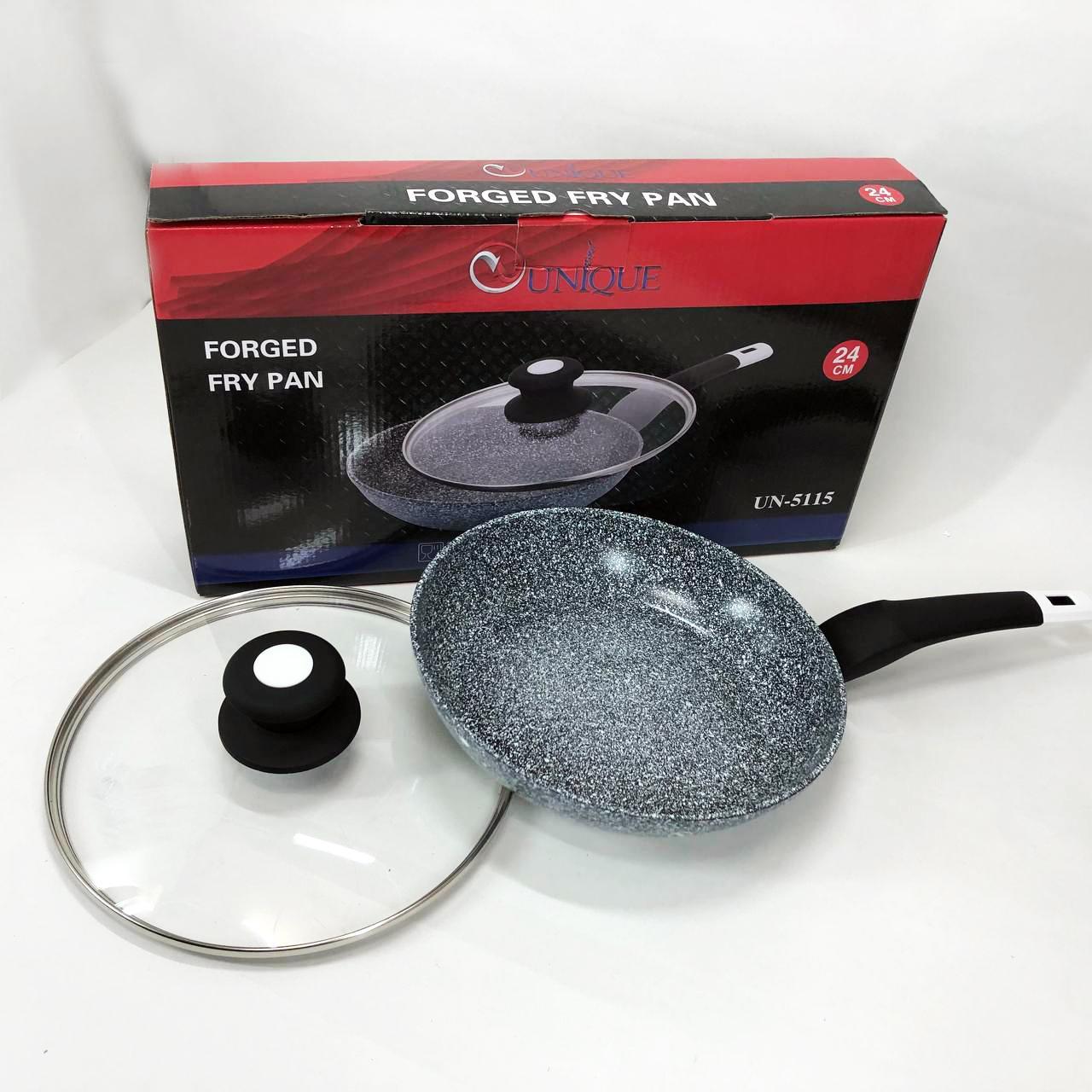 Сковорода UNIQUE UN-5115 діаметром 24 см — це універсальне рішення для сучасної кухні, яке поєднує в собі міжнародні стандарти якості та передові технології. Виготовлена з міцного алюмінію, вона оснащена багатошаровим гранітним покриттям, де частинки каменю значно підсилюють захисні властивості антипригарного шару. Завдяки новій системі пористої поверхні, продукти просмажуються рівномірно, дозволяючи досягти апетитної золотистої скоринки без зайвих зусиль. Виріб відрізняється високою енергоефективністю, швидким нагріванням та повною безпекою для здоров’я, що робить його ідеальним вибором для щоденного приготування корисних страв.