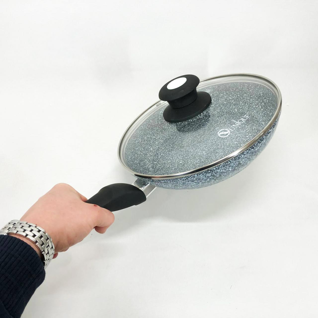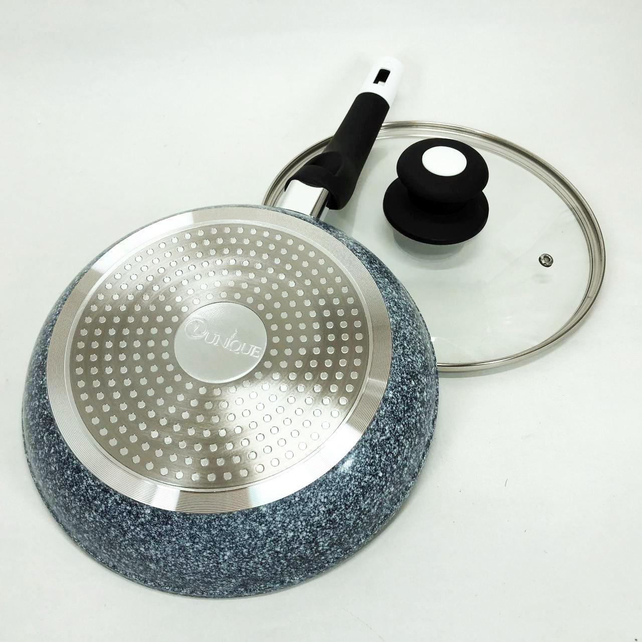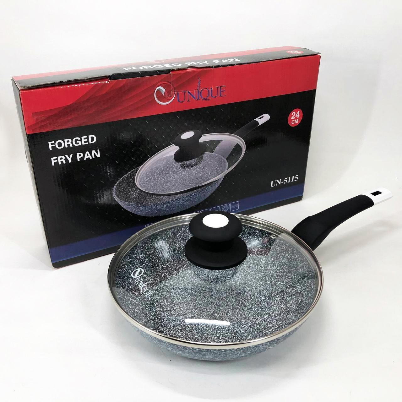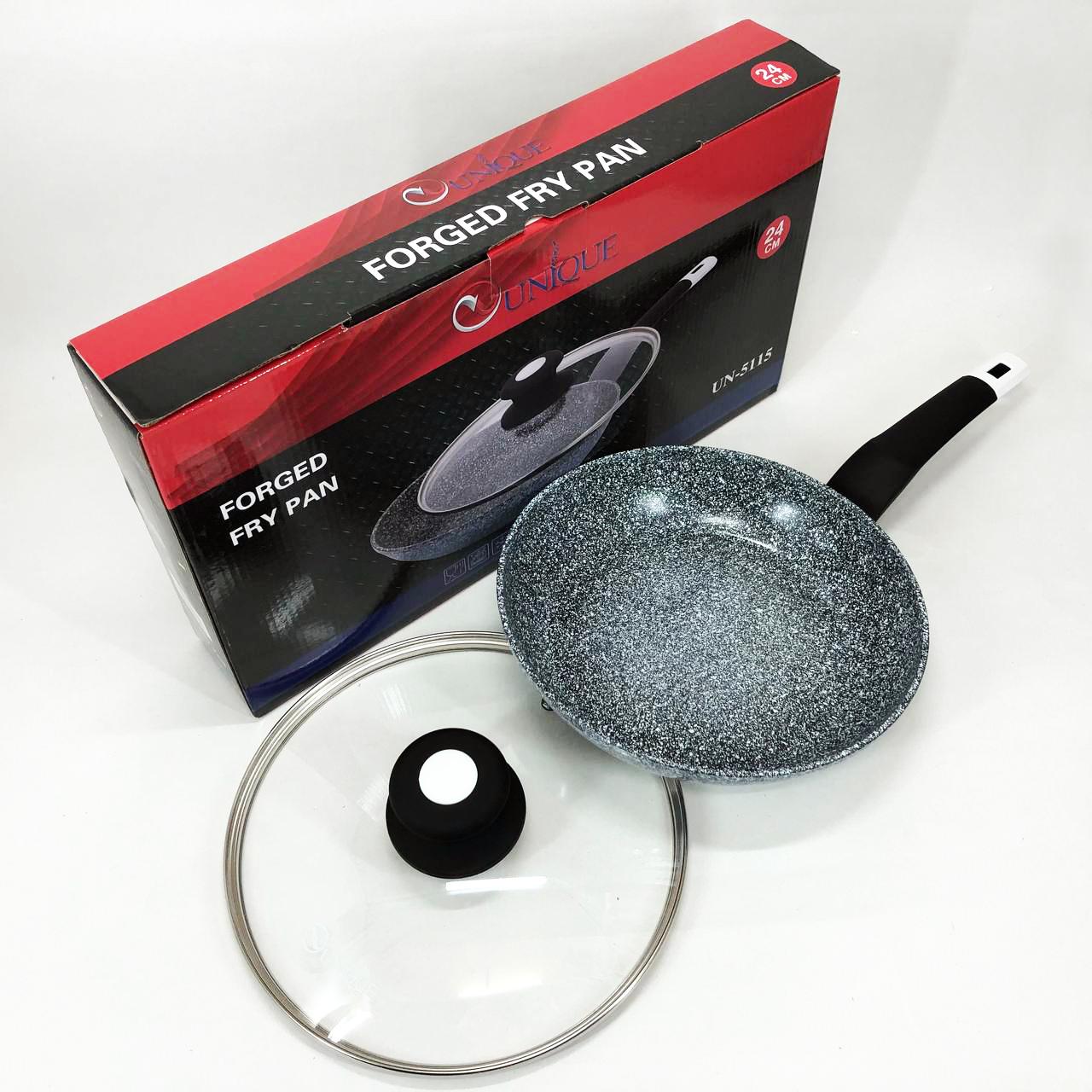 Сковорода UNIQUE UN-5115 діаметром 24 см — це універсальне рішення для сучасної кухні, яке поєднує в собі міжнародні стандарти якості та передові технології. Виготовлена з міцного алюмінію, вона оснащена багатошаровим гранітним покриттям, де частинки каменю значно підсилюють захисні властивості антипригарного шару. Завдяки новій системі пористої поверхні, продукти просмажуються рівномірно, дозволяючи досягти апетитної золотистої скоринки без зайвих зусиль. Виріб відрізняється високою енергоефективністю, швидким нагріванням та повною безпекою для здоров’я, що робить його ідеальним вибором для щоденного приготування корисних страв.
