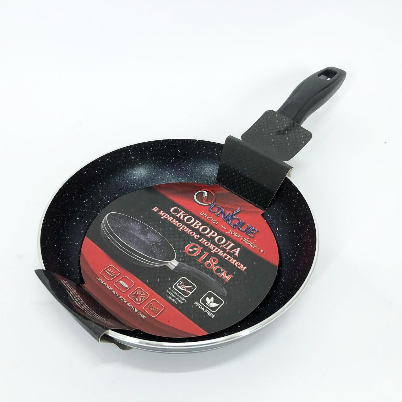 Сковорода UNIQUE UN-5151 діаметром 18 см — це компактний та надійний помічник для приготування сніданків та невеликих порцій їжі. Виготовлена з високоякісного литого алюмінію, вона оснащена інноваційним багатошаровим мармуровим покриттям на мінеральній основі. Спеціальна система пористої поверхні дозволяє досягти ідеальної хрусткої скоринки при використанні мінімальної кількості олії, що робить цей посуд ідеальним для здорового харчування. Обтяжене дно гарантує швидкий та рівномірний розподіл тепла по всій площі, запобігаючи перегріву окремих ділянок. Завдяки двосторонньому нанесенню антипригарного шару, сковорода легко очищується як всередині, так і зовні, зберігаючи свій первісний вигляд протягом тривалого часу.