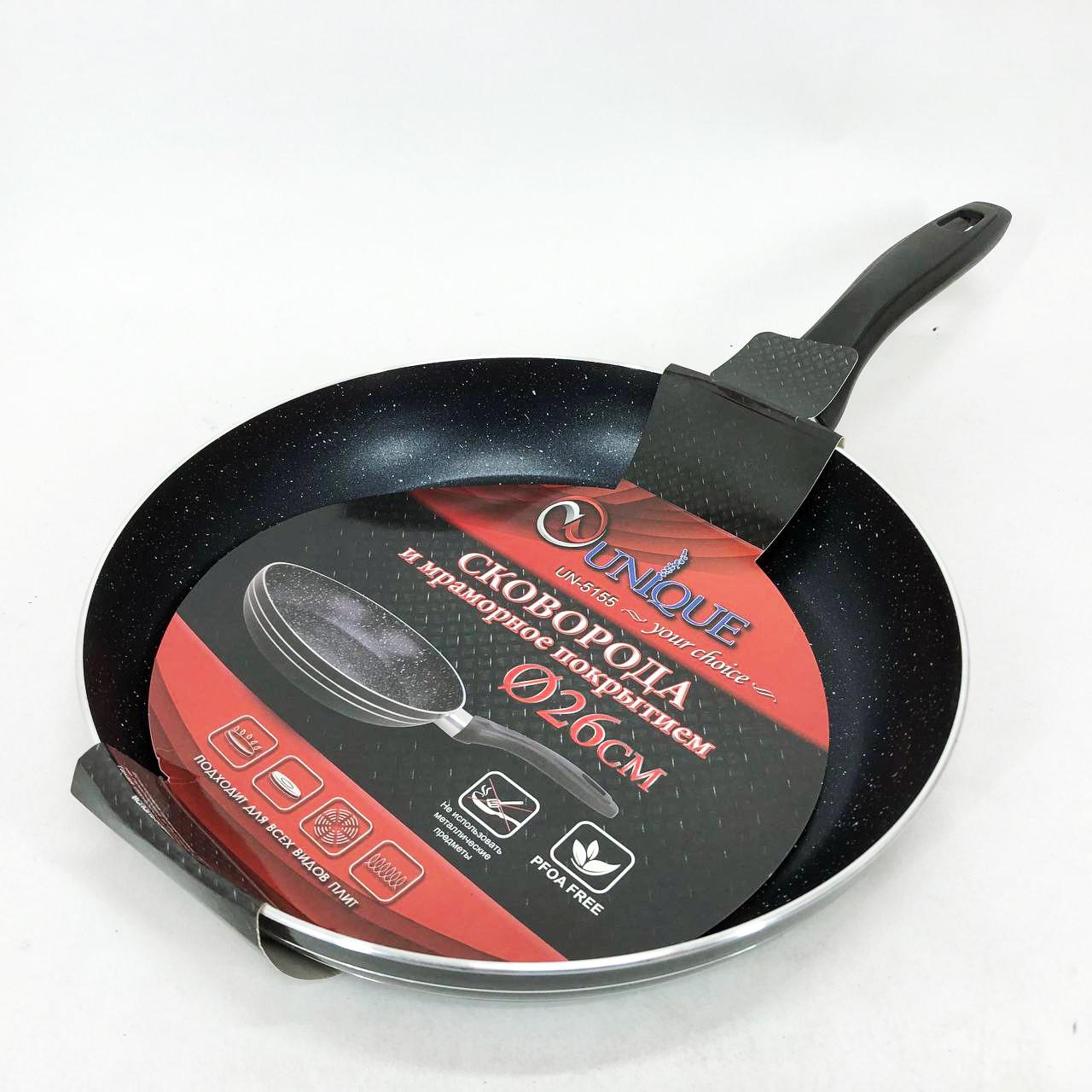 Сковорода UNIQUE UN-5155 діаметром 26 см розроблена для забезпечення максимально ефективного та комфортного процесу приготування на вашій кухні. Корпус із високоякісного алюмінію гарантує оптимальну теплопровідність, що дозволяє уникнути появи “гарячих точок” та забезпечує рівномірне просмажування продуктів. Головною перевагою моделі є мармурове антипригарне покриття, яке відрізняється високою зносостійкістю та дозволяє продуктам легко відлипати від поверхні. Завдяки моментальному нагріву дна, ви значно економите час та енергію, отримуючи при цьому страви з апетитною скоринкою та збереженою соковитістю всередині.