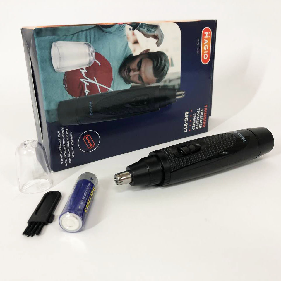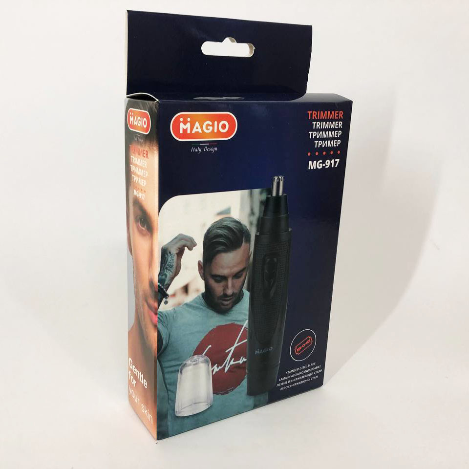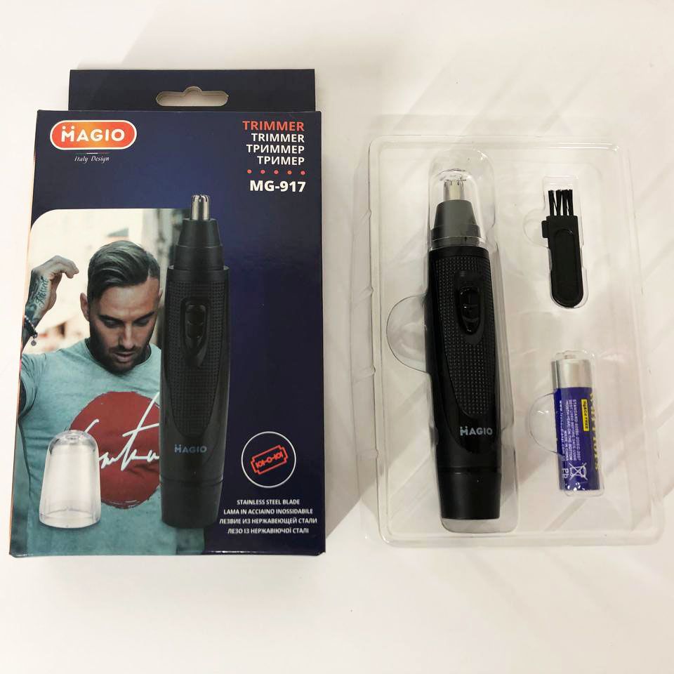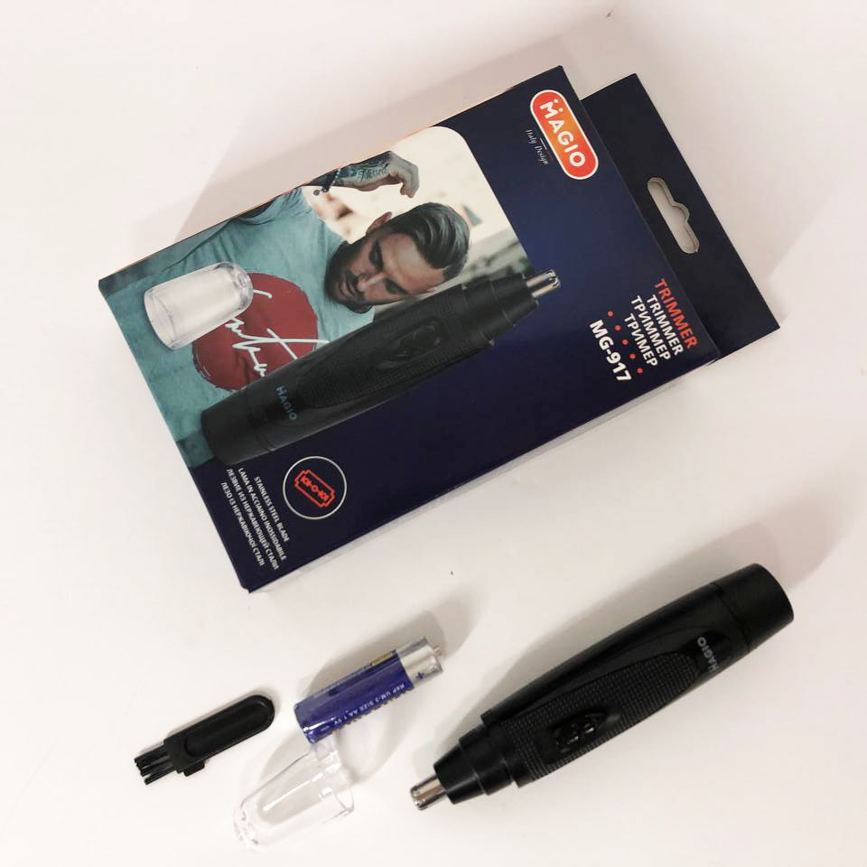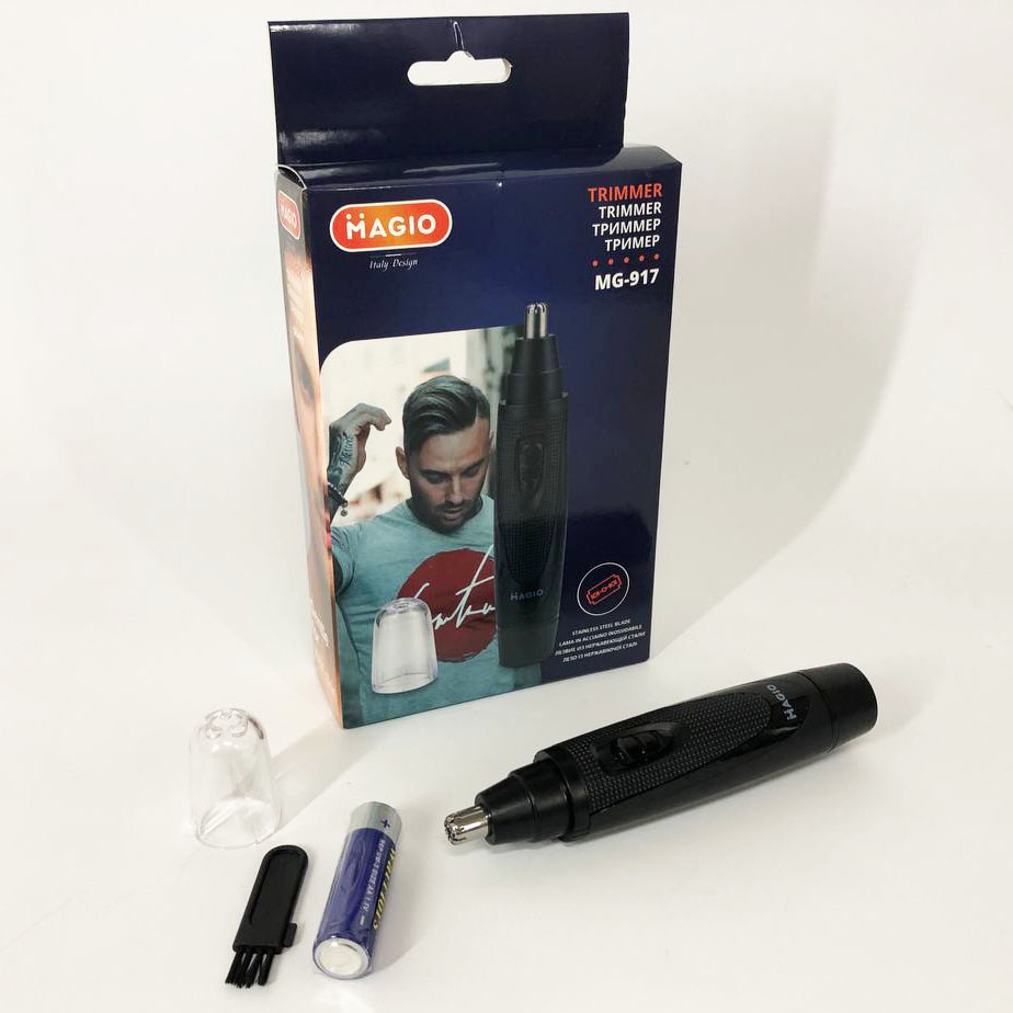 Завдяки триммеру MG-917 ви абсолютно безболісно і безпечно зможете видалити волосся у носі та вухах. Тример обтічної форми, має головку, що обертається, і вузький носик. Лезо виконане з нержавіючої сталі. Це важлива деталь будь-якого тримера, від якої залежить як безпека видалення волосся з вух та носа, так і комфорт. Тример зручний, добре сидить у руці. Завдяки комфортній ручці він не ковзає, що призводить до травмування практично до нуля. Працює прилад від однієї пальчикової батареї. Якщо потрібно змінити батарейку, то це легко зробити, провернувши корпус, і відкривши його. Лезо після використання можна чистити за допомогою щіточки, яка йде в комплекті. Добре продумано, тому що лезо залишається чистим. Прилад компактний та багато місця не займає.